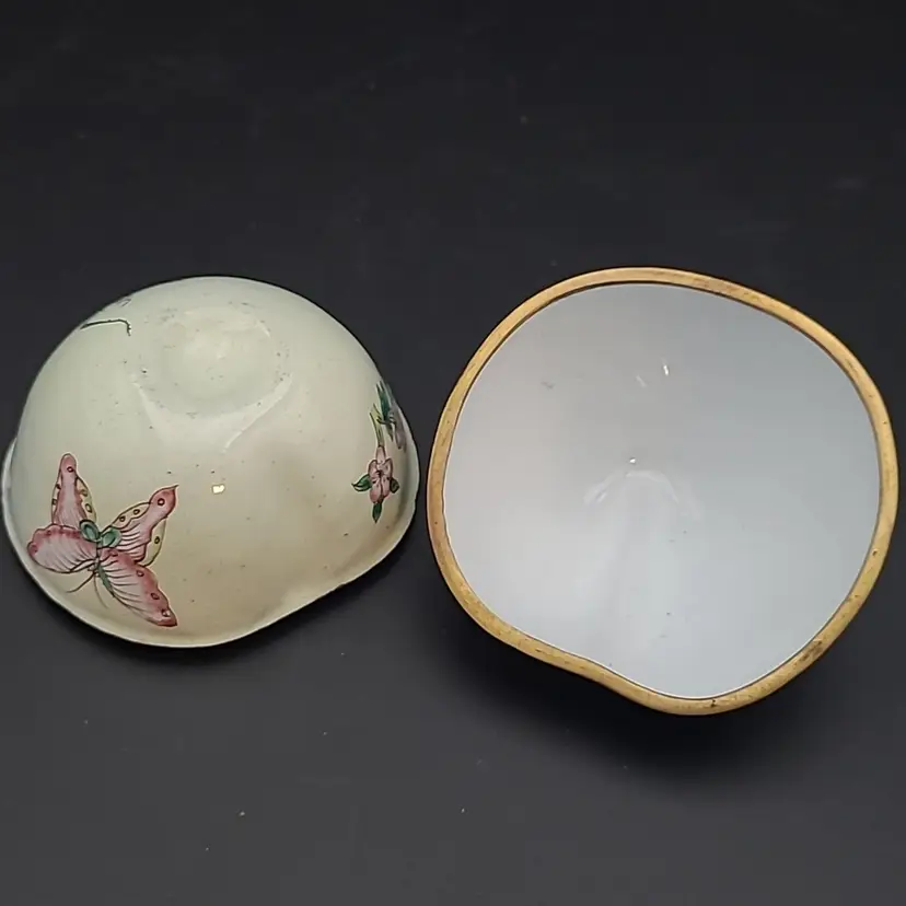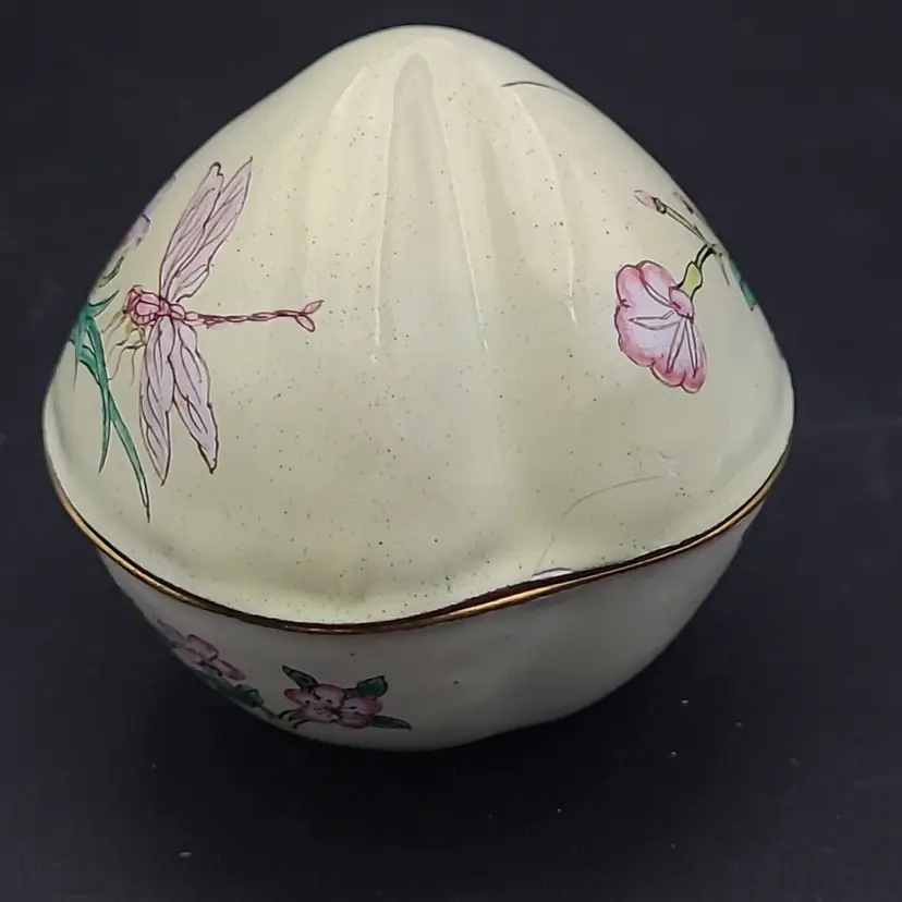 Design: Peach-shaped with a lift-off lid, decorated with dragonflies and flowers