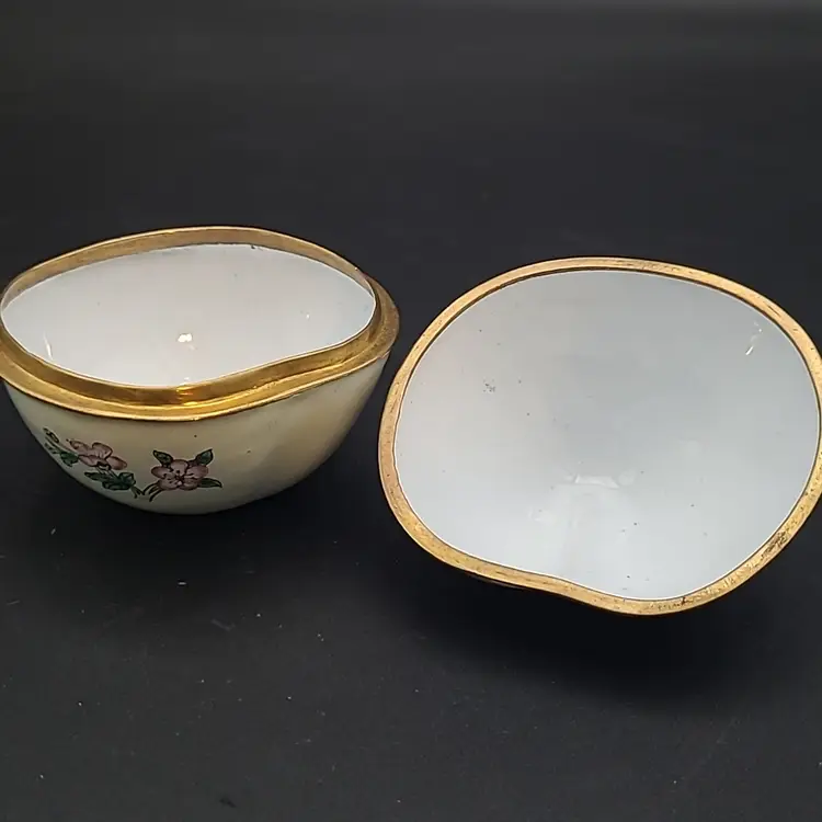 The item is an early 20th-century Chinese Canton enamel box with a lid. It is made of enamel on metal, possibly copper.