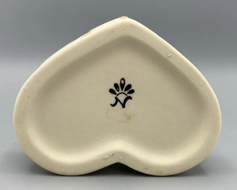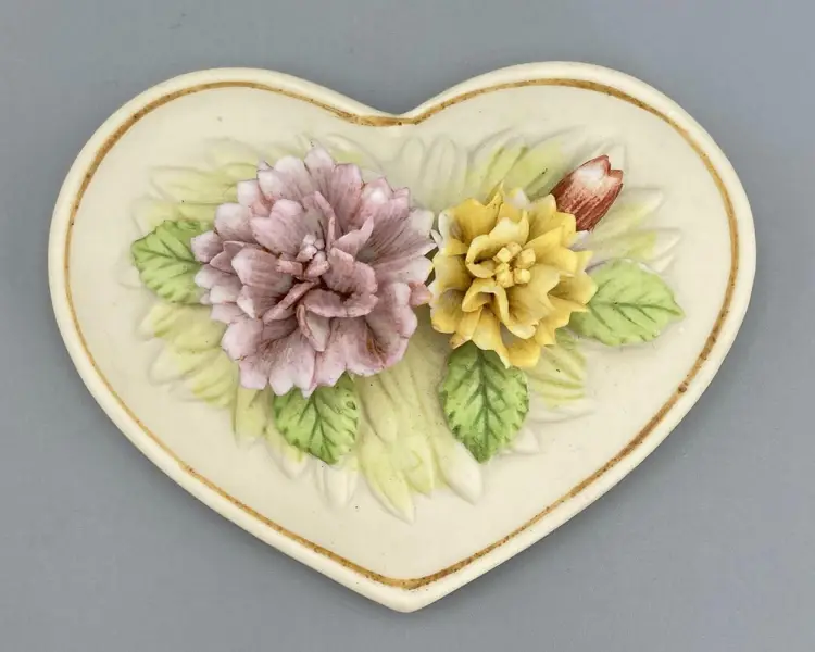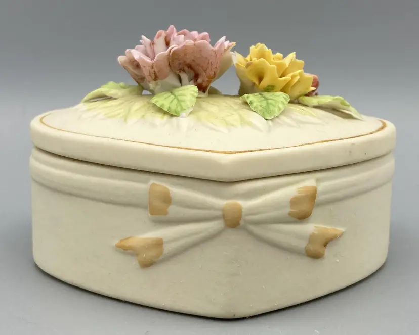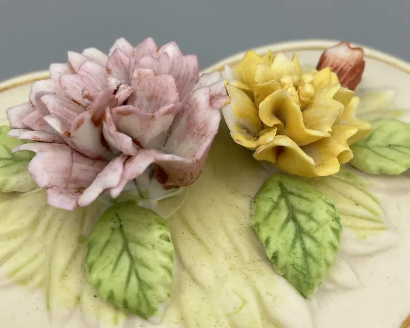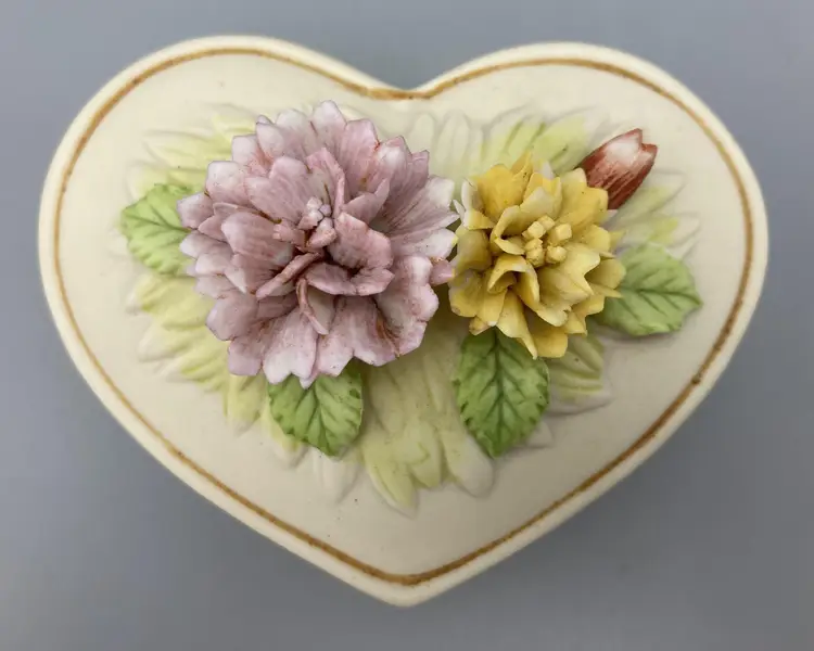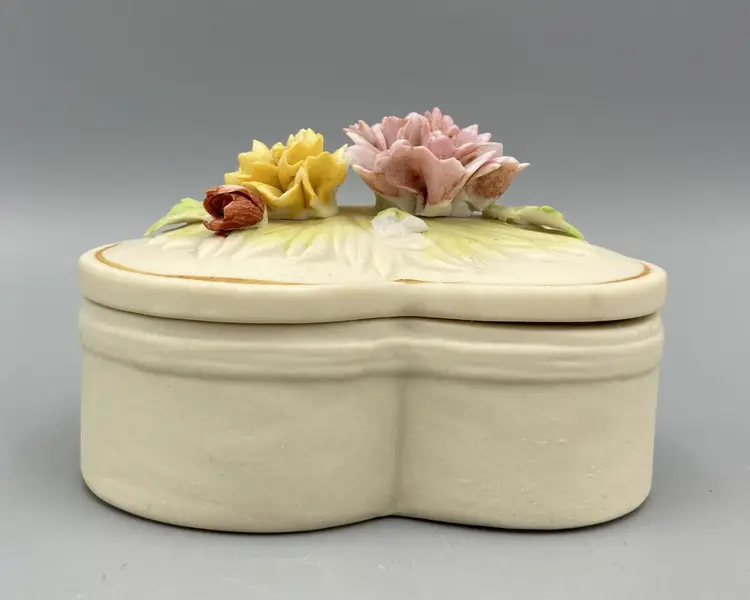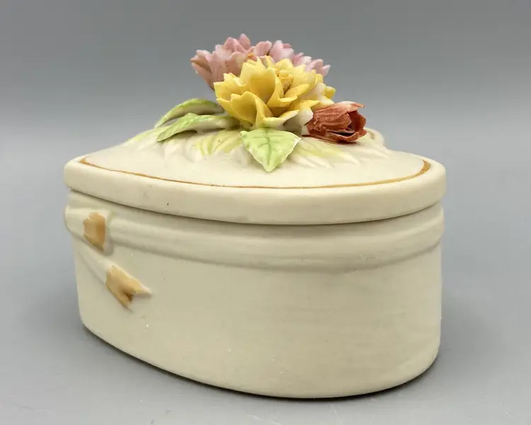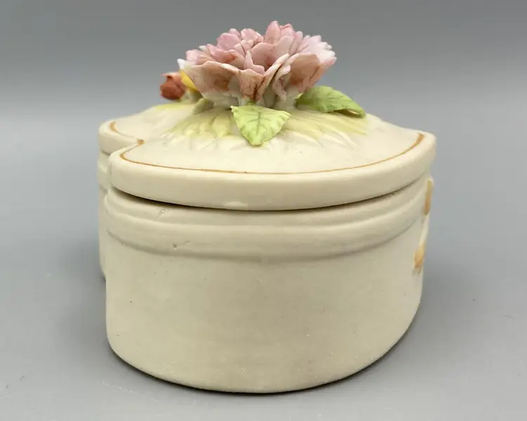 This trinket box is in good used condition, there is one chip on the back of the flowers where a leaf is chipped, visible in pictures. This box measures approximately 3 1/2" wide x 2 3/4" x 2 1/4" tall.