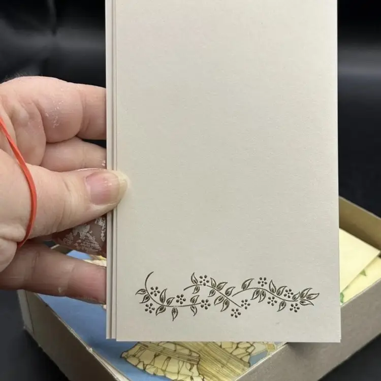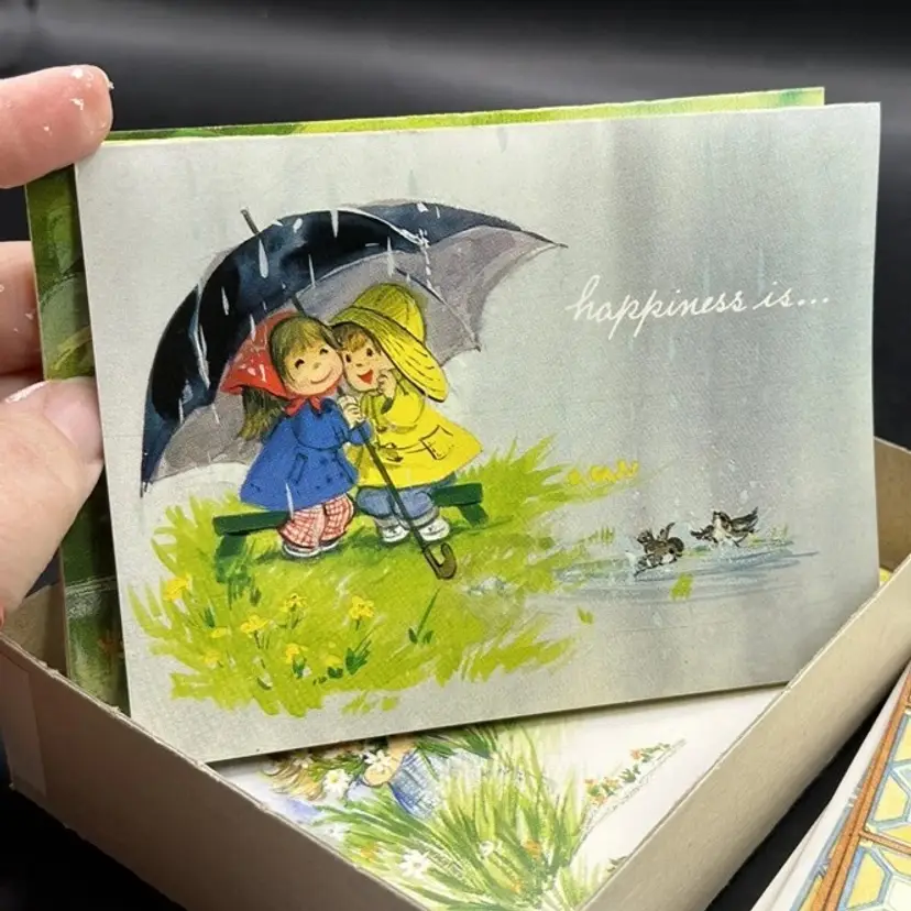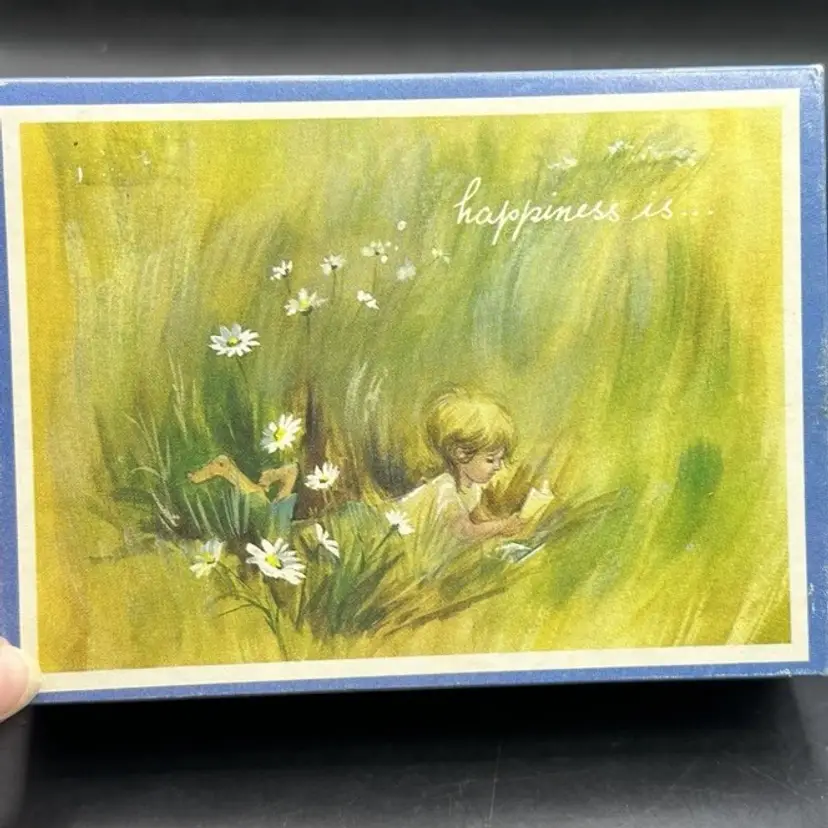 Add a touch of nostalgia to your card collection with these vintage greeting cards featuring the phrase "Happiness is." Each card comes with its own matching envelope, making them perfect for sending a heartfelt note to a loved one. The charming designs and unique style of these cards are sure to bring a smile to anyone's face. Whether you're a collector or just looking for a special way to show someone you care, these vintage cards are the perfect choice.