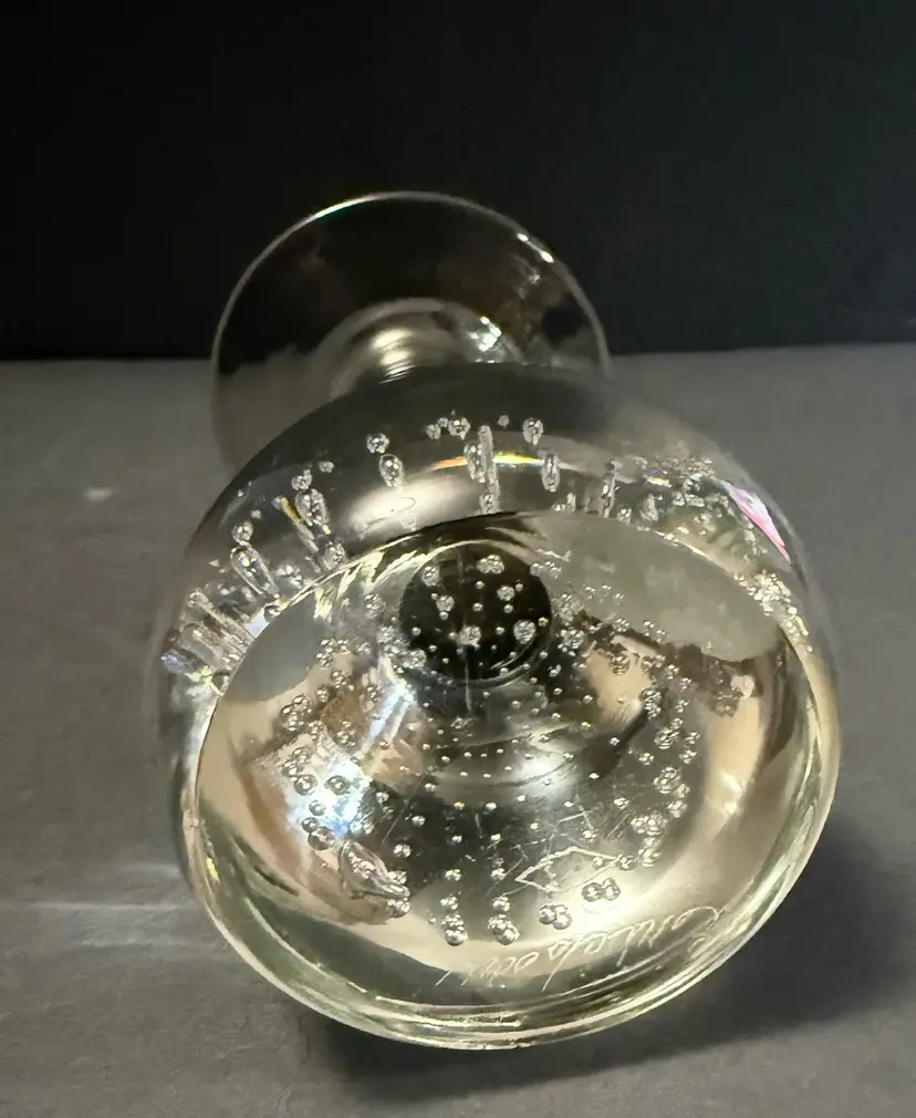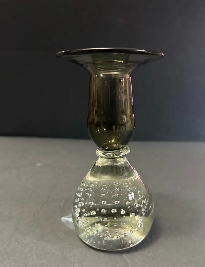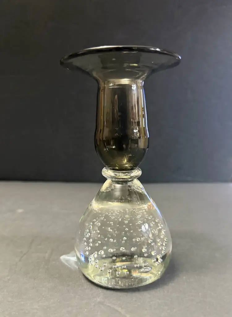 The Blenko Glass Carl Erickson Smoke Controlled Bubble Candlestick Holder is a medium-sized, glossy finish candle holder made of glass. Featuring a unique controlled bubble pattern in a smoke clear color, this Mid-Century Modern piece is suitable for all occasions and tapered candles. Produced in the United States during the 1970s, this candle holder embodies the style of Mid-Century Modernism and is a perfect addition for collectors or those looking to add a retro touch to their home decor.