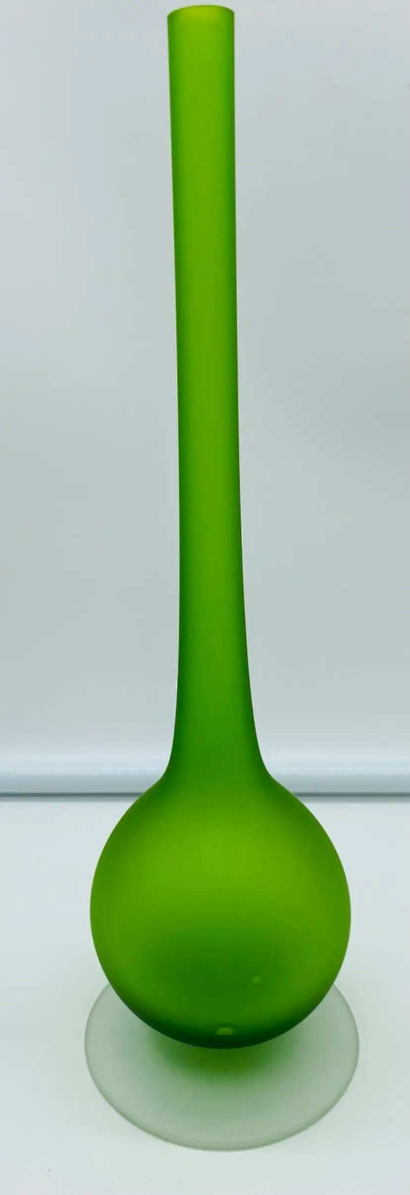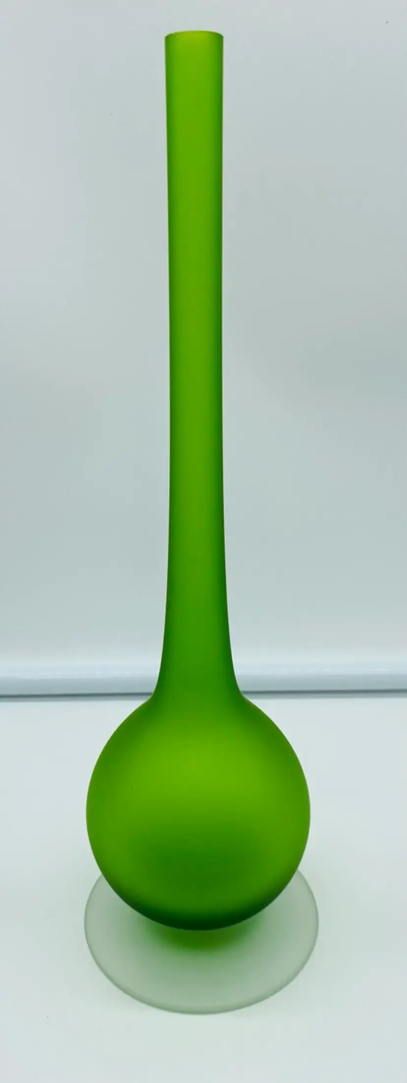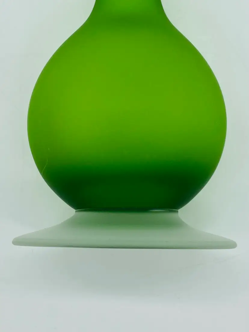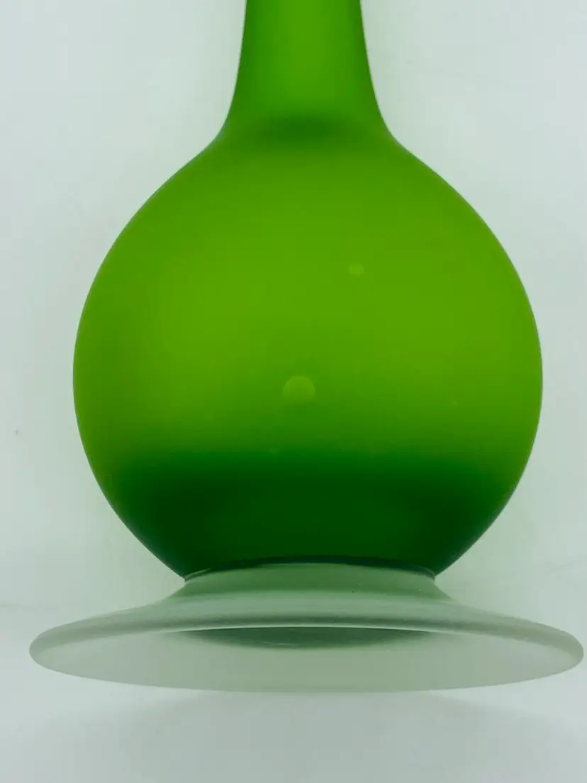 This is in very good condition. There are no chips or cracks. There is a small mark on the middle of the base. It is 10" tall and 2-3/4" at the widest point. It has a clear Satin pedestal base.
