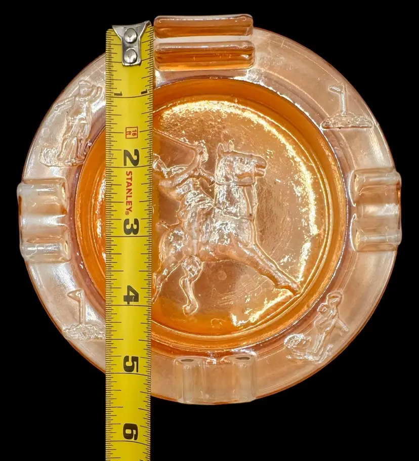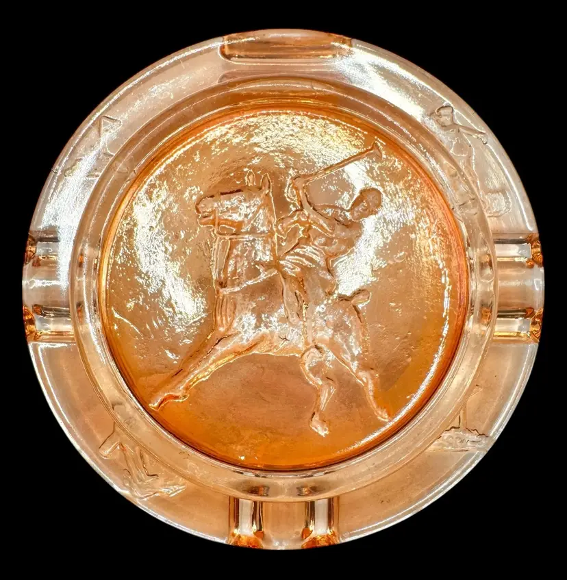 Carnival glass ashtray with built in matchbook holder. It depicts a man on a horse playing polo.