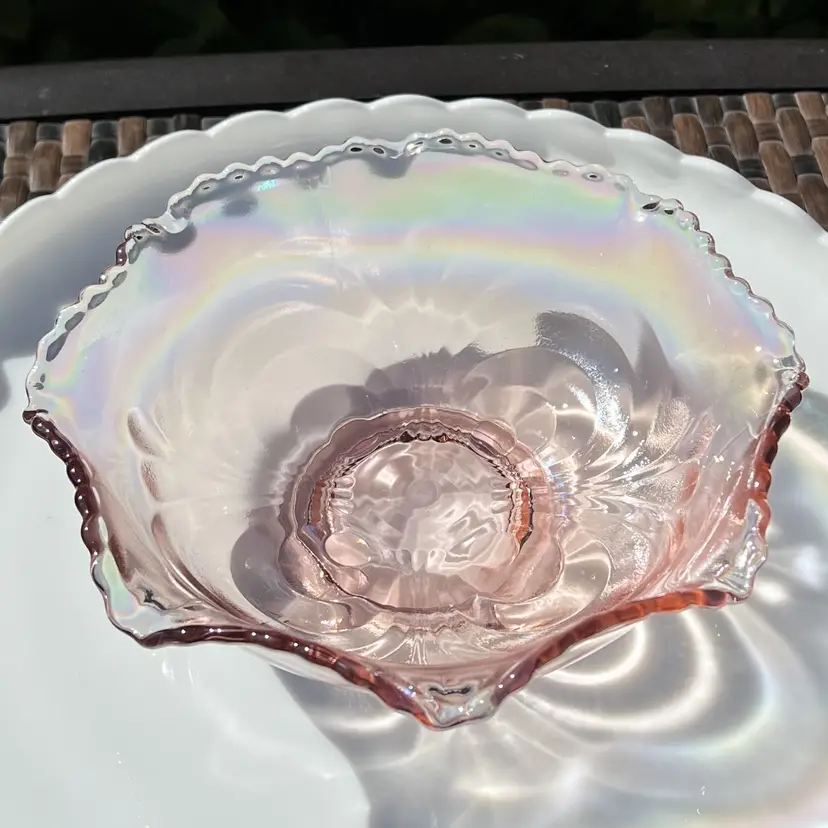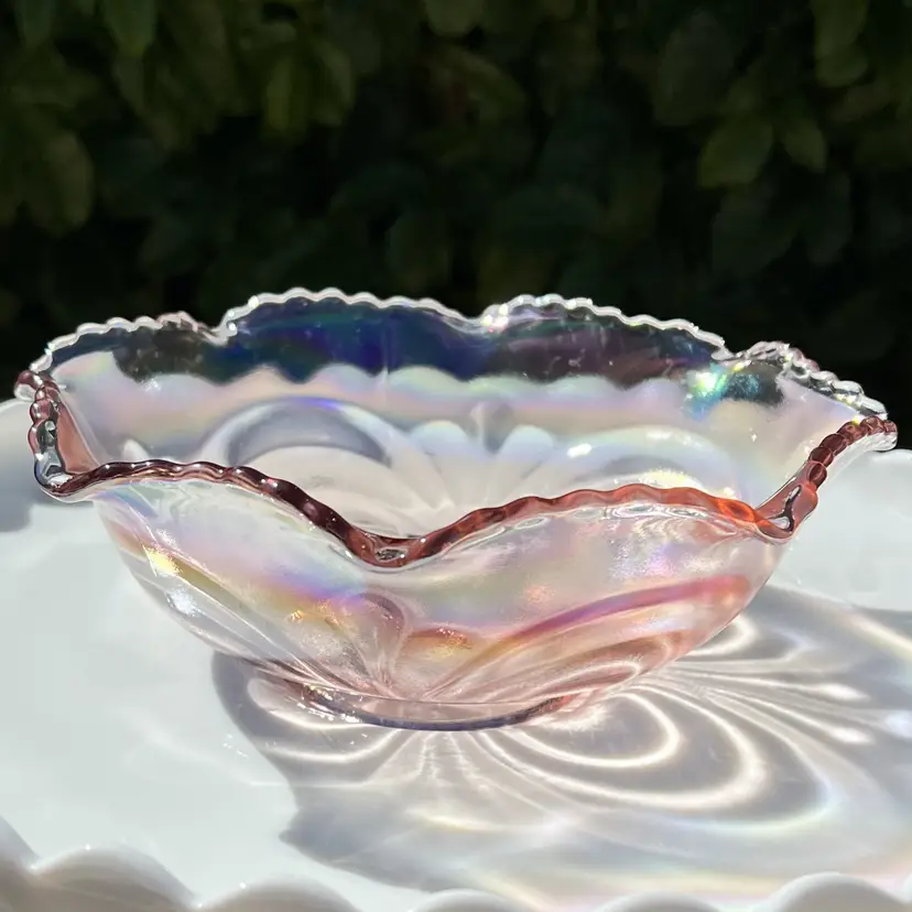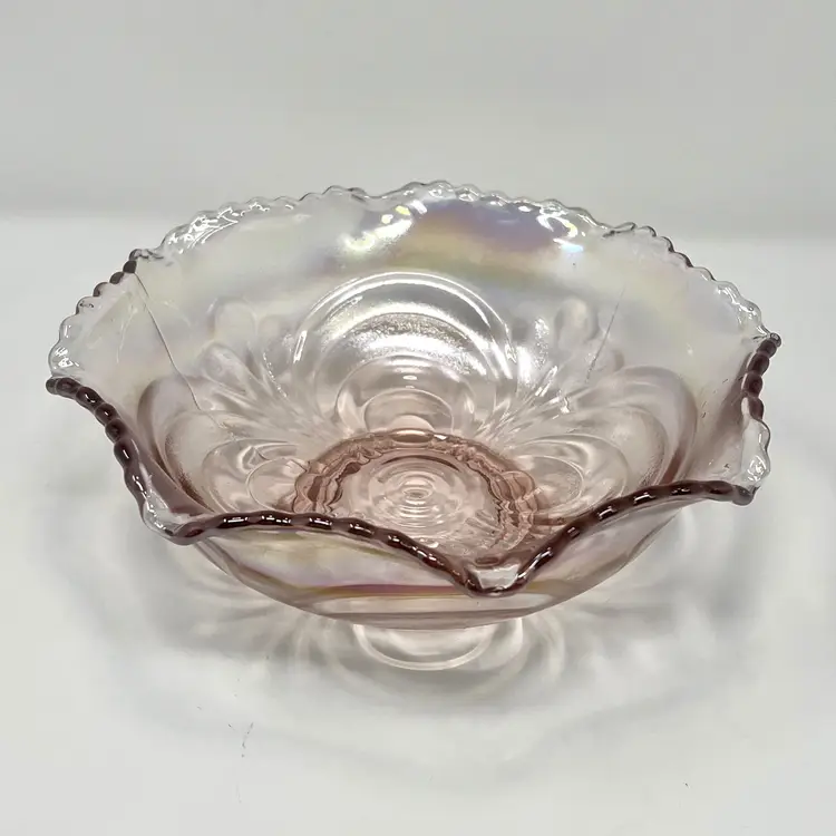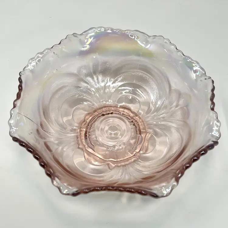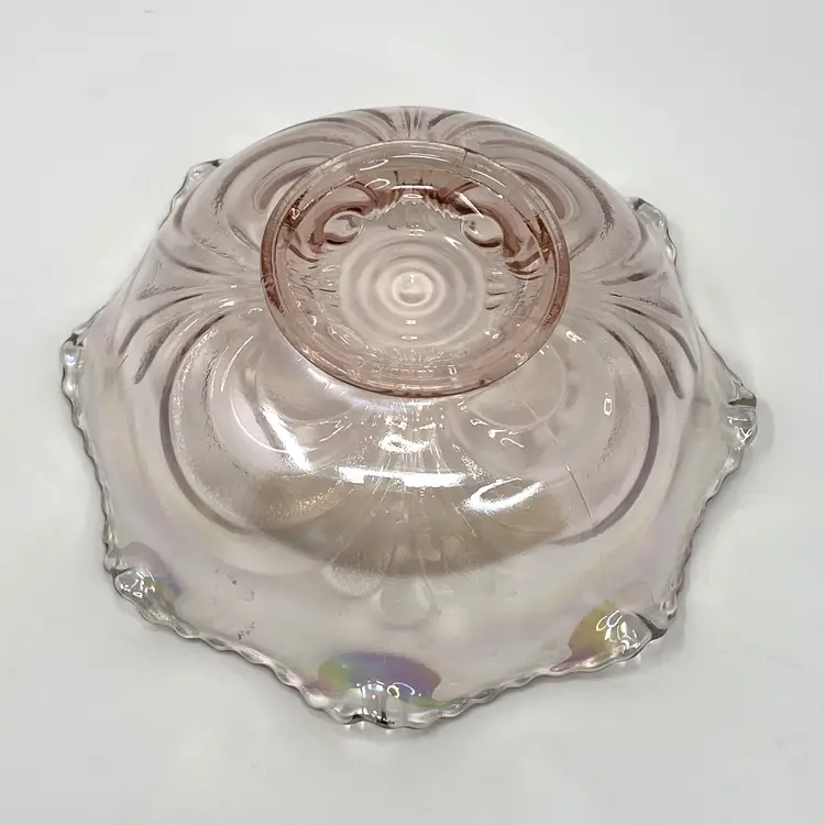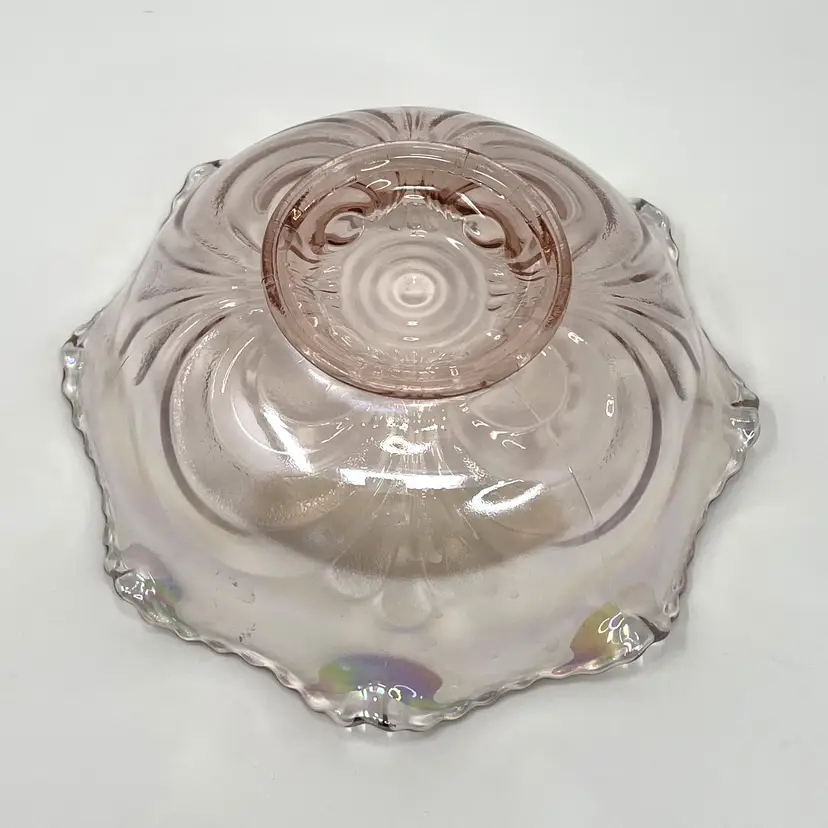 DETAILS: • Manufacturer: Imperial Glass (Lenox ownership era) • Design / Pattern: Scroll embossed crimped bowl • Pattern Number: 42686 • Markings: LIG mark (Lenox Imperial Glass, used 1973–1981) • Country of Origin / Where manufactured: Bellaire, Ohio, USA • Date/Era: 1970s (Lenox era, post-1973) • Design Style: Mid-century revival of early 20th-century carnival glass • Materials: Pressed glass • Color(s): Iridescent pink • Dimensions: Height: 2.5", Diameter: 7.5", Weight: 1 lb 7 oz • Condition: Good vintage condition overall; no chips or cracks noted in photos, but some light surface wear from age.