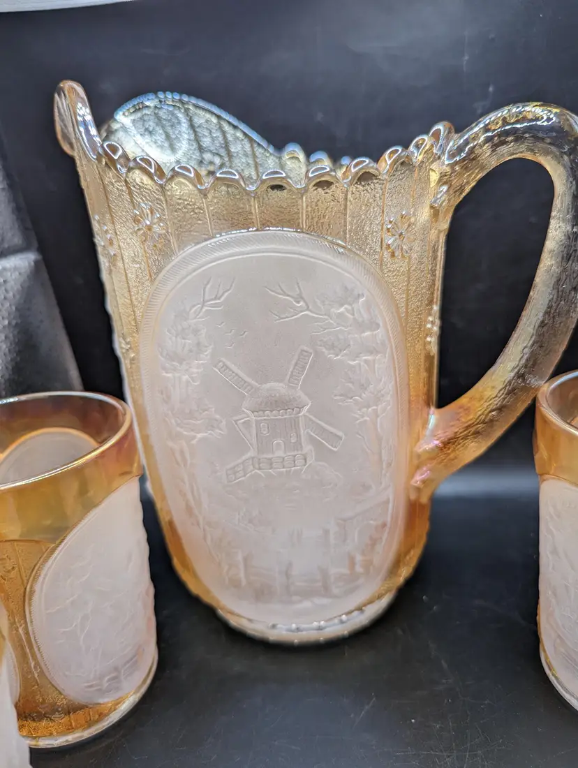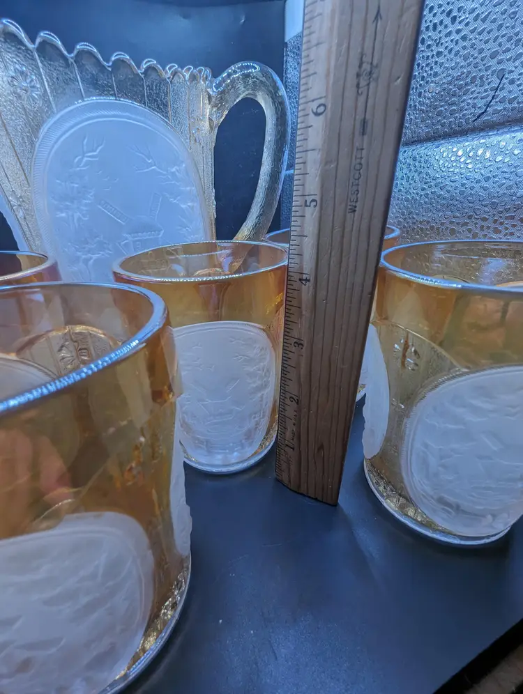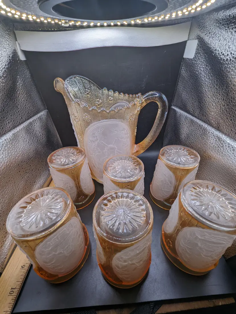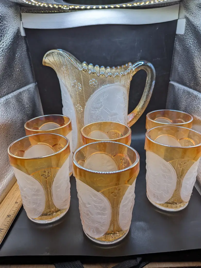 Beautiful vintage carnival glass set featuring a pitcher and six tumblers. The iridescent finish and intricate floral design make this a stunning addition to any collection. No chips or cracks. Please see all pictures for condition and measurements.