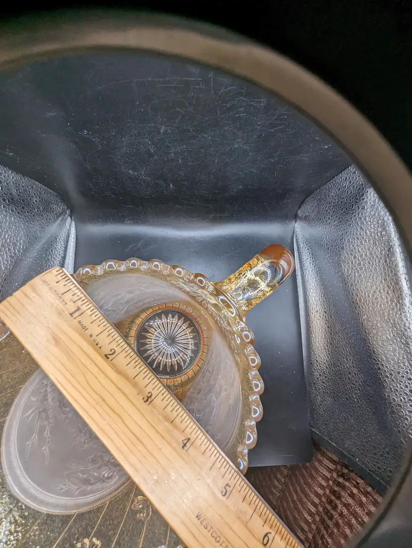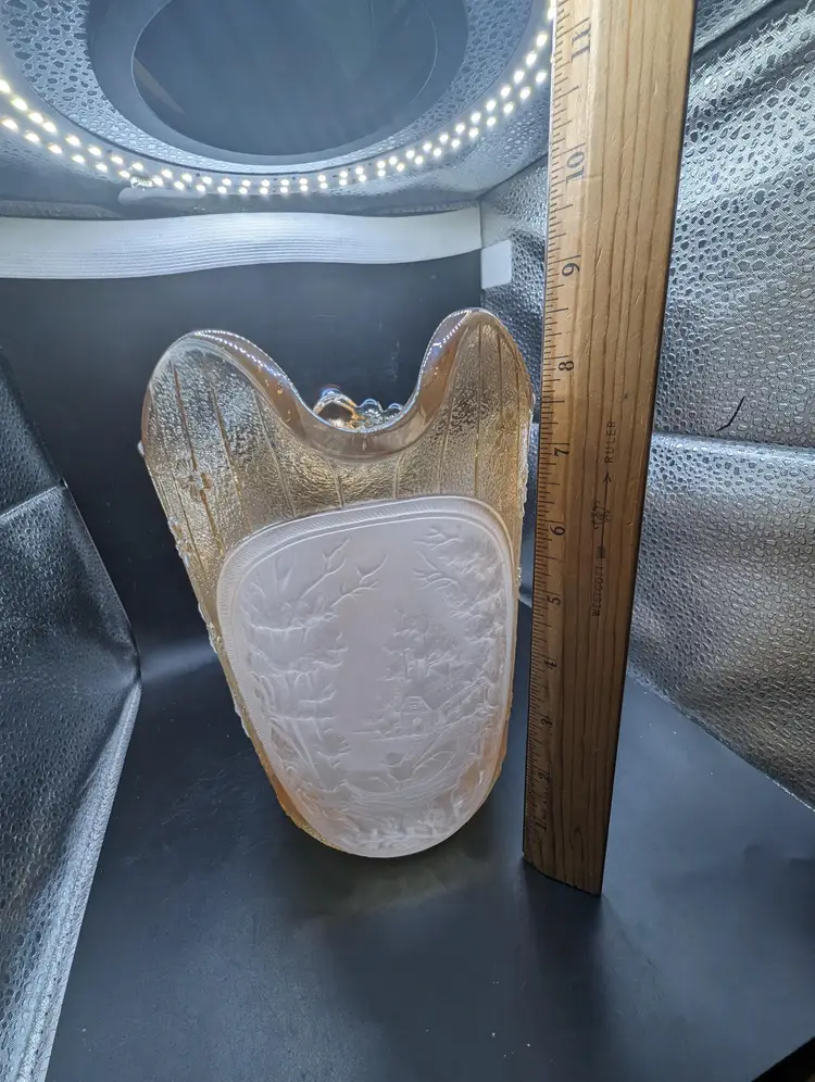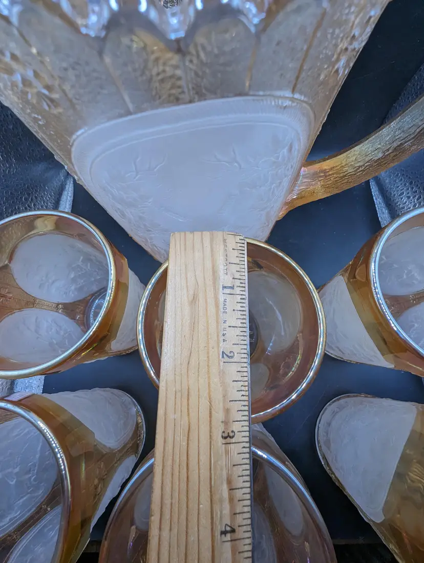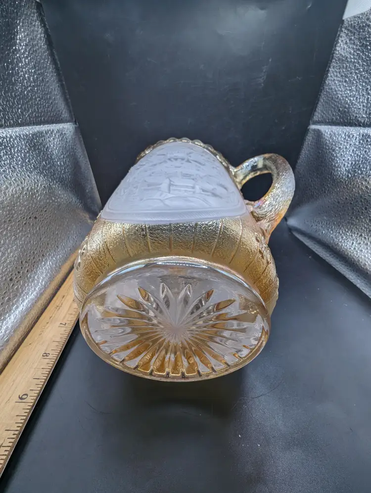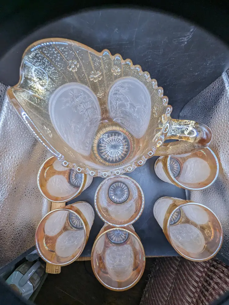 Beautiful vintage carnival glass set featuring a pitcher and six tumblers. The iridescent finish and intricate floral design make this a stunning addition to any collection. No chips or cracks. Please see all pictures for condition and measurements.