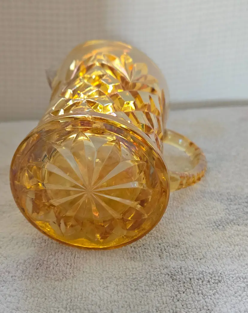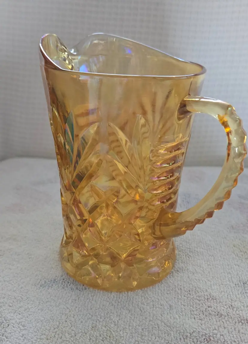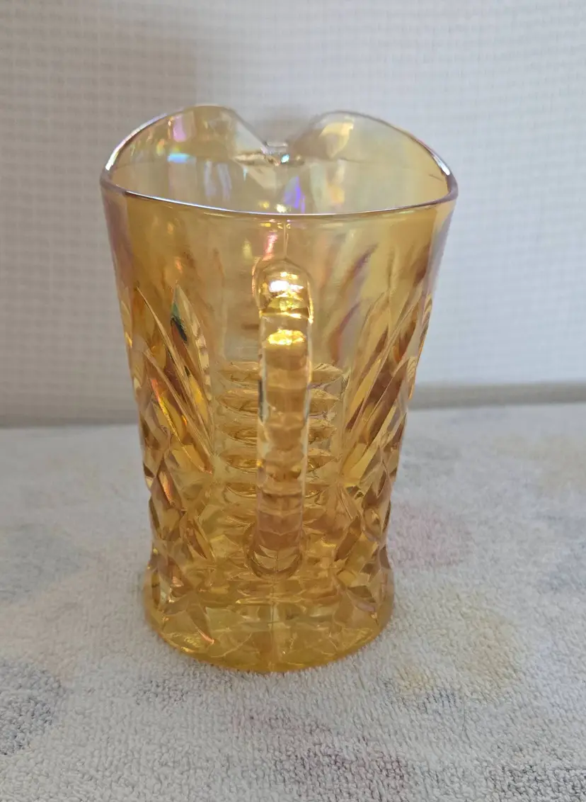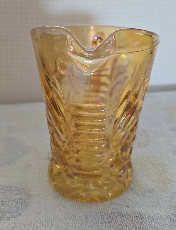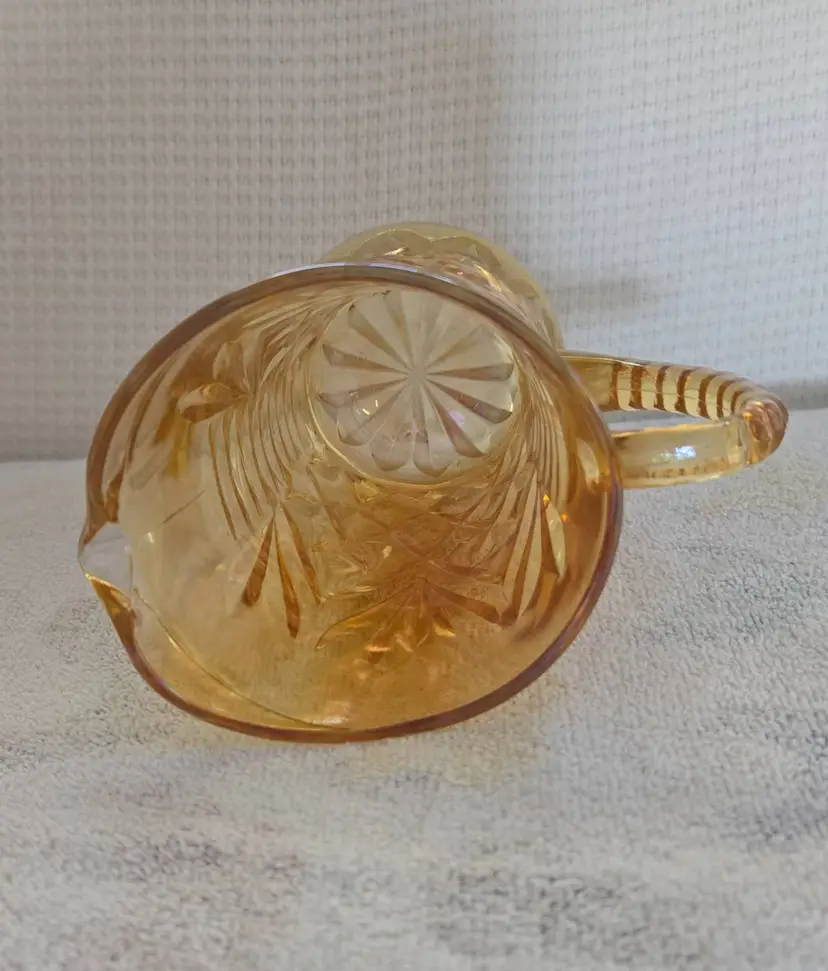 Creamer has an iridescent Marigold amber finish. Suitable for cream or syrup. About 5" tall, 5" from spout to handle. 3" across the bottom. Not sure of the maker. Possibly Anchor Hocking or Jeannette Glass. No chips, cracks, or repairs.
