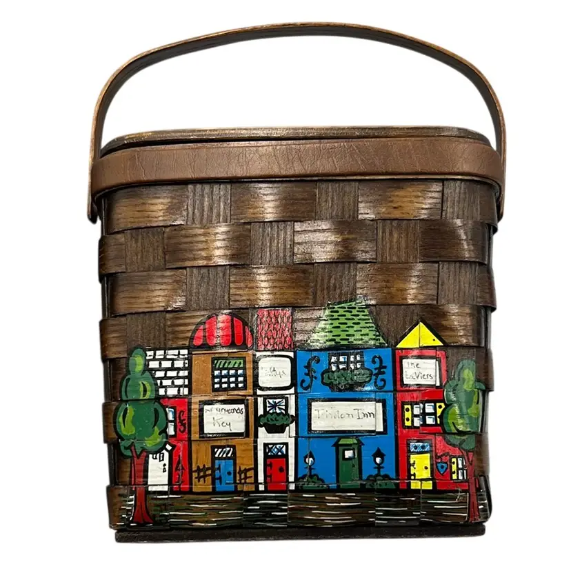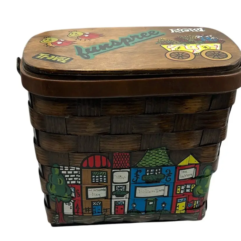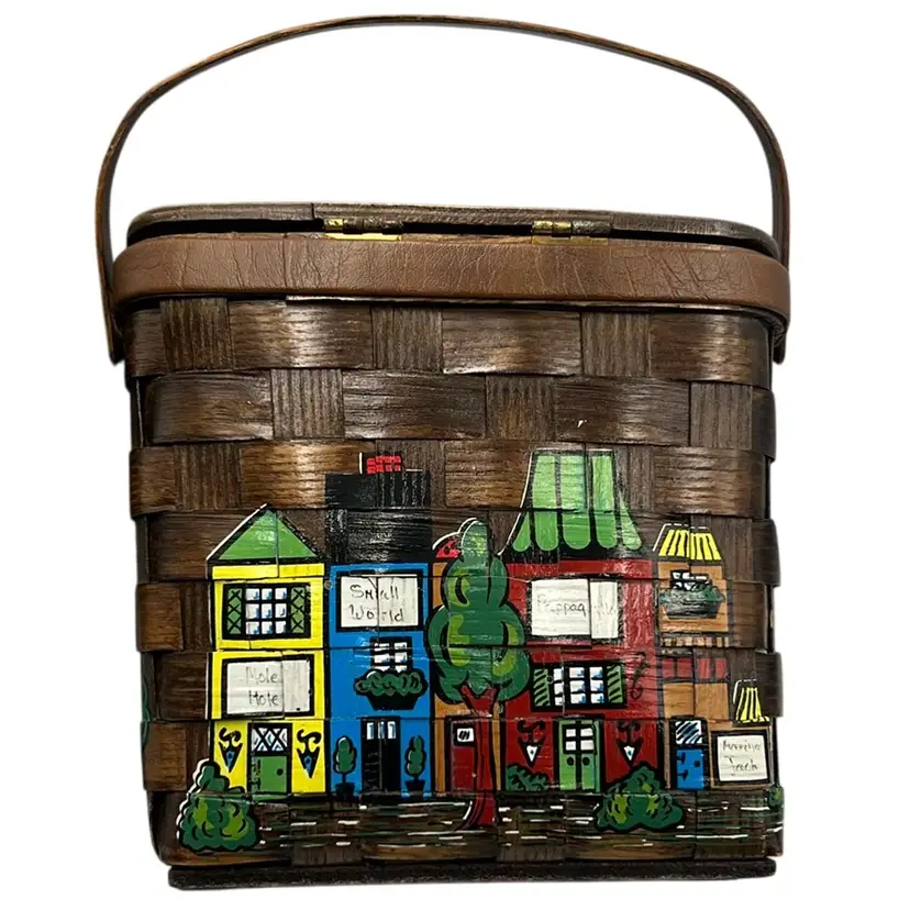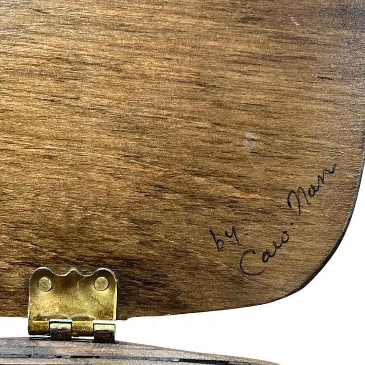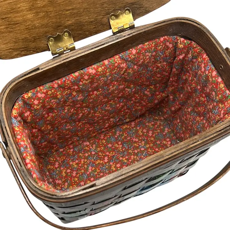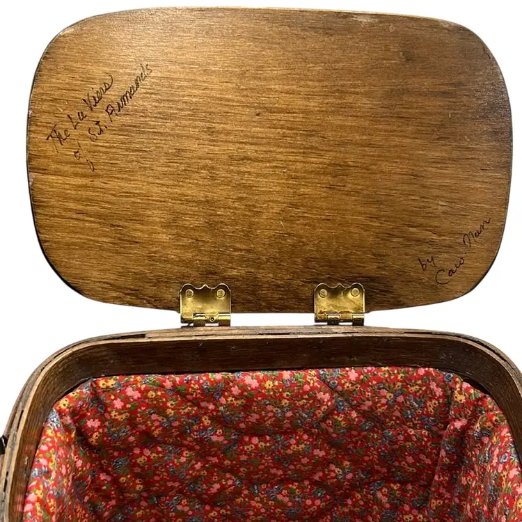 Great hand painting. Minimal vintage wear. Red flowered quilted interior. Very clean.