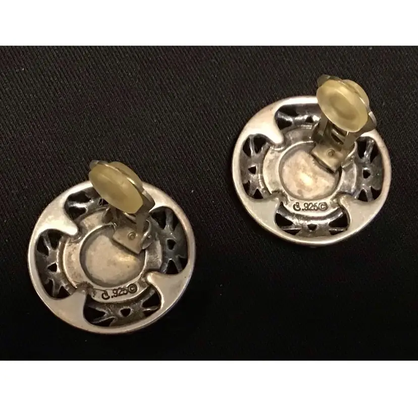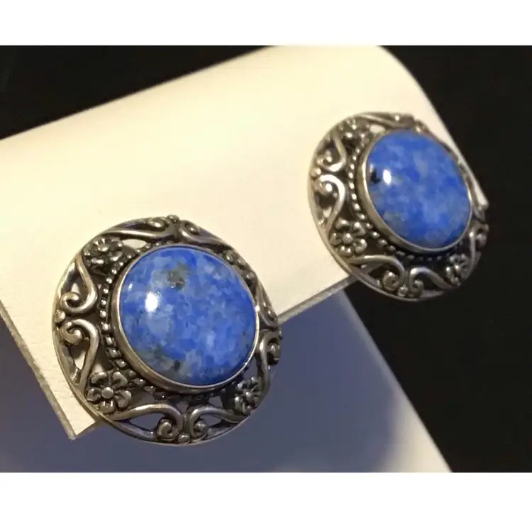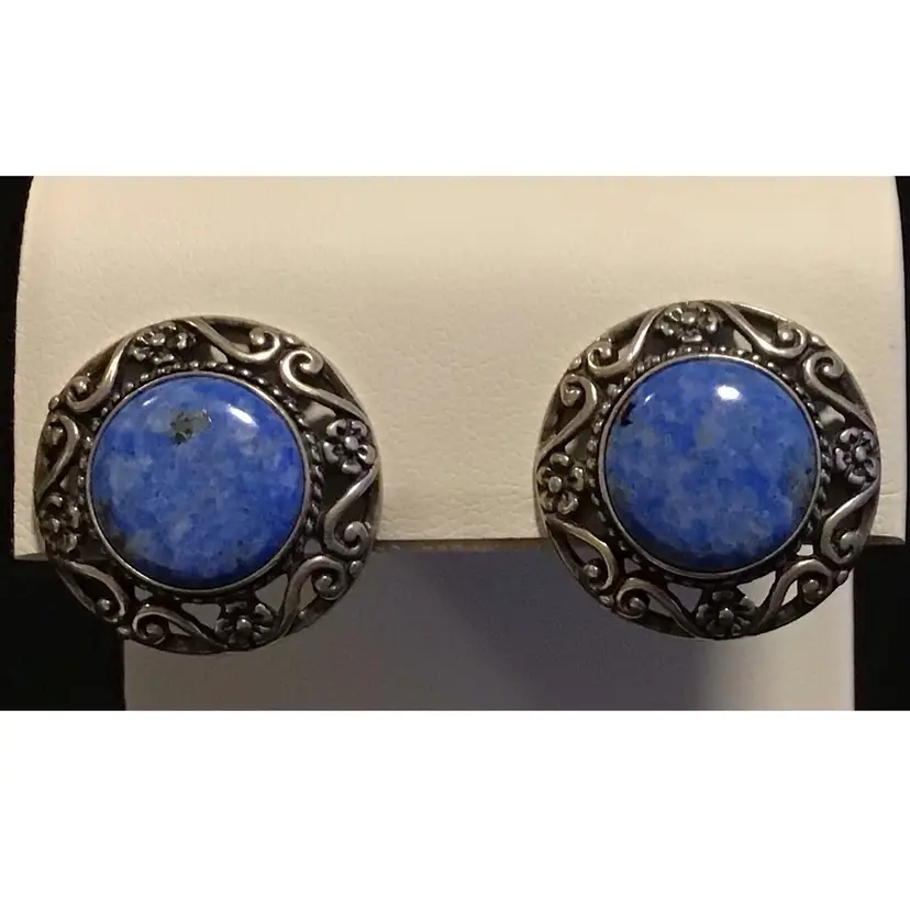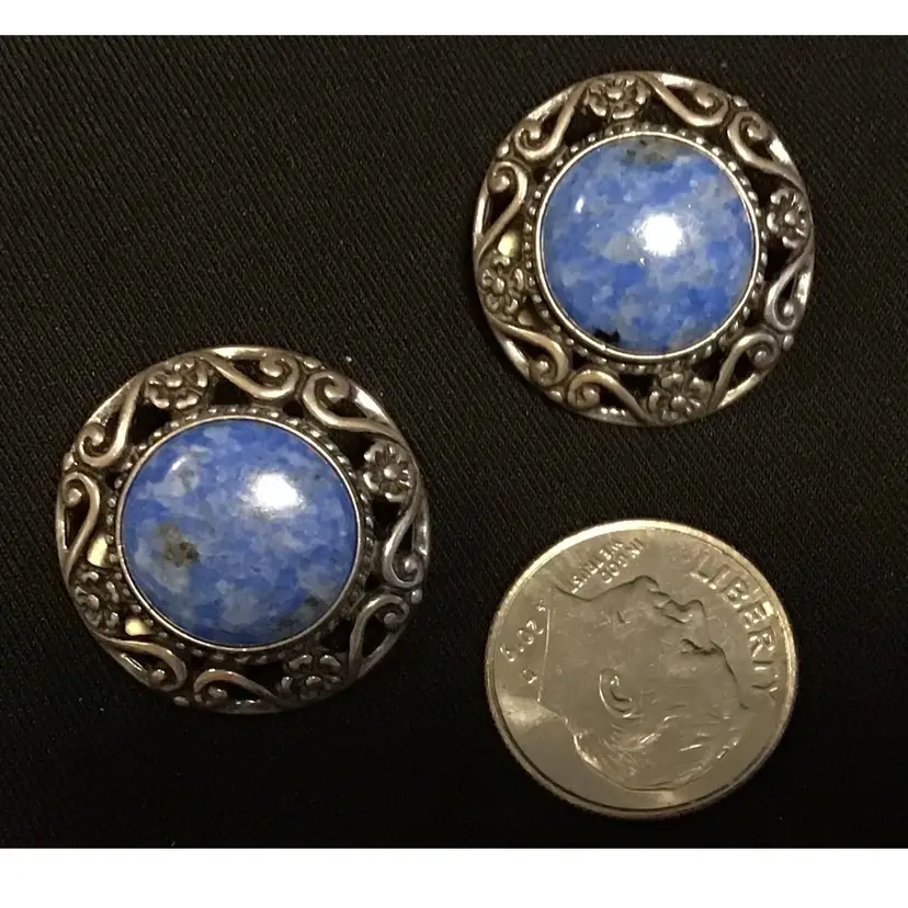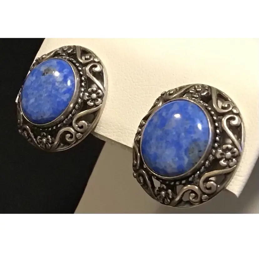 Denim Lapis Lazuli cabochon with sterling floral design, clip on. Tested & confirmed sterling. #256