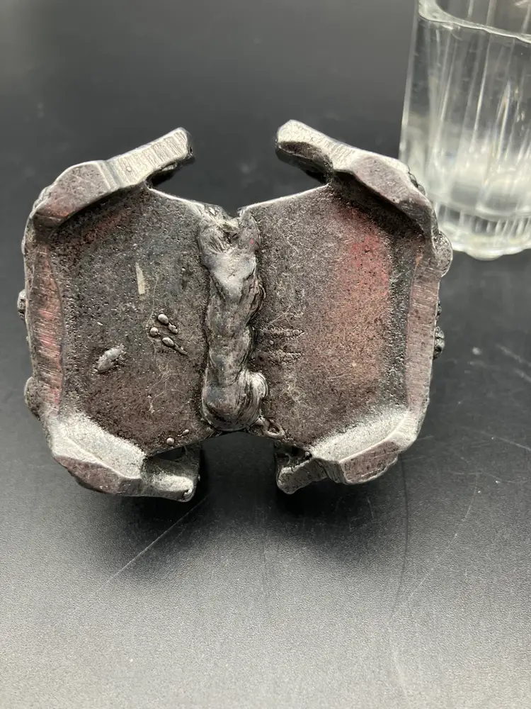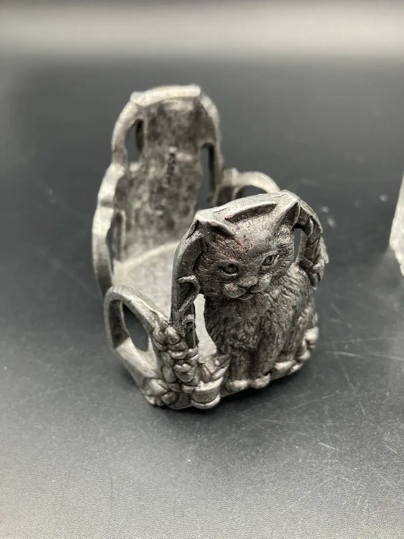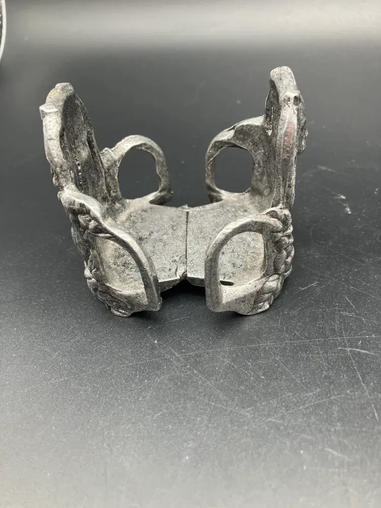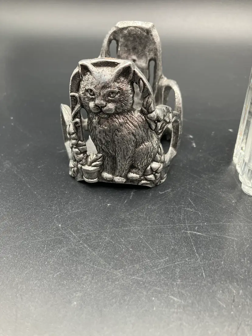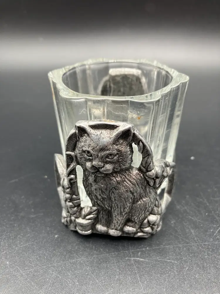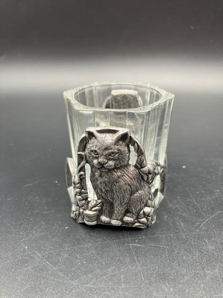 Measures 2.75” tall by 3” by 2.5”. Excellent condition. One side is stamped 2997 Carson and the other side looks like it is stamped “Roseville” but I have not seen that mentioned elsewhere. Carson pewter is made in PA. Piece Includes glass insert.