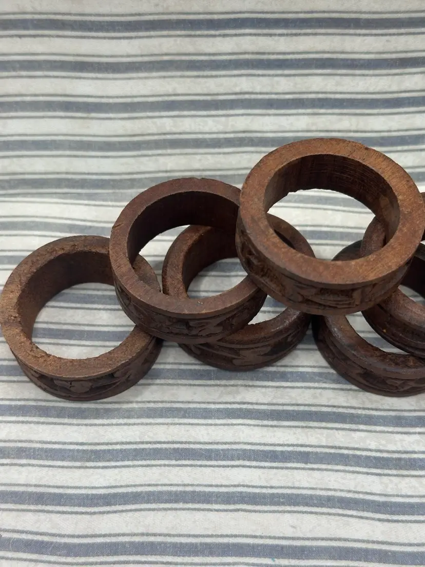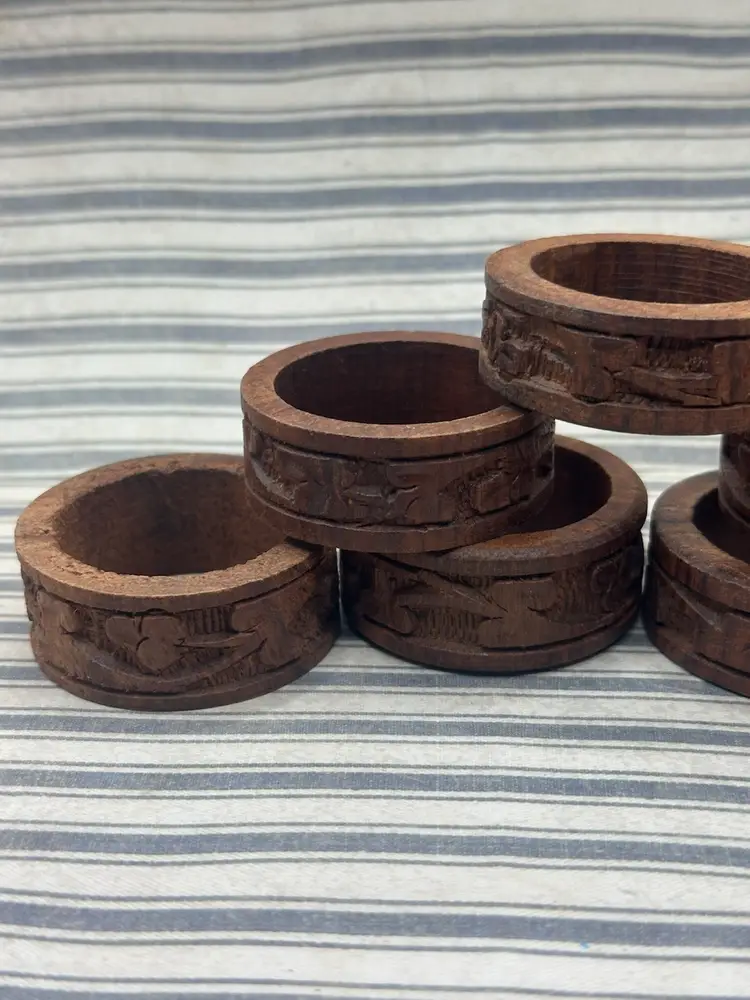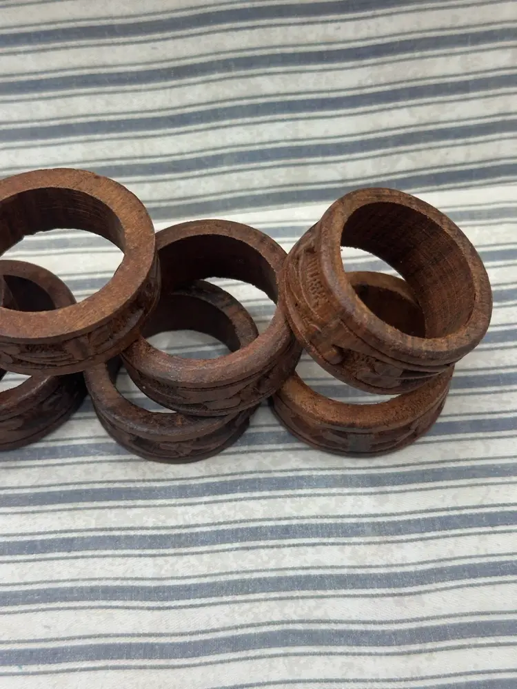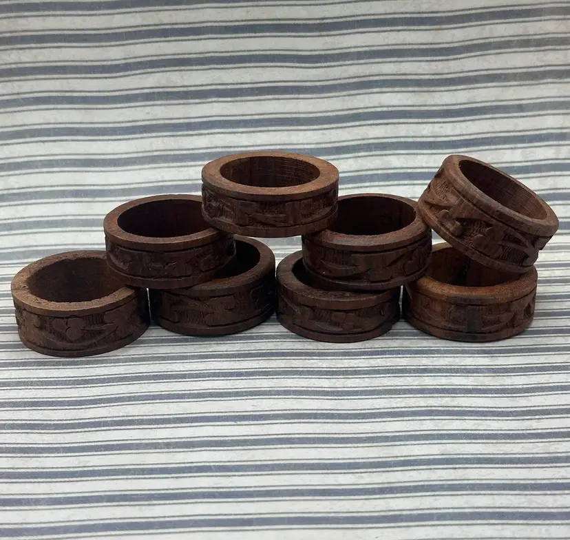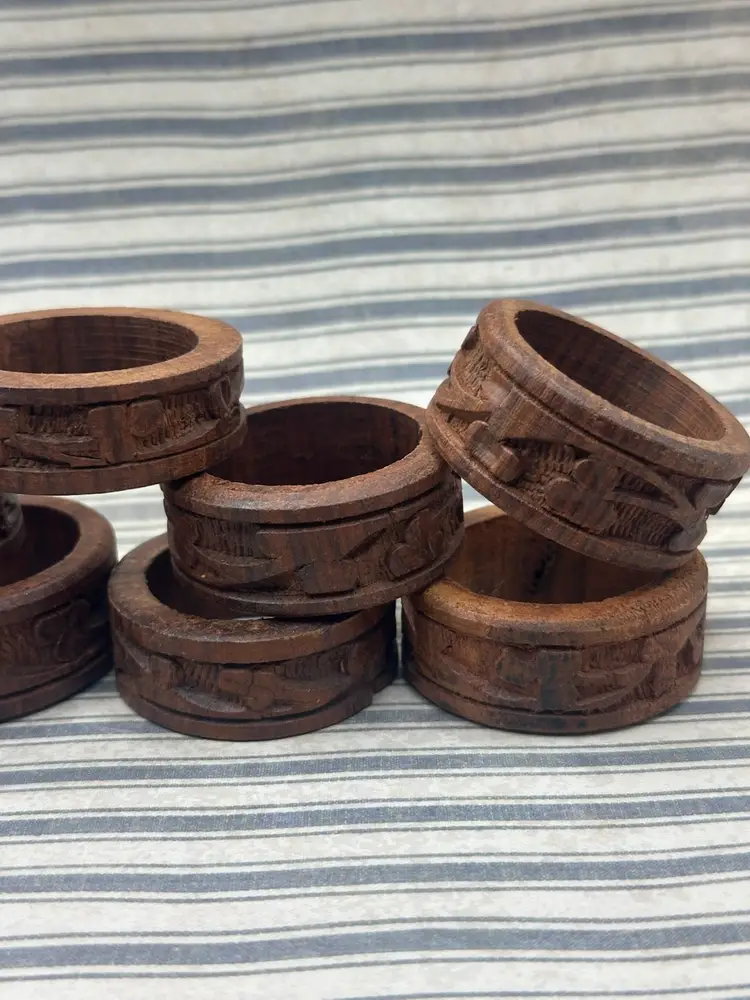 This lot of 8 vintage carved rosewood napkin rings features a charming 1960s style with a unique three leaf clover pattern. Handmade from wood, these round brown rings are a classic addition to any table setting. Perfect for both men and women, these original pieces bring a touch of vintage elegance to your dining experience. They very around a .5 inch width and outside diameter 2 inches inside diameter if 1.5 inches.
