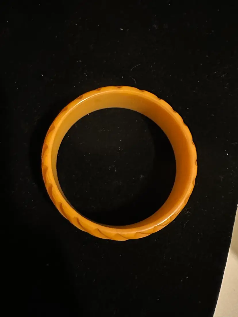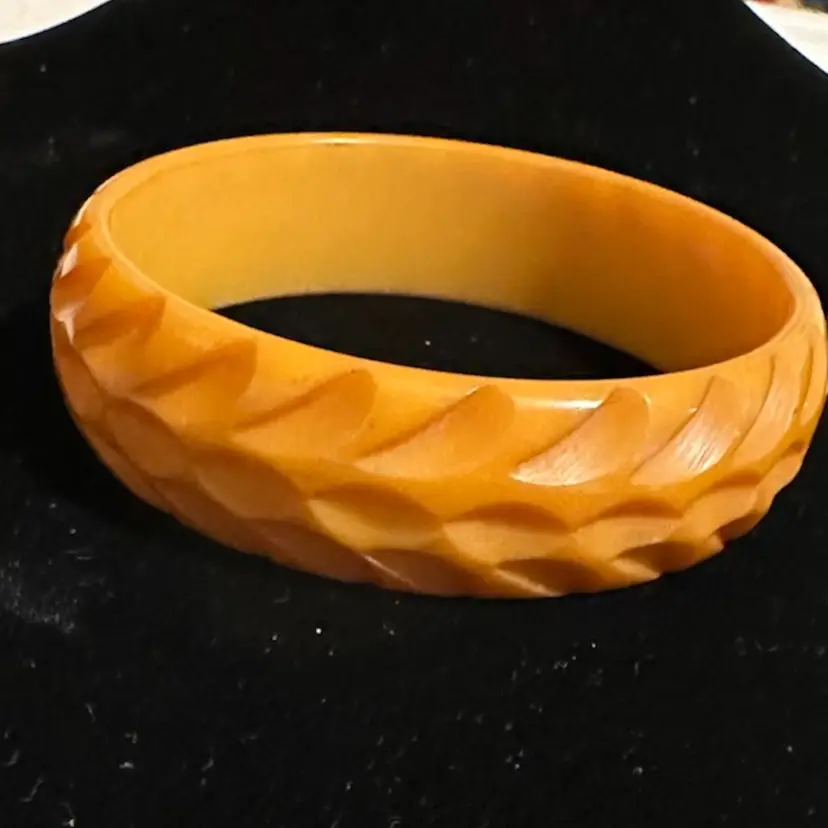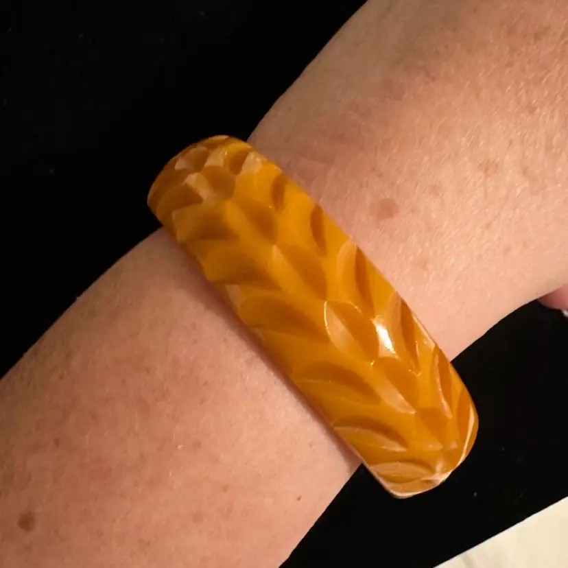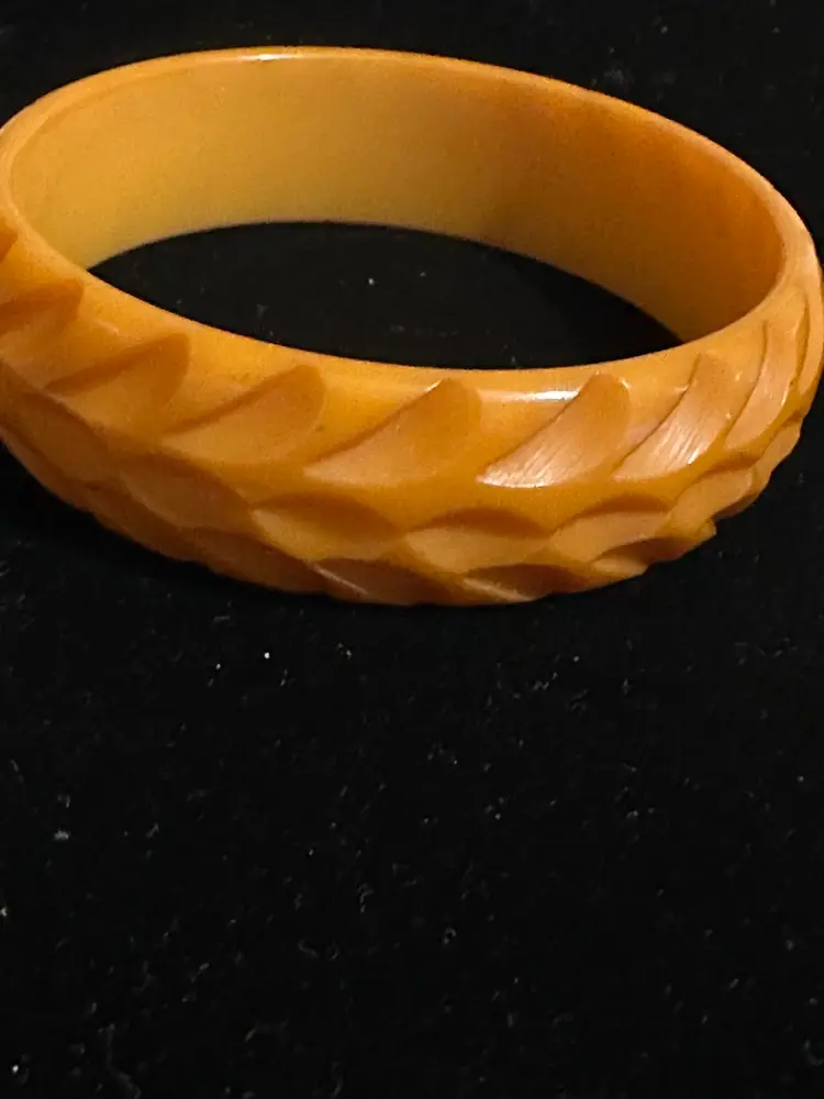 Nicely carved Bakelite bangle in a butterscotch color. It is .75” wide. The opening is 2.5” in diameter. It is in excellent condition.