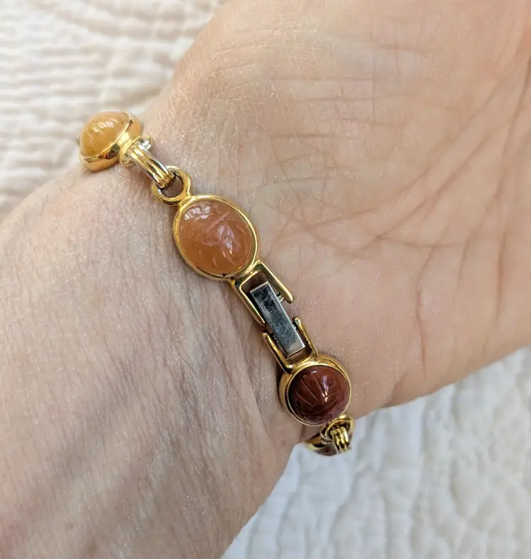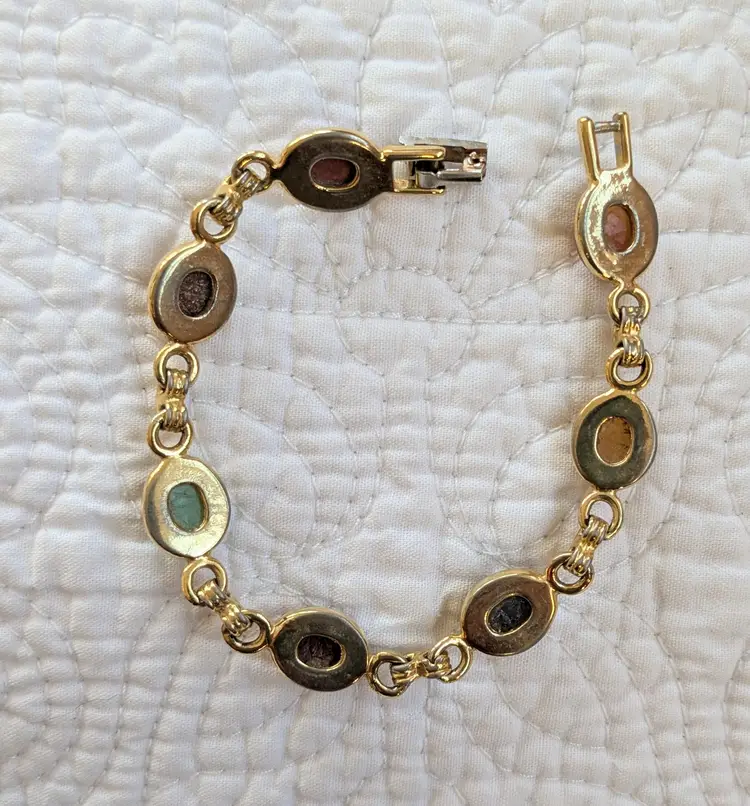 6-3/4" long and unmarked. Note that the gold finish is worn off on the clasp.