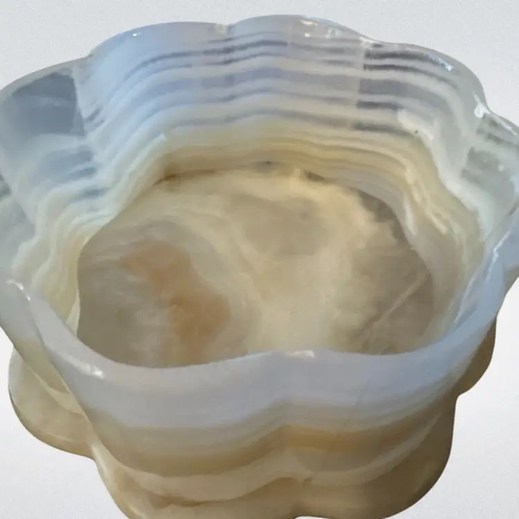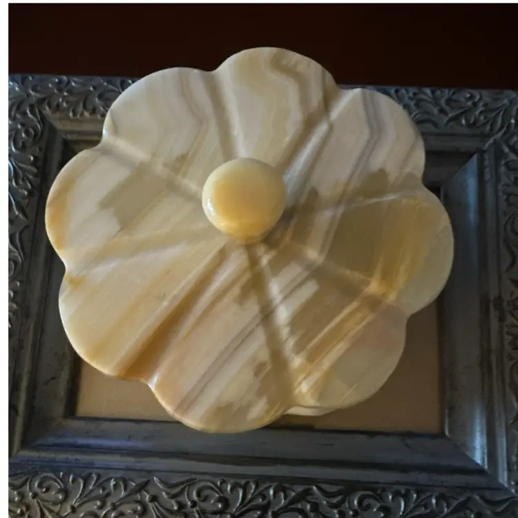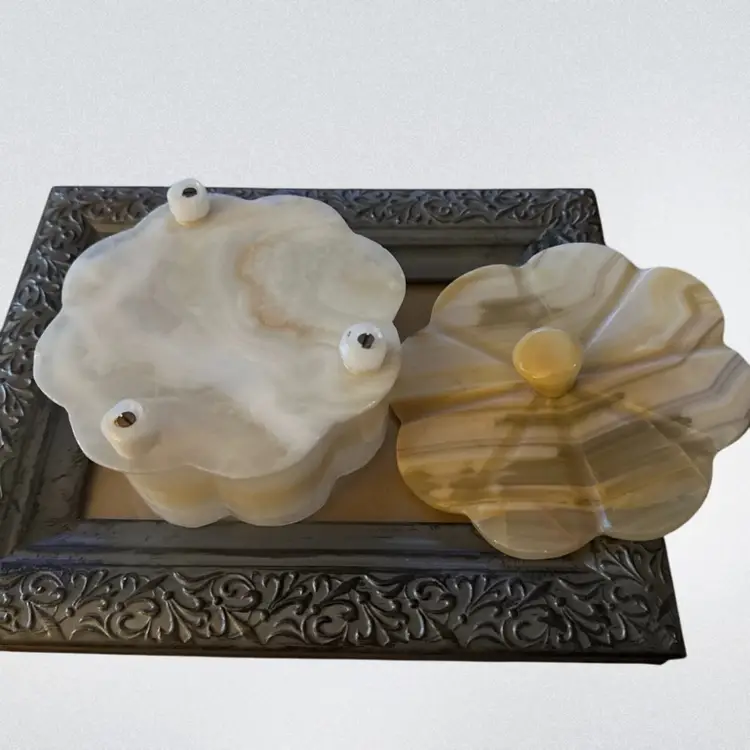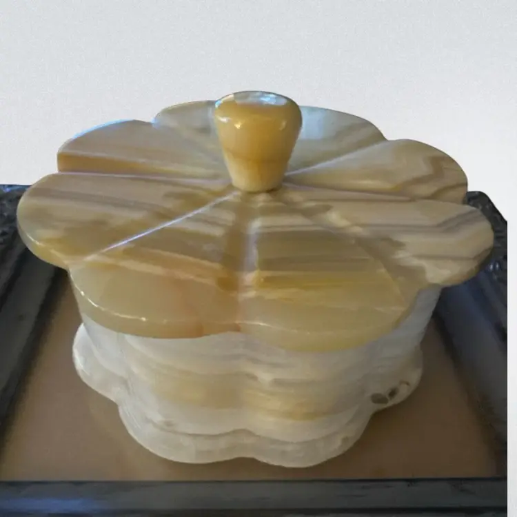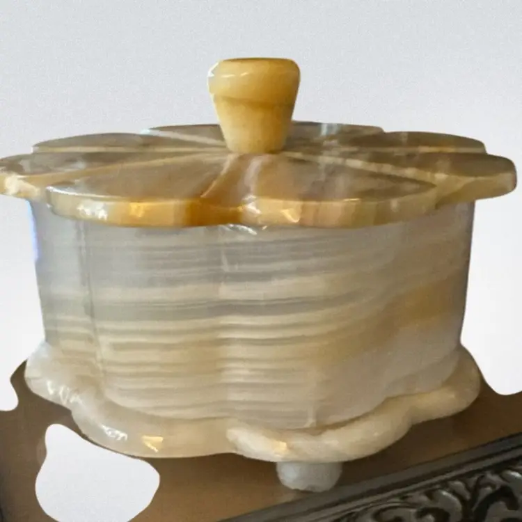 This vintage trinket box features intricate carved detailing on its surface, with an onyx stone lid that adds a touch of elegance. The footed design gives it a unique and antique appeal, perfect for storing small treasures or jewelry. Made with quality craftsmanship, this collectible piece would make a stylish addition to any vanity or dressing table.