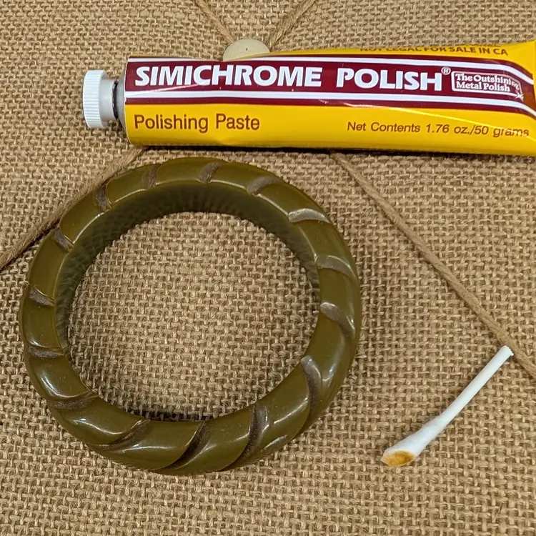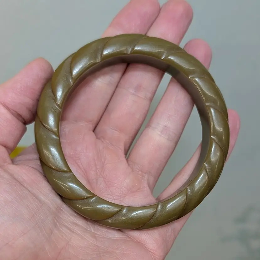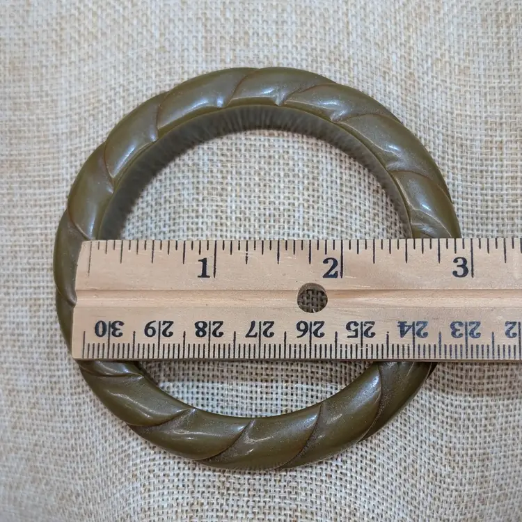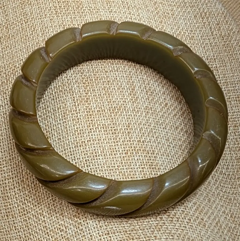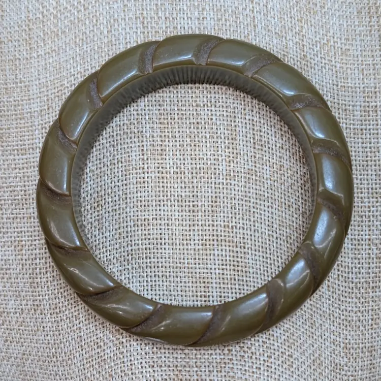 The deep carved groves in this bangle make it look like a rope. A deep, olive green or dark pea soup color. Needs a little cleaning/polishing with a small white scuff (see pictures). Measurements ~ 2.5" opening and 5/8" wide