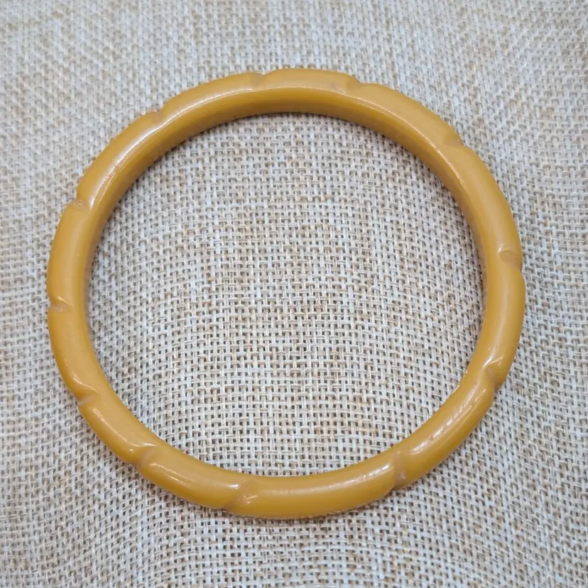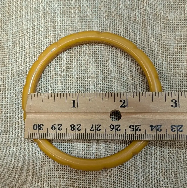 Carved groves on this bangle make it look like a rope. A lovely creamed corn, light butter yellow or butterscotch color. Measurements ~ 2.5" opening and 1/4" wide