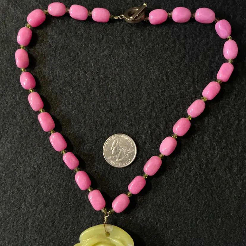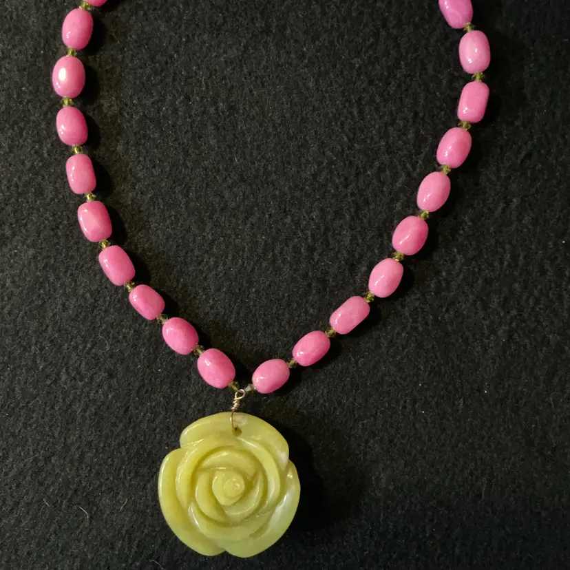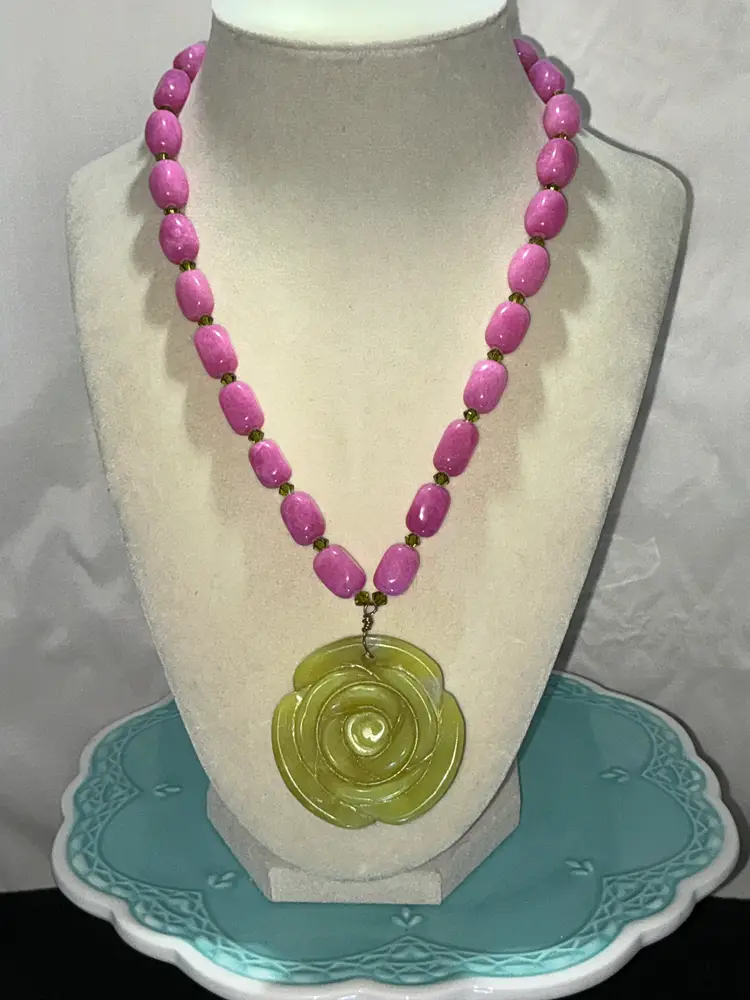 Vintage artisan necklace with substantial carved stone rose pendant in a greenish-yellow tone. The pendant is paired with polished pink oval stone beads, accented by small olive-toned bicone crystal spacers. Finished with a warm copper toggle clasp.