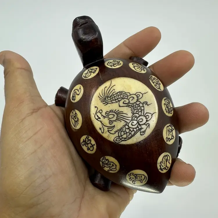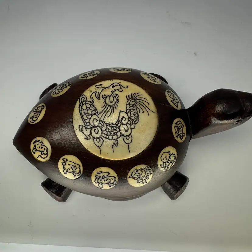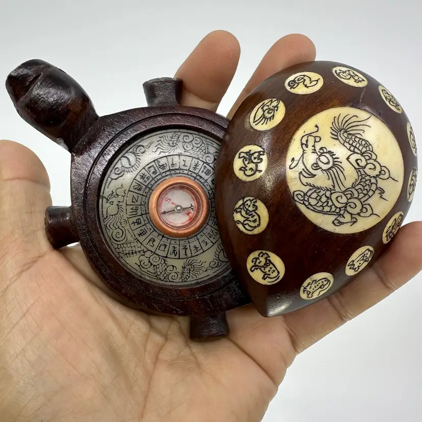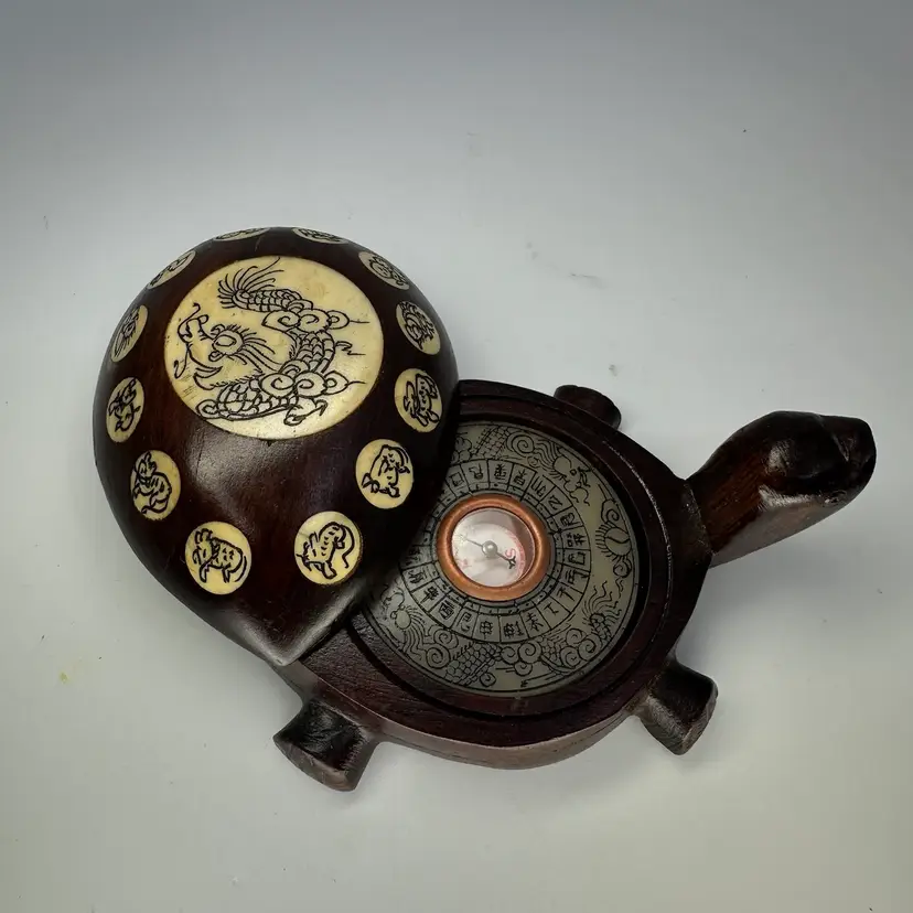 Approx 4” x 3” no chips or cracks This is a Chinese Feng Shui wooden turtle compass, also known as a Luopan. The compass is a traditional tool used in Feng Shui to determine the precise direction of a structure or other item to achieve balance and harmony.
