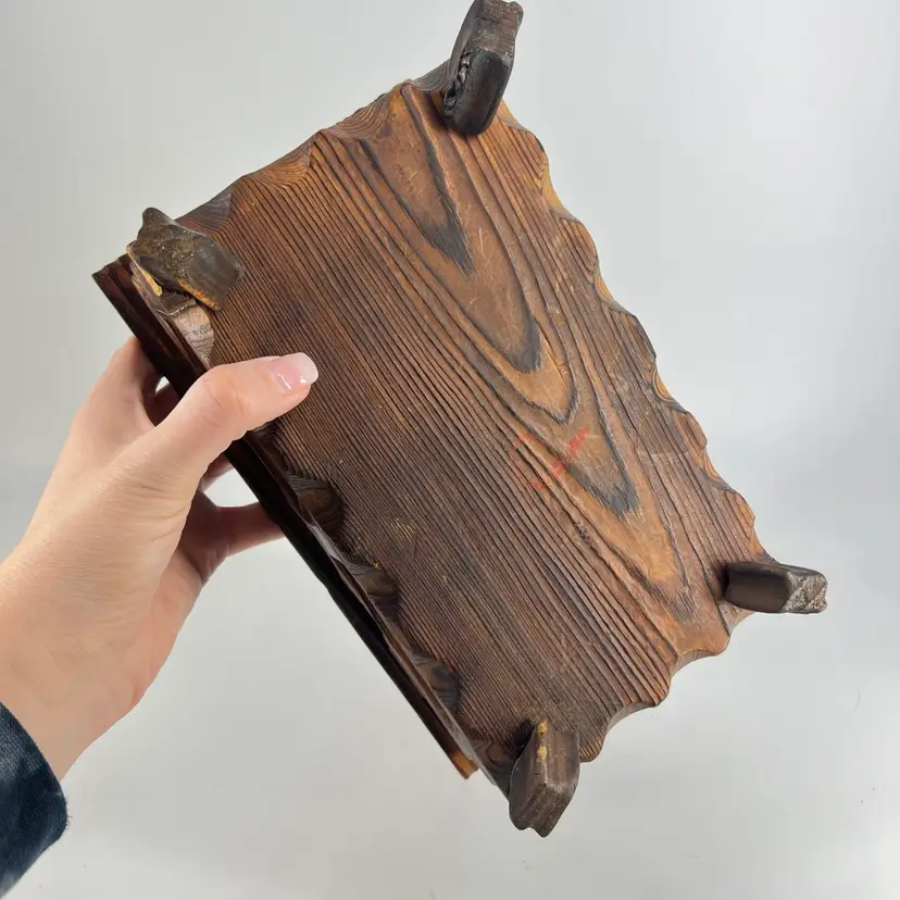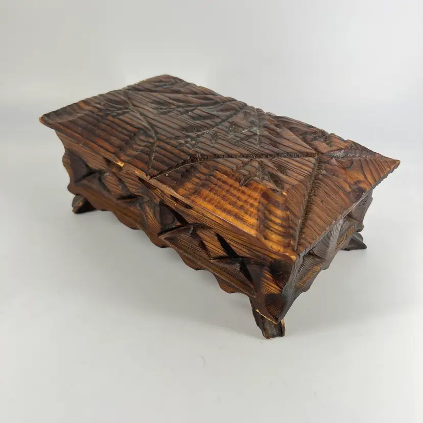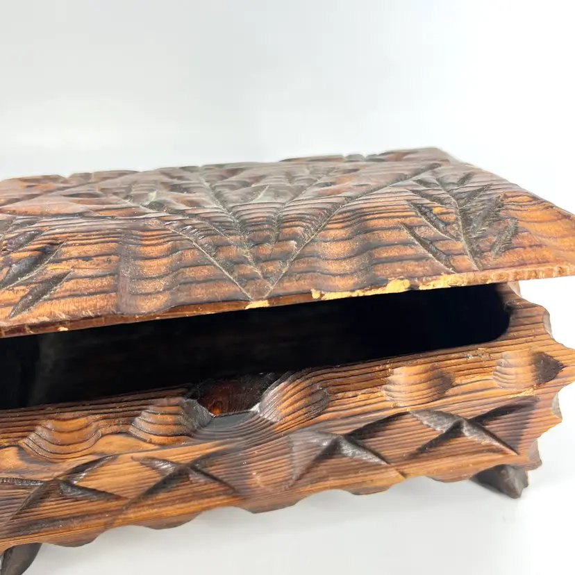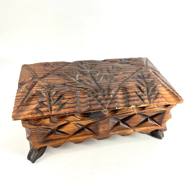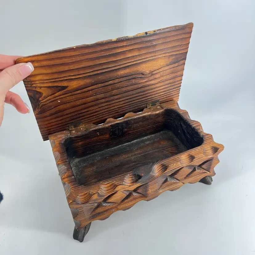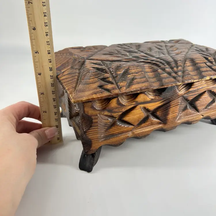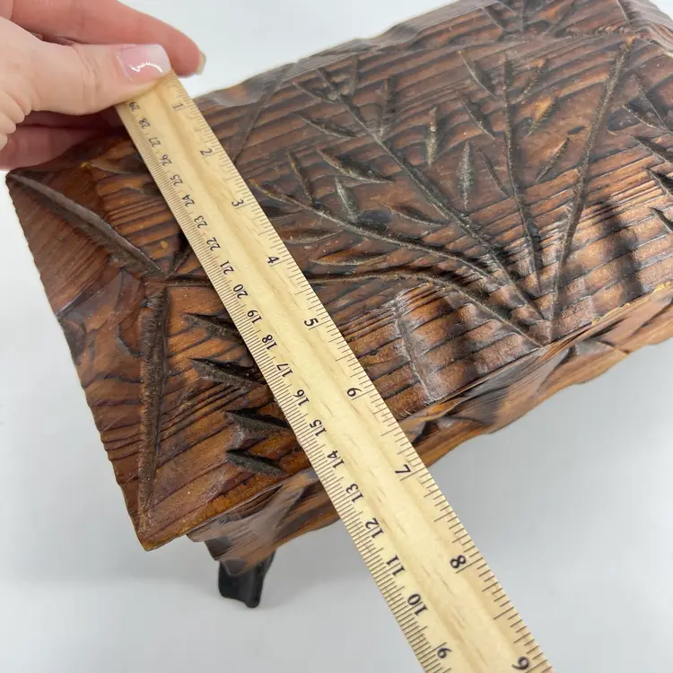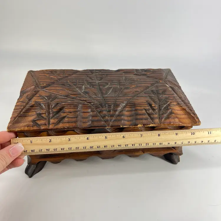 This carved wooden keepsake box is hinged and rests on four feet. There is some wood chipping where it opens. It measures approx 10” x 6.5” and 4” tall.