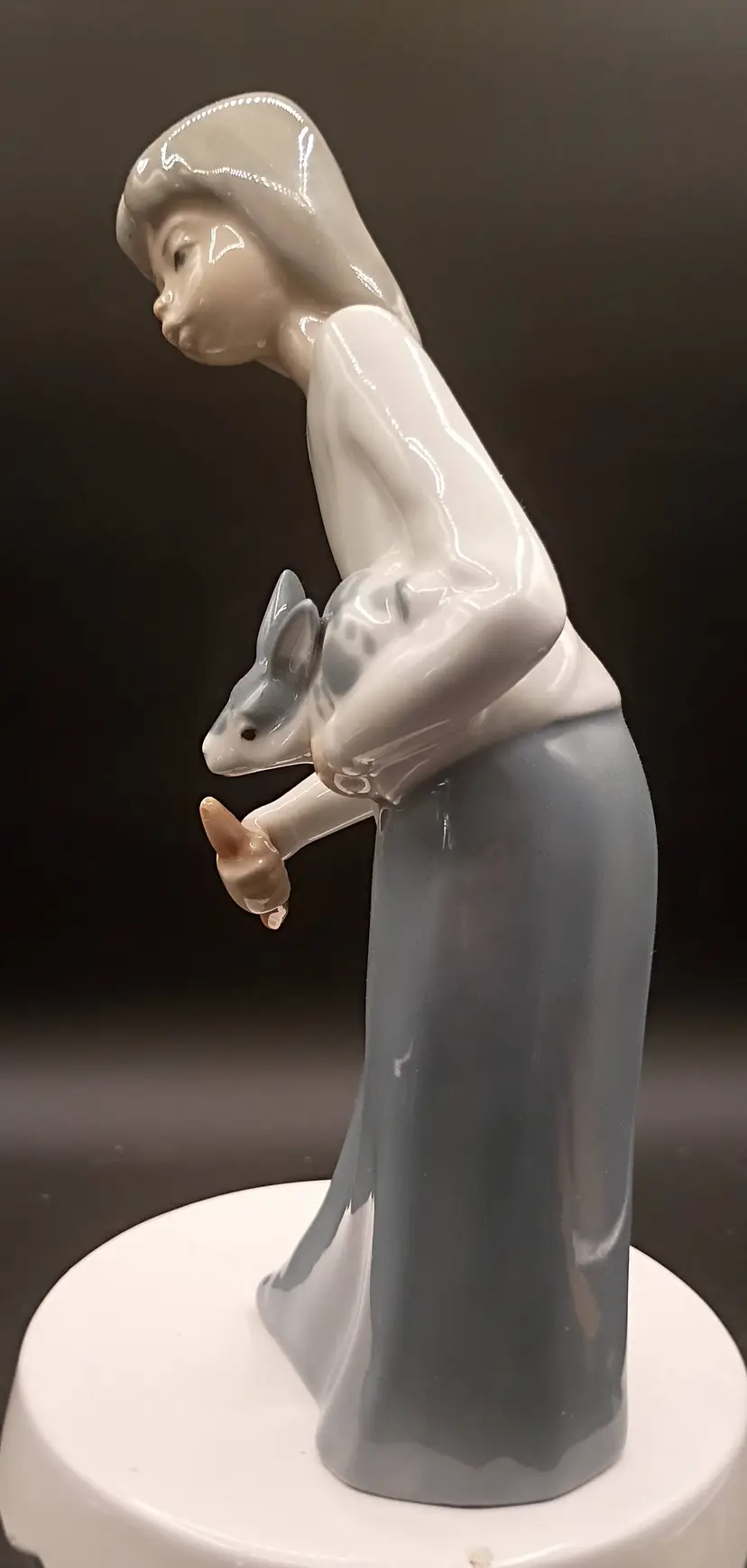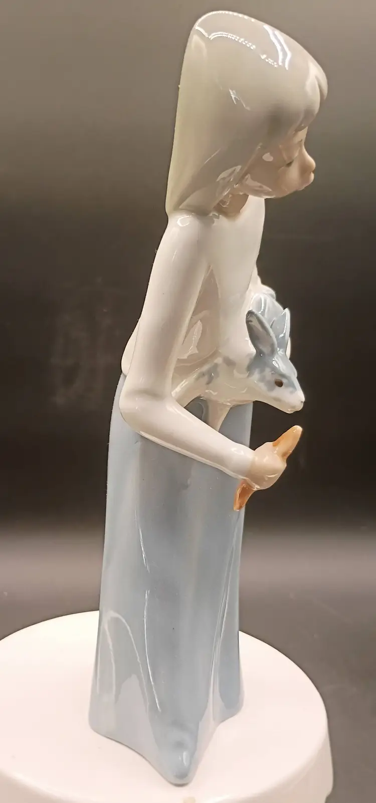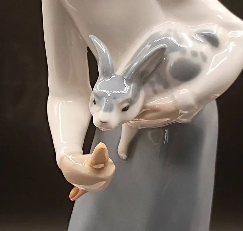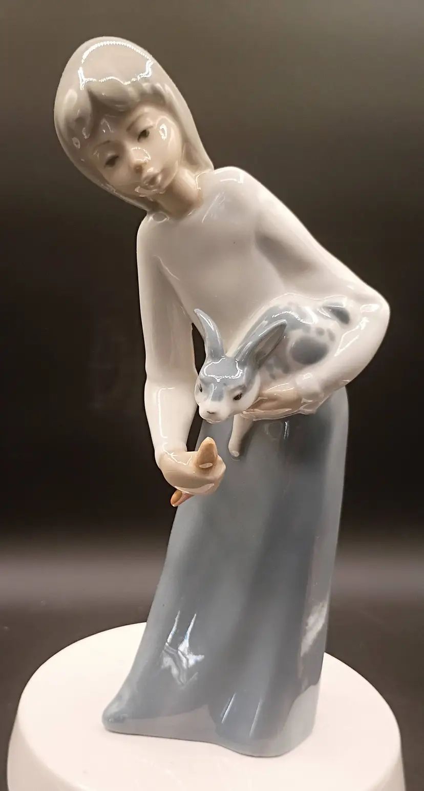 The Vintage Casades Porcelain Girl Figurine with Bunny & Carrot is a medium-sized decorative collectible piece made in Spain. This original figurine features a multicolored glossy finish and depicts a girl with a bunny and carrot, making it a charming addition to any room. Perfect for all occasions, this collectible is a unique and charming representation of Spanish craftsmanship and artistry.