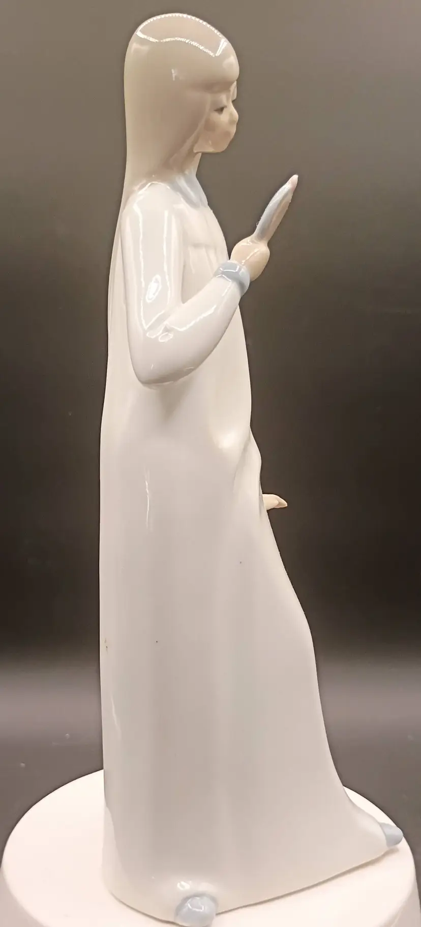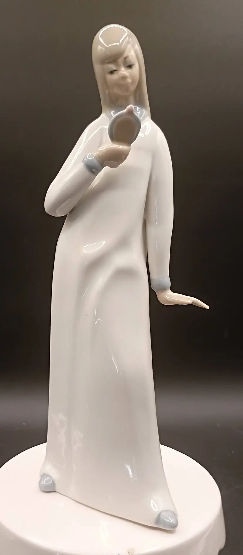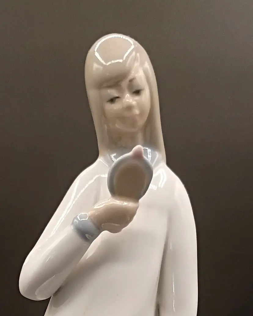 This vintage Casades porcelain figurine features a young girl or woman holding a mirror, made in Spain. The detailed craftsmanship and multicolor design make it a unique and charming decorative collectible for any occasion. Porcelain material adds a touch of elegance to this figurine, capturing the essence of femininity and grace in its subject.
