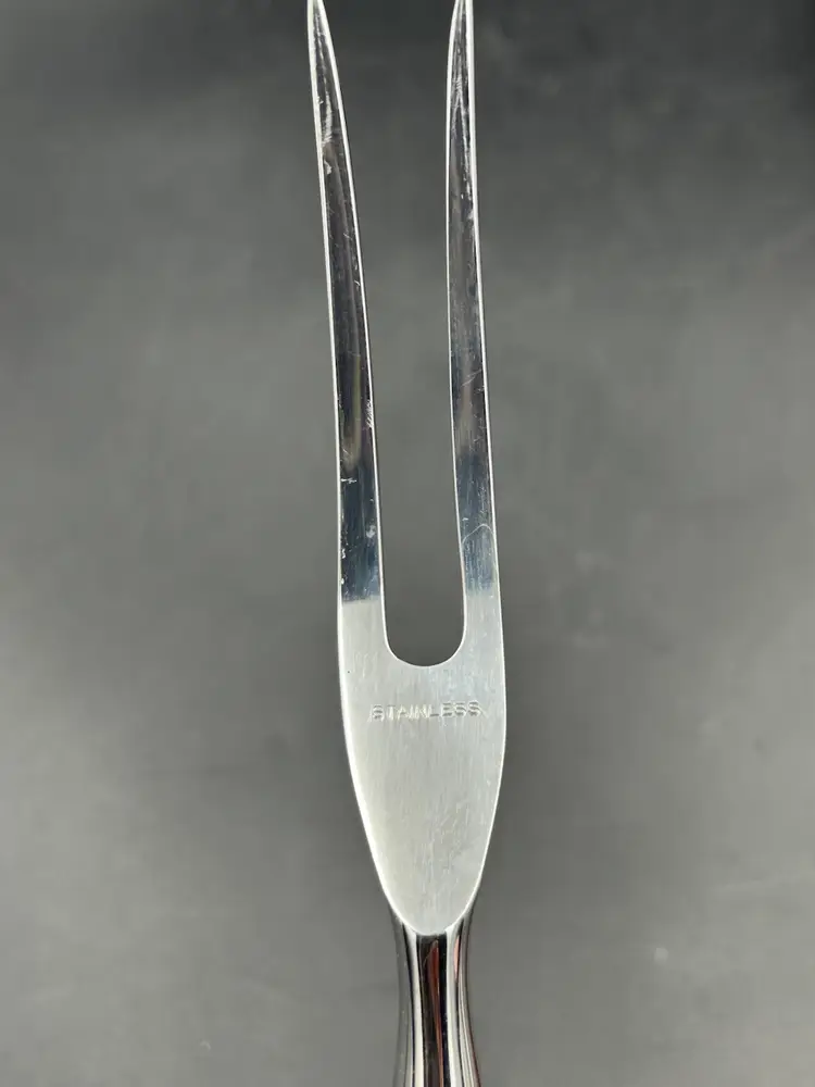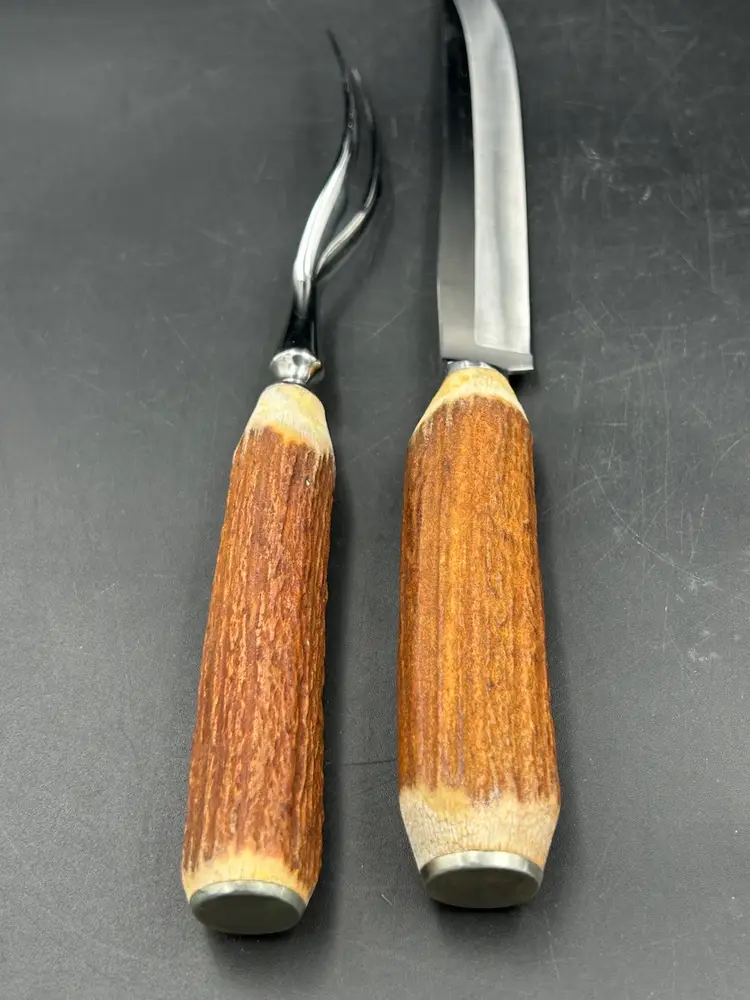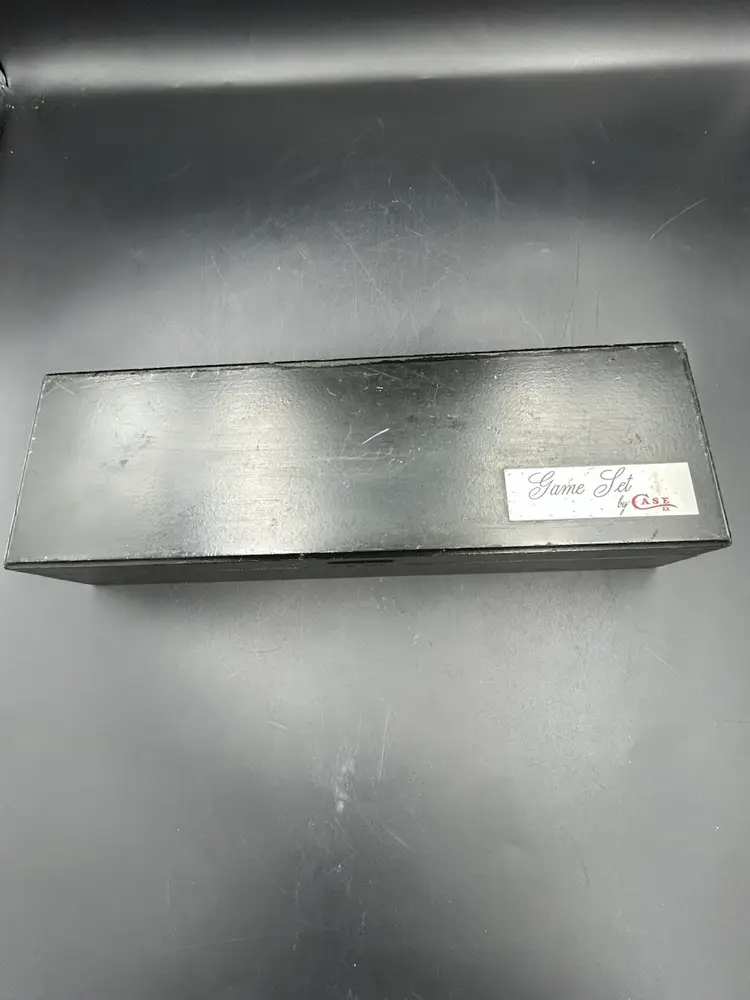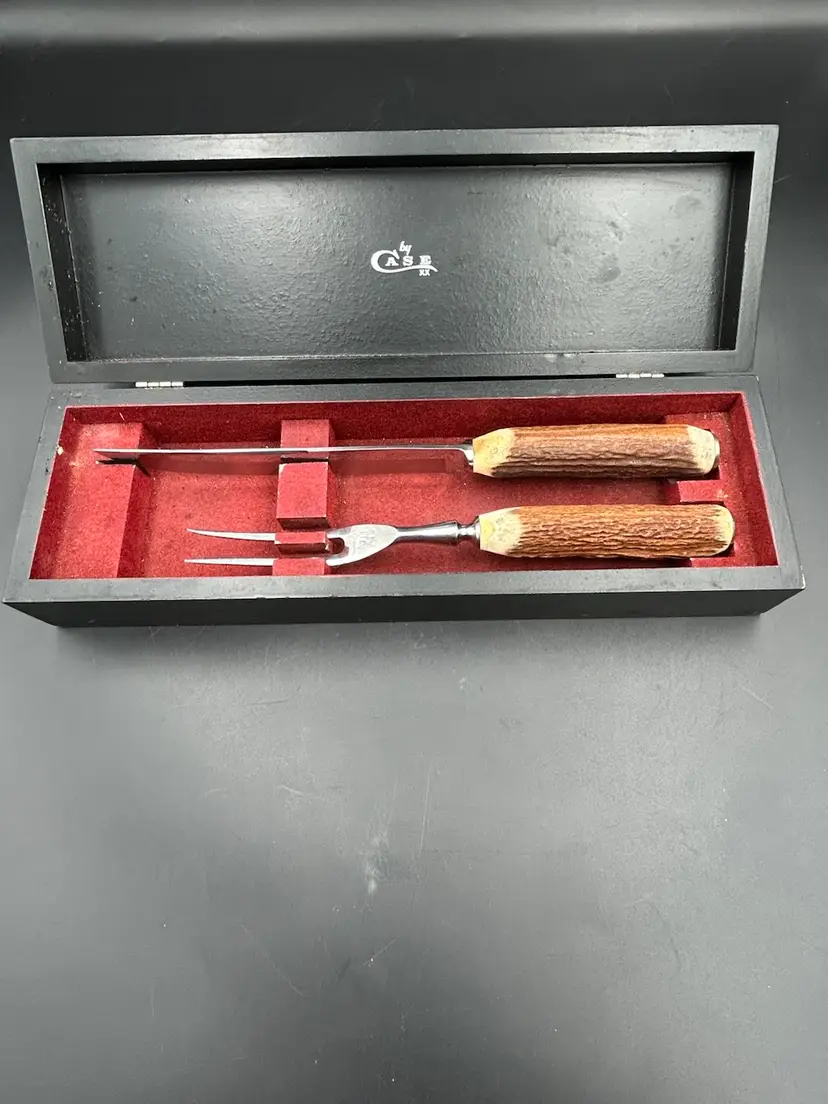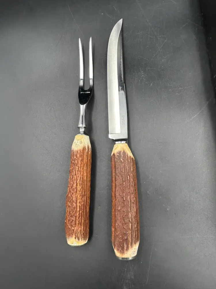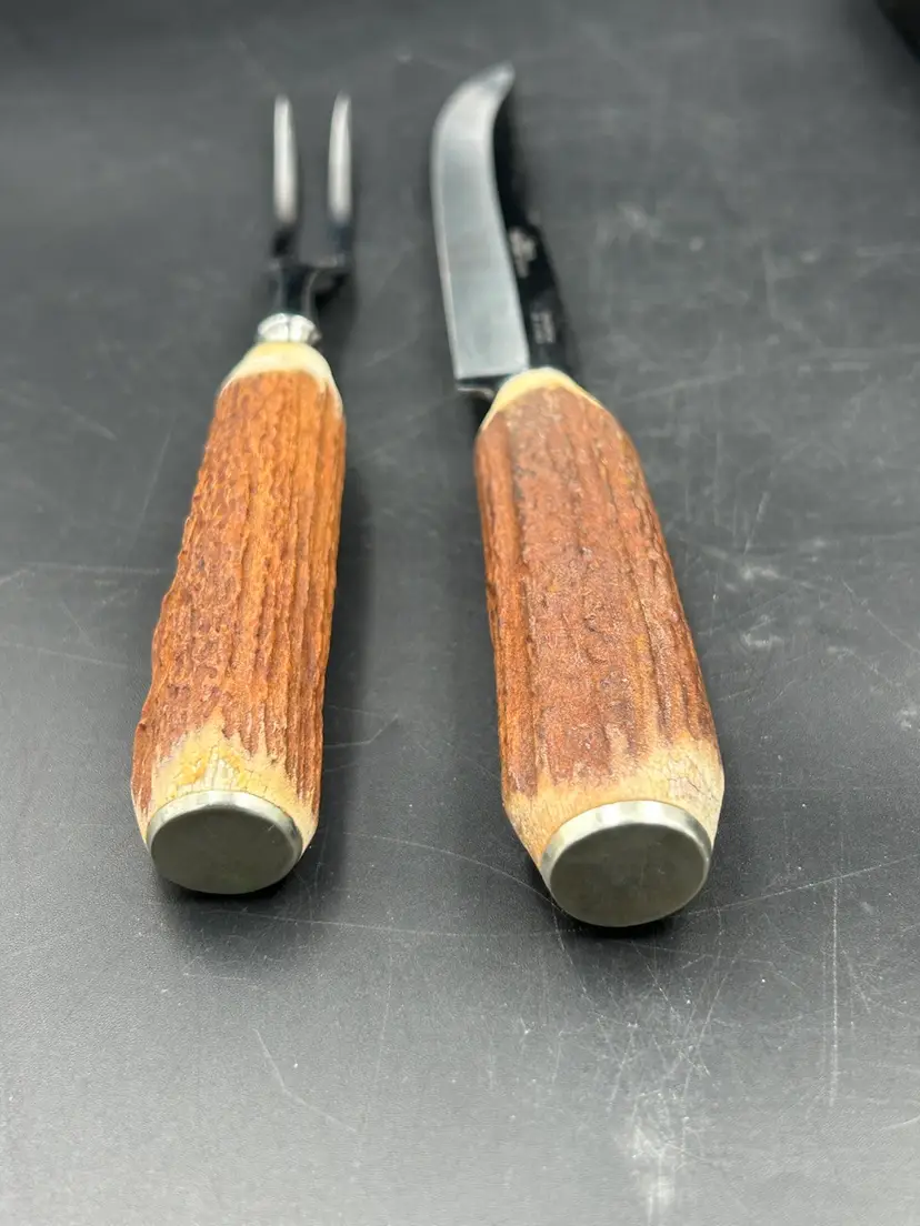 Perfect condition. Box – 12 L.X 3.75 Wx 2.5 H. Knife – 10.5.” Blade – 6.5.” Fork – 8.75.”