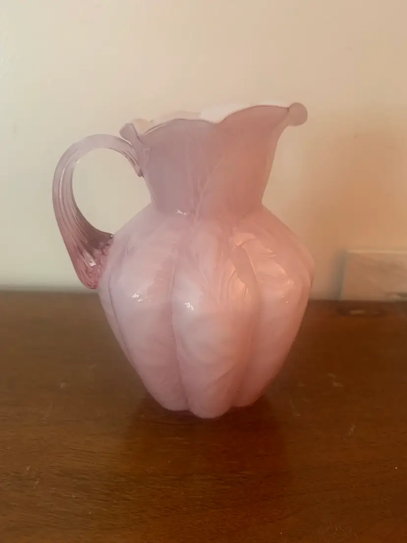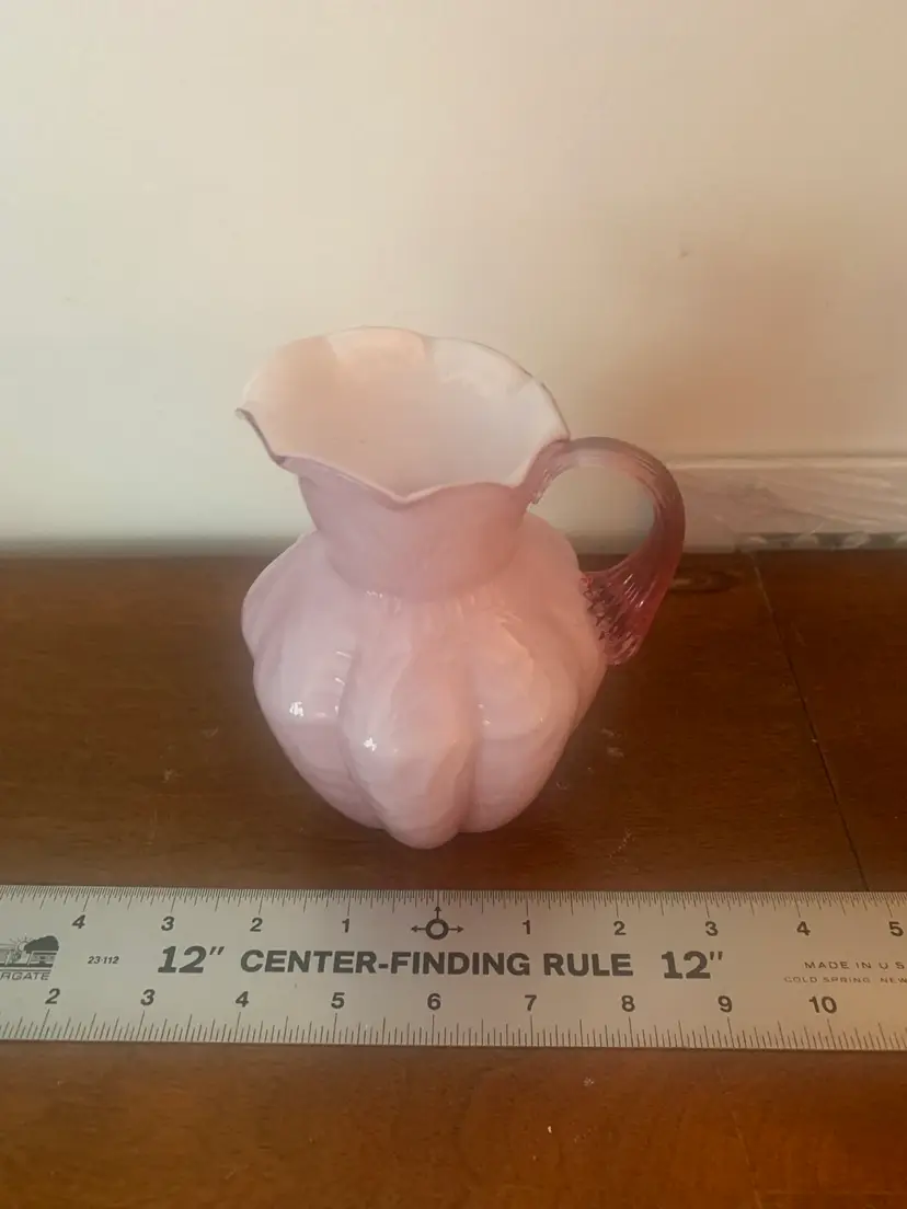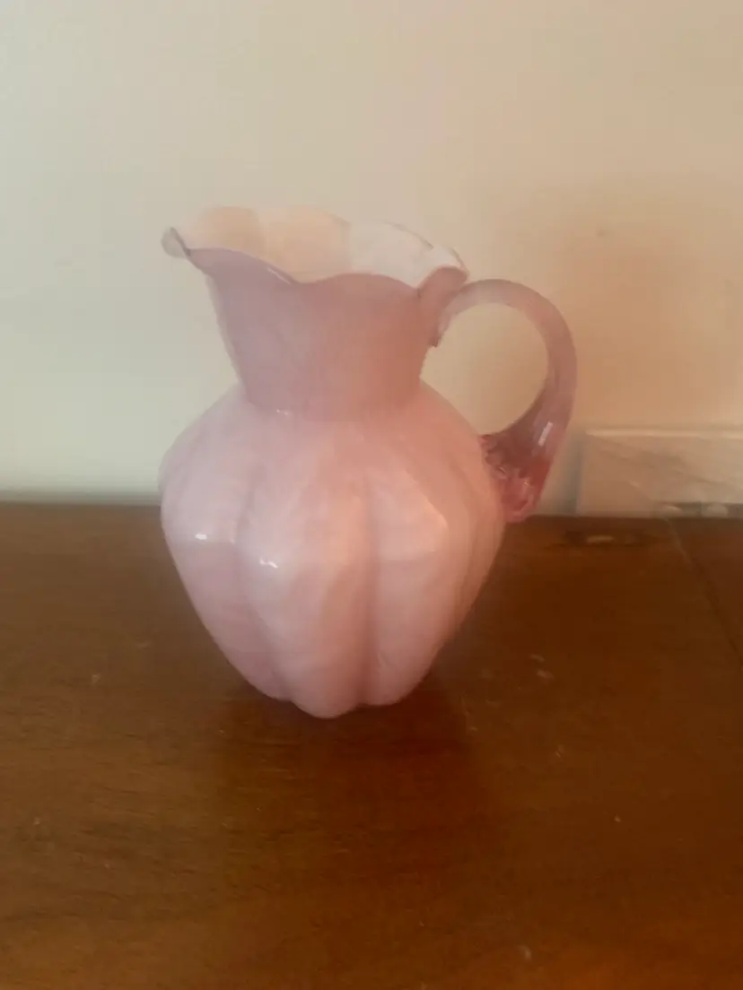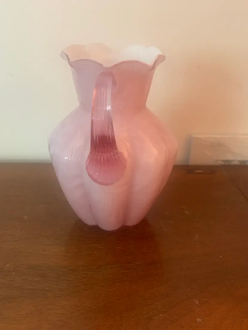 This is a vintage cased art glass Fenton pitcher. It is white on the inside and pink on the outside. There are no chips or cracks and the Fenton logo is a very light impression on the bottom. There is a rough edge on the top right of the handle where it attaches to the pitcher, this appears to be a flaw from when it was made. It measures about 5 1/4 inches tall and 4 1/4 inches wide.