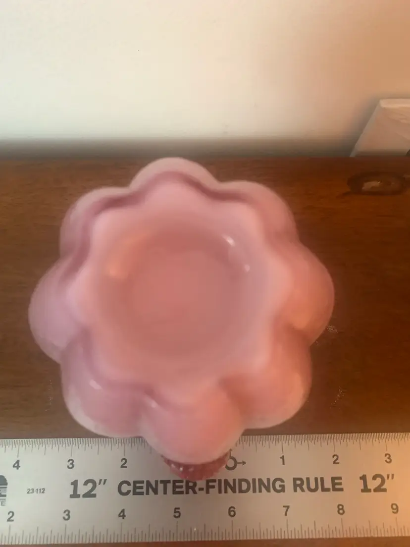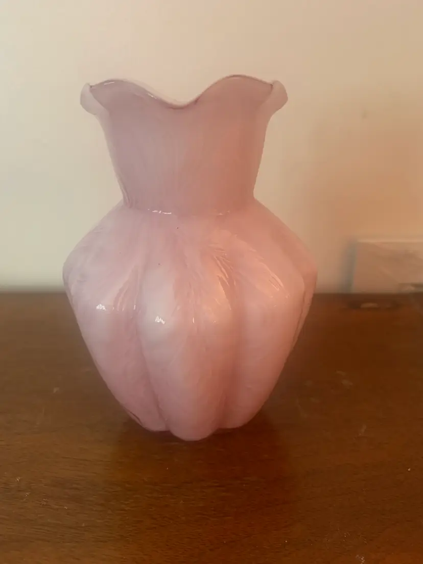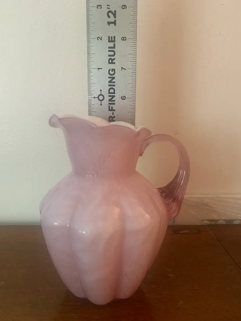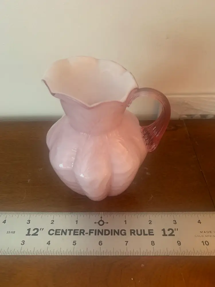 This is a vintage cased art glass Fenton pitcher. It is white on the inside and pink on the outside. There are no chips or cracks and the Fenton logo is a very light impression on the bottom. There is a rough edge on the top right of the handle where it attaches to the pitcher, this appears to be a flaw from when it was made. It measures about 5 1/4 inches tall and 4 1/4 inches wide.
