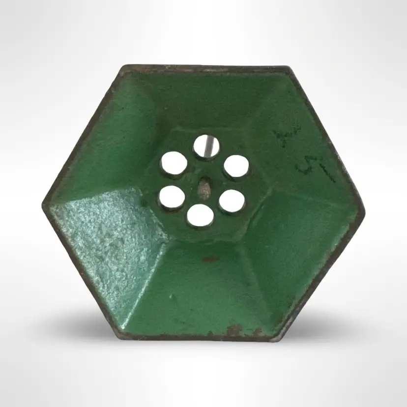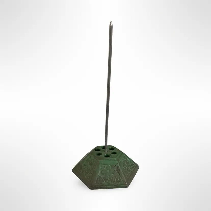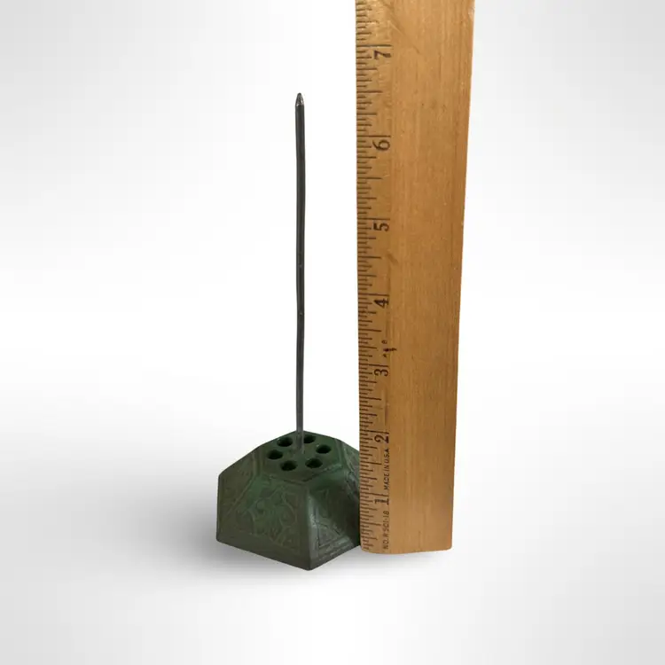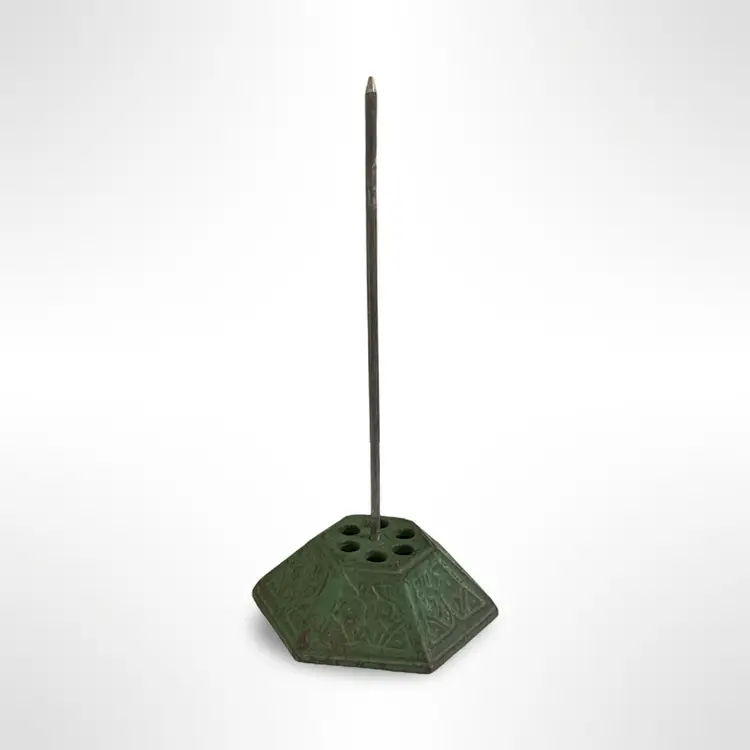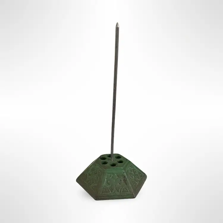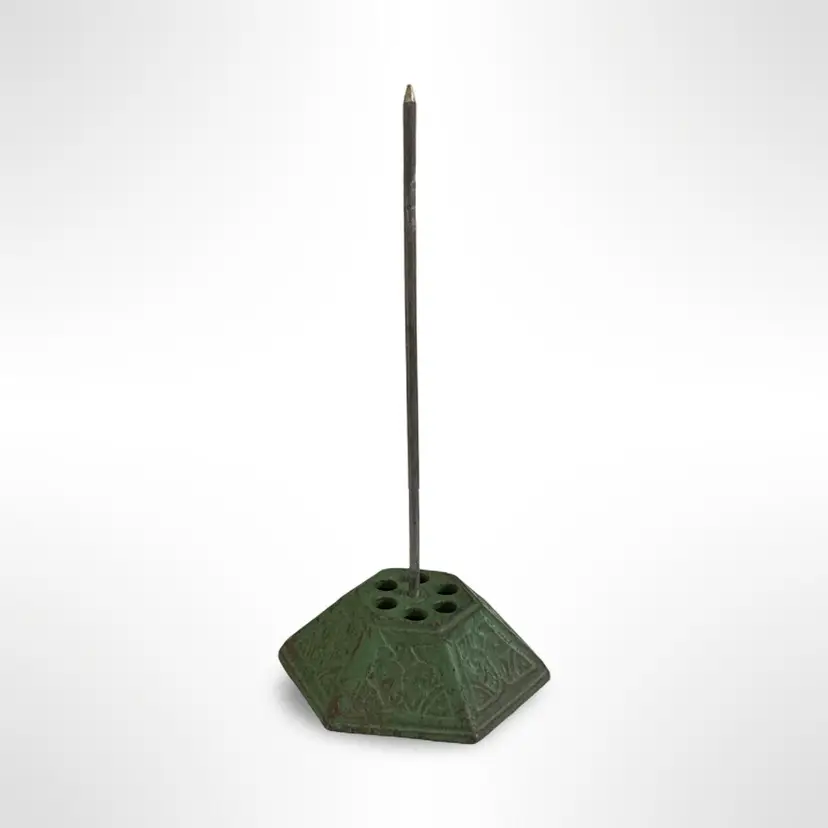 Vintage cast iron receipt spike with an art deco design on the green hexagon base. Great patina! Measures approximately 3.25” W x 6.5” H