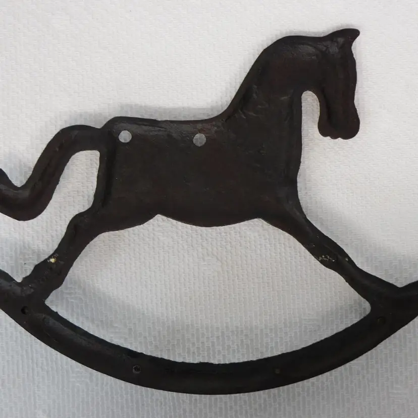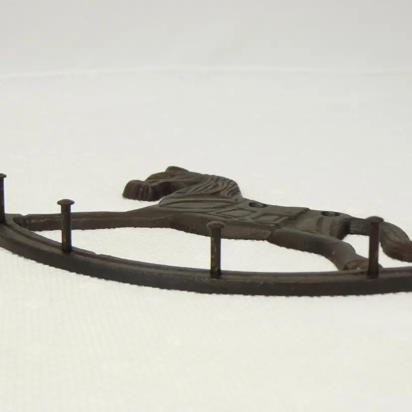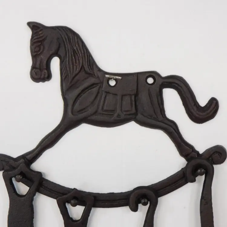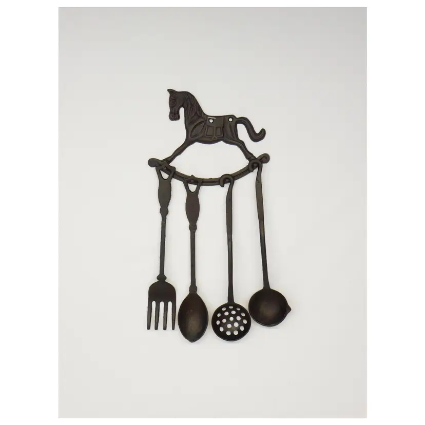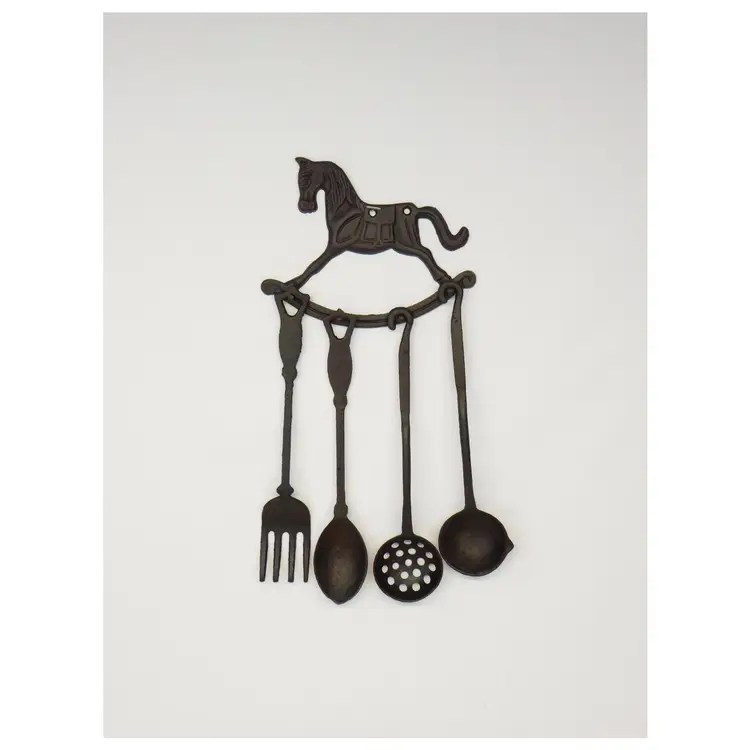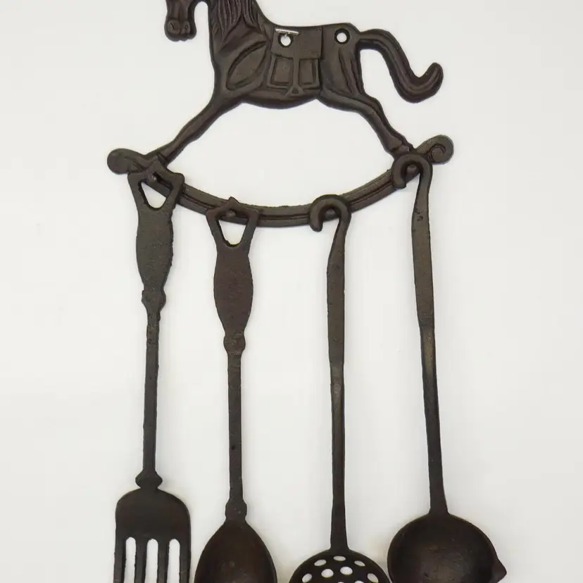 Black Cast Iron Decorative Early American Hanging Kitchen Utensils. Hanging Rocking Horse Rack is 8" wide x 6" tall with 4 nail head hangers to hold the utensils - Fork - Spoon - Ladle - Straining Ladle Utensils are 11" long. In very good pre-owned vintage condition.