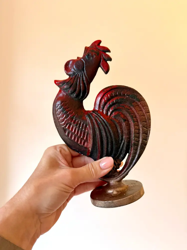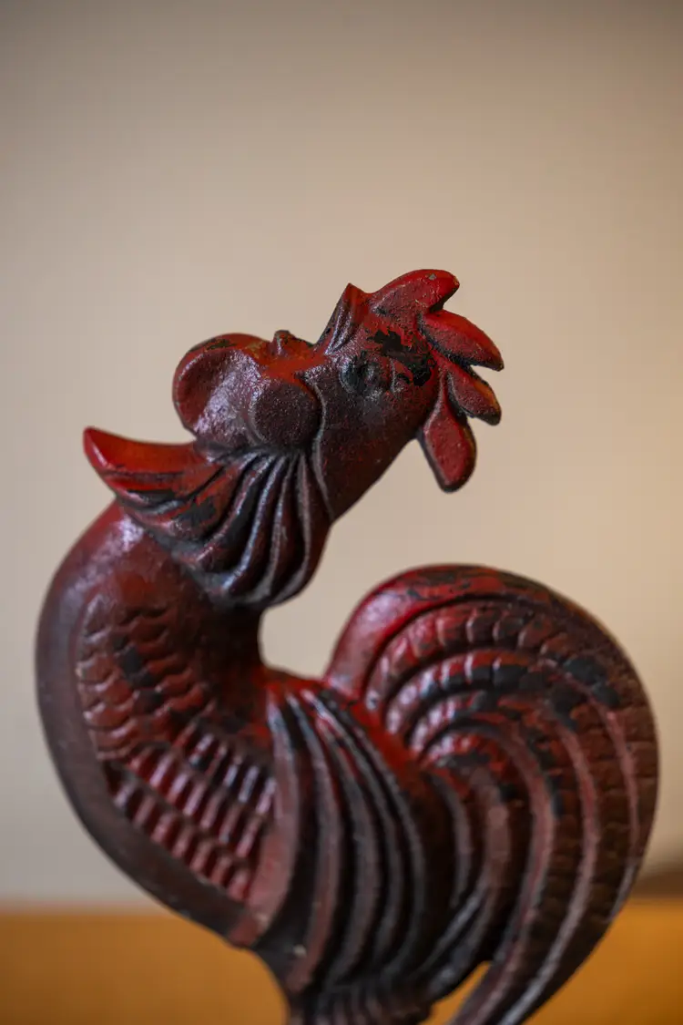 Solid vintage cast iron rooster with its original red-and-black painted finish. Measures 8" tall and weighs just over 1¼ lbs. The paint shows light chipping and age-appropriate patina that adds to its farmhouse charm. Smooth underside, no maker’s mark. Likely made mid-20th century in the U.S. or Japan.