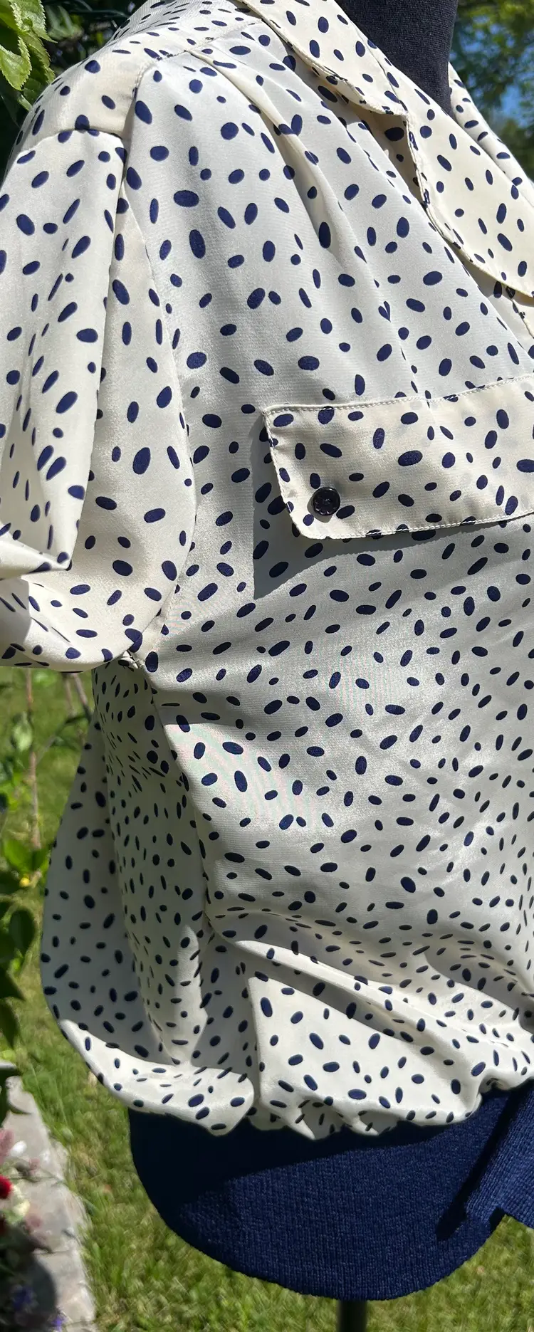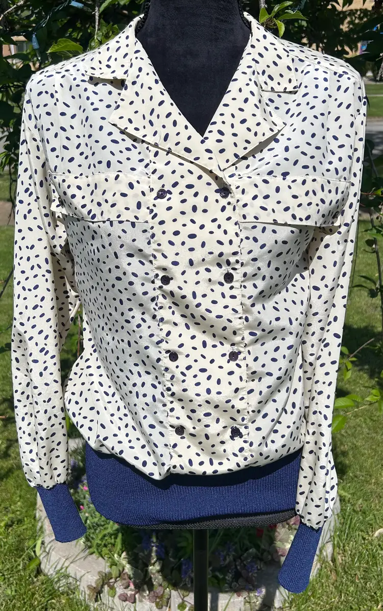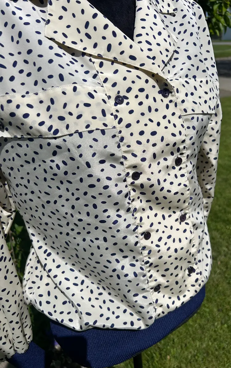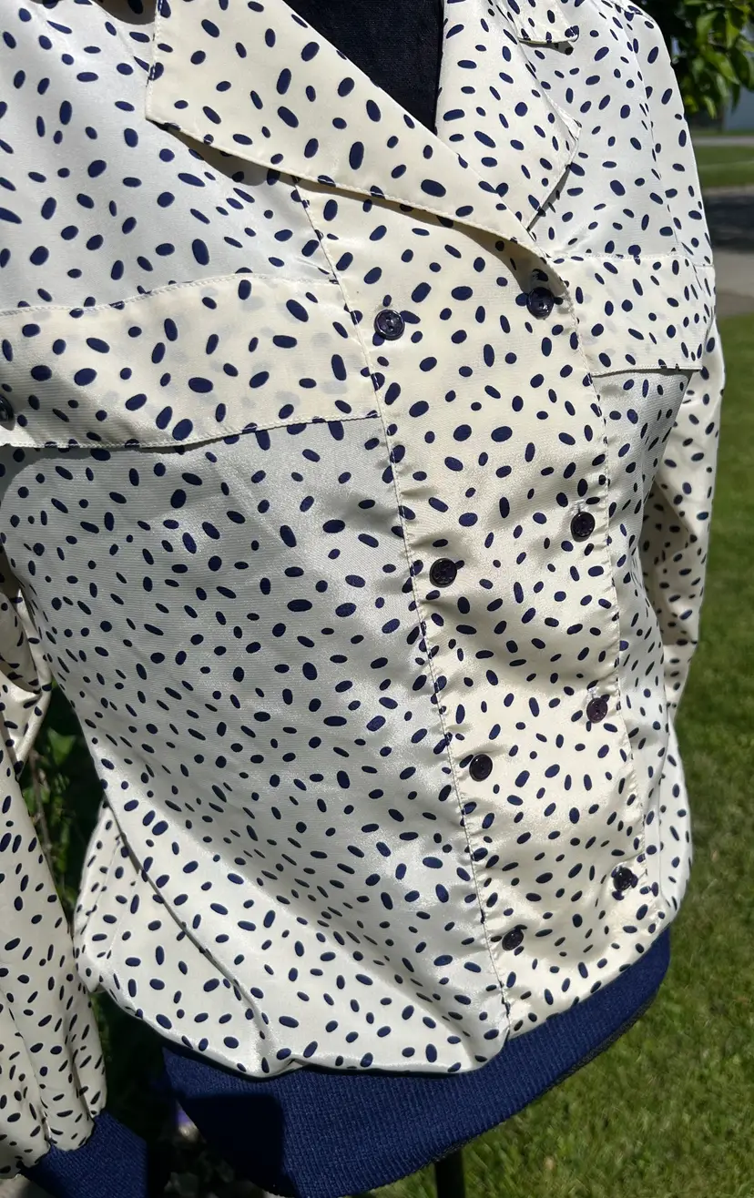Brand/Maker- Camille Claudel Size- Marked 10 Please see measurements below - would be approx a modern Large Color- Beige/Off White. Navy Blue Condition description- No rips, stains or tears. All buttons intact. Bottom hem and sleeve ends are stretchy. Fabric- Polyester Made - USA