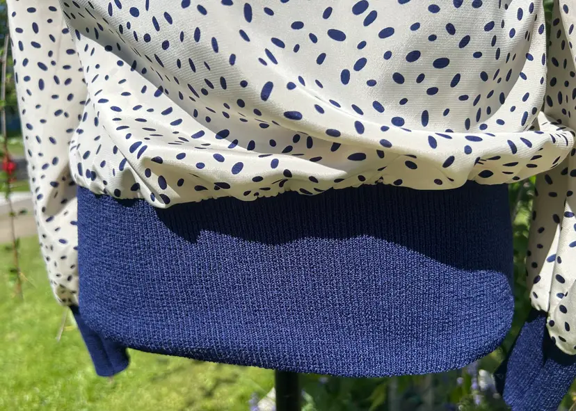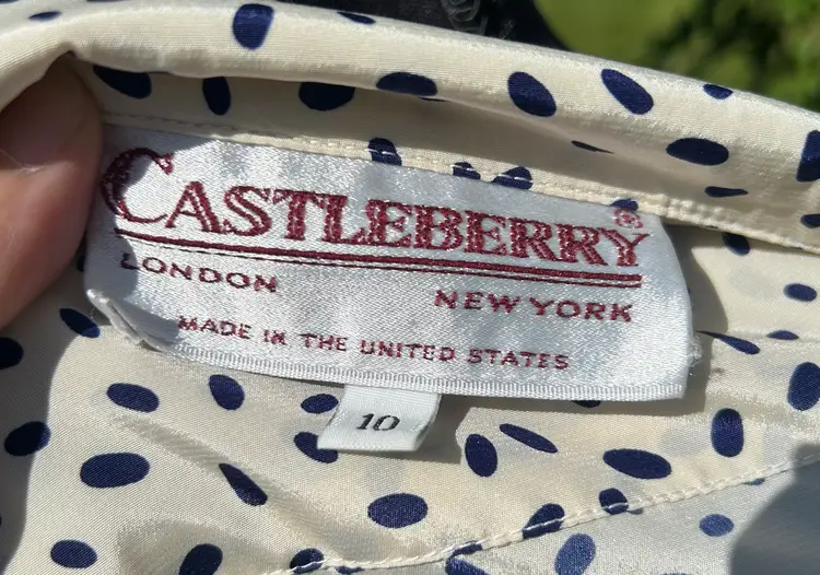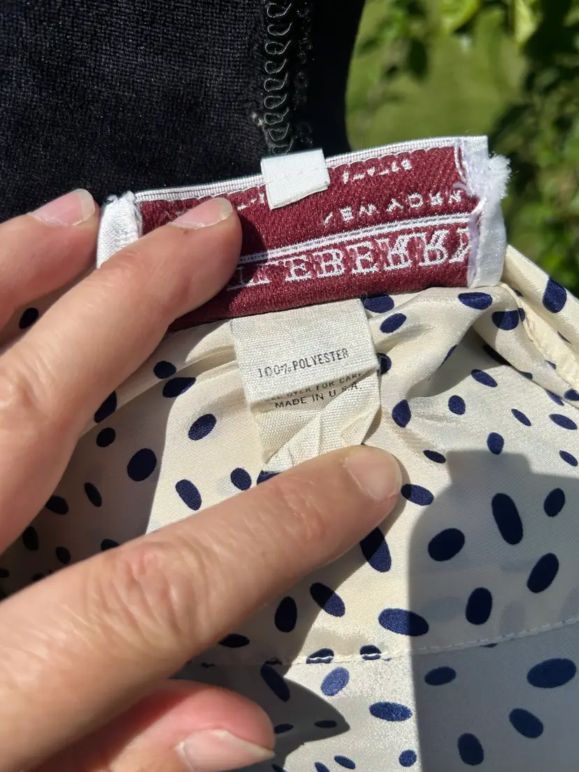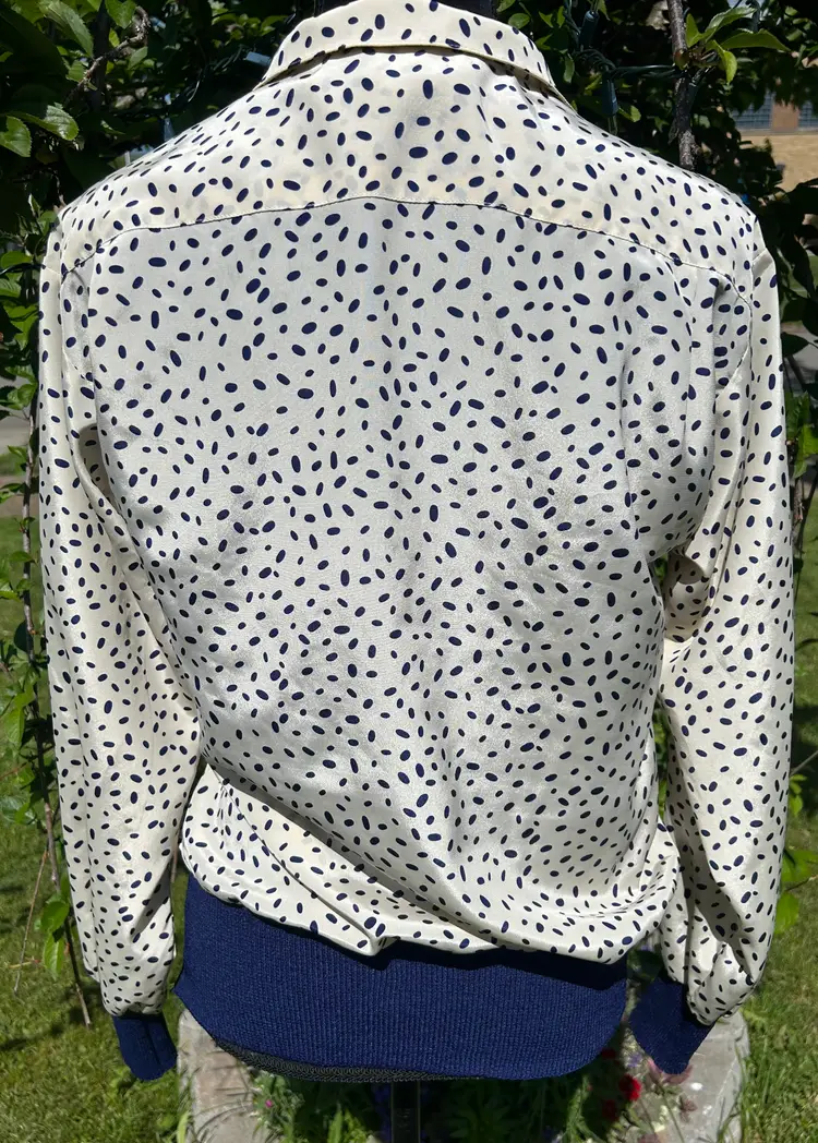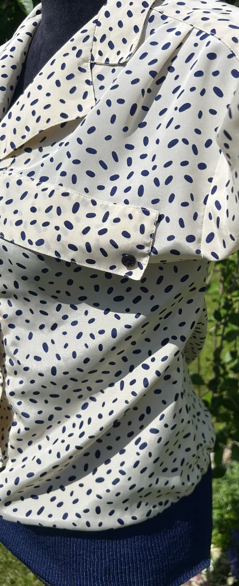 Brand/Maker- Camille Claudel Size- Marked 10 Please see measurements below - would be approx a modern Large Color- Beige/Off White. Navy Blue Condition description- No rips, stains or tears. All buttons intact. Bottom hem and sleeve ends are stretchy. Fabric- Polyester Made - USA
