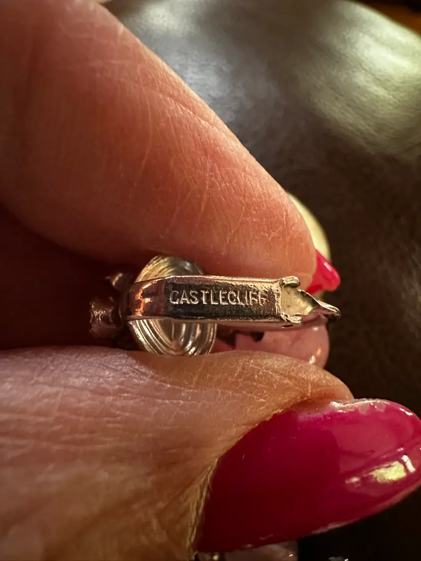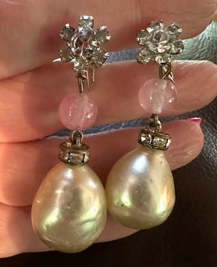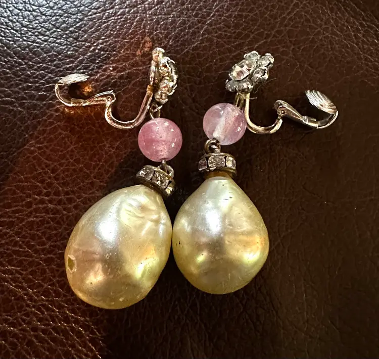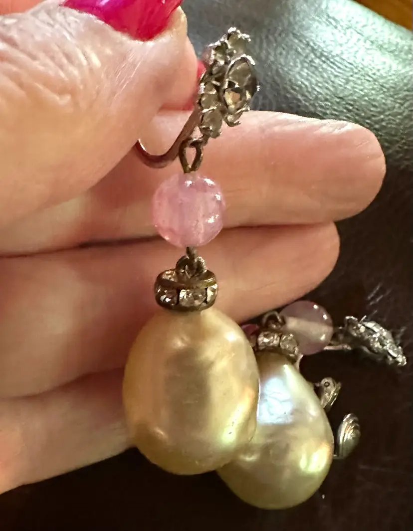 Very pretty vintage Castlecliff dangle clip on earrings. They have baroque pearls , pink glass beads and rhinestones. They are 1.75”. They are in good condition.