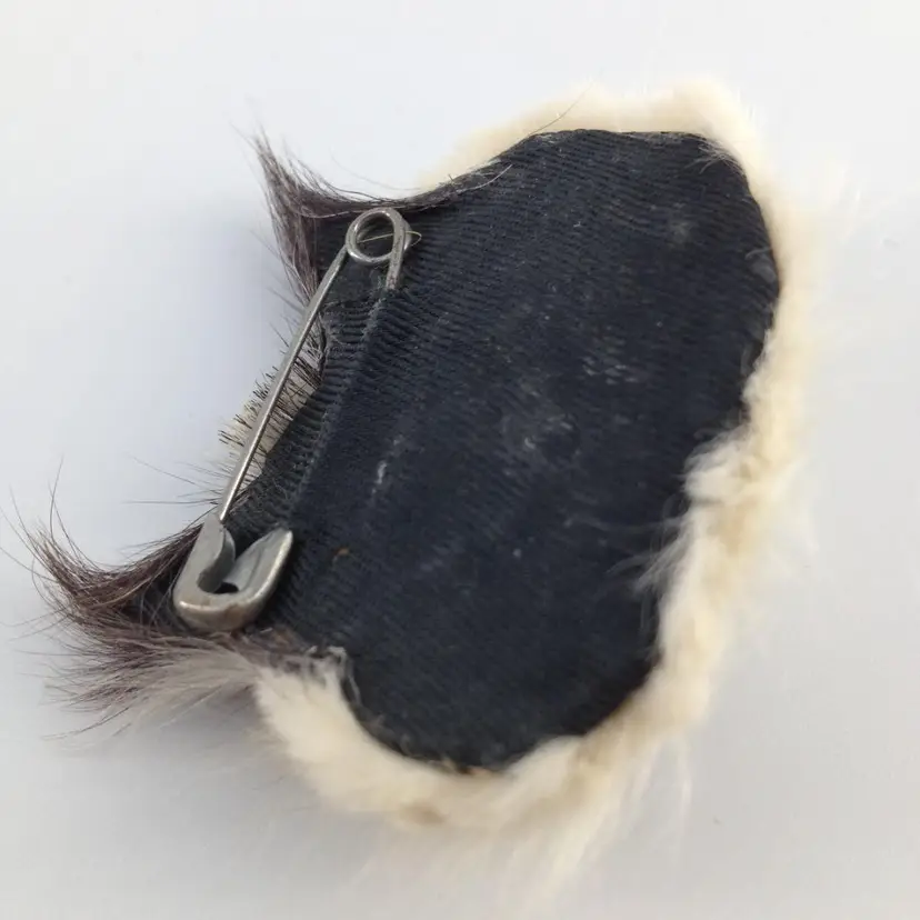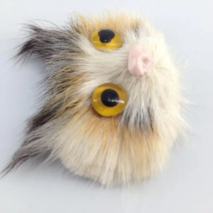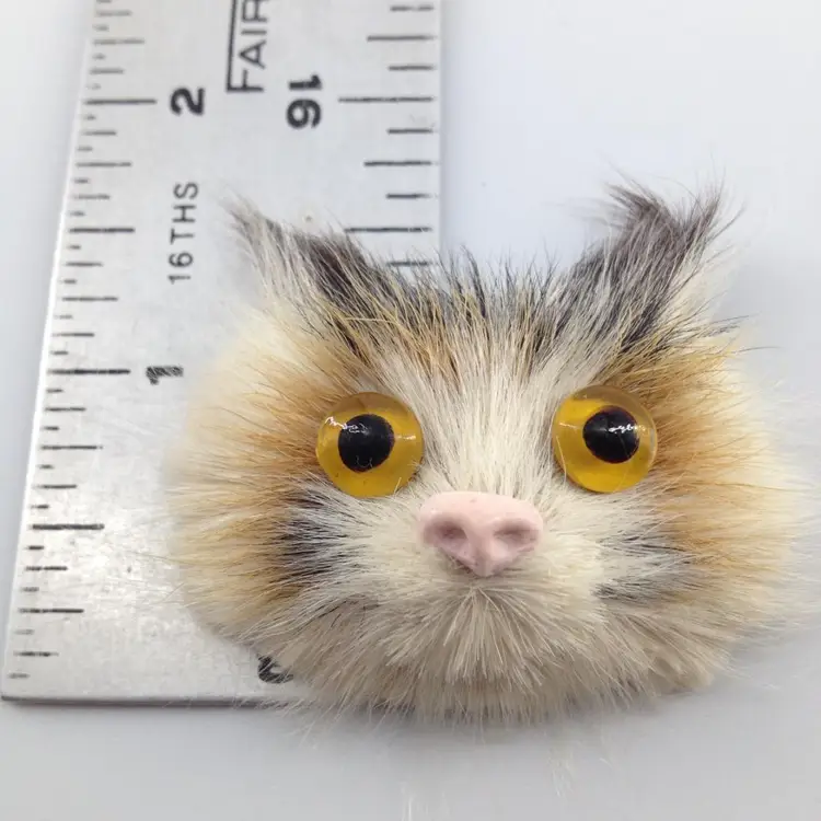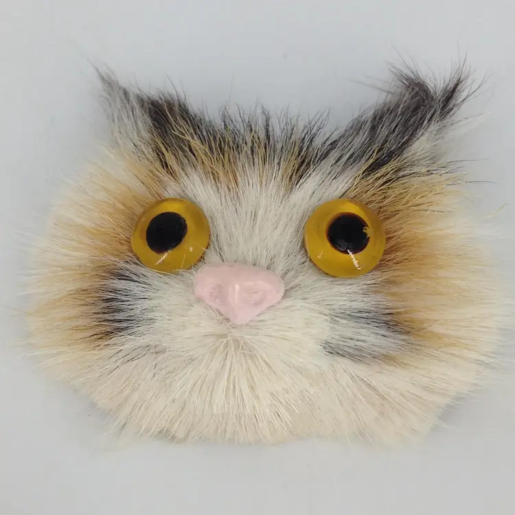 Vintage cat face brooch. Done in black orange and white fur with yellow domed eyes and pink plastic nose. 1.75 x 1.5 inch.