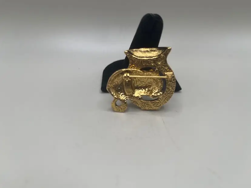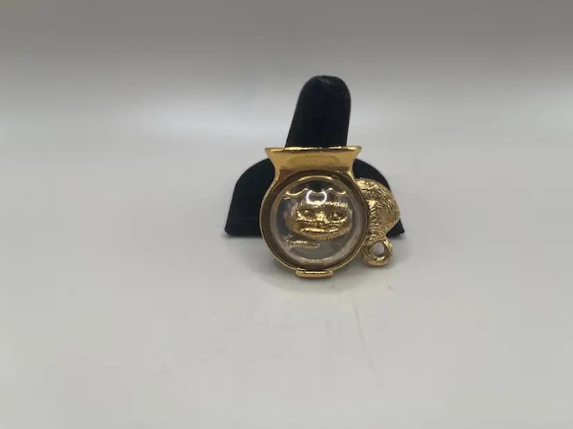 This charming brooch features a curious kitty peering intently at the two fish in their lucite bowl. Measures 1.5 inches tall and across