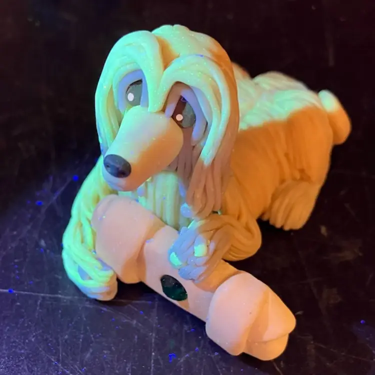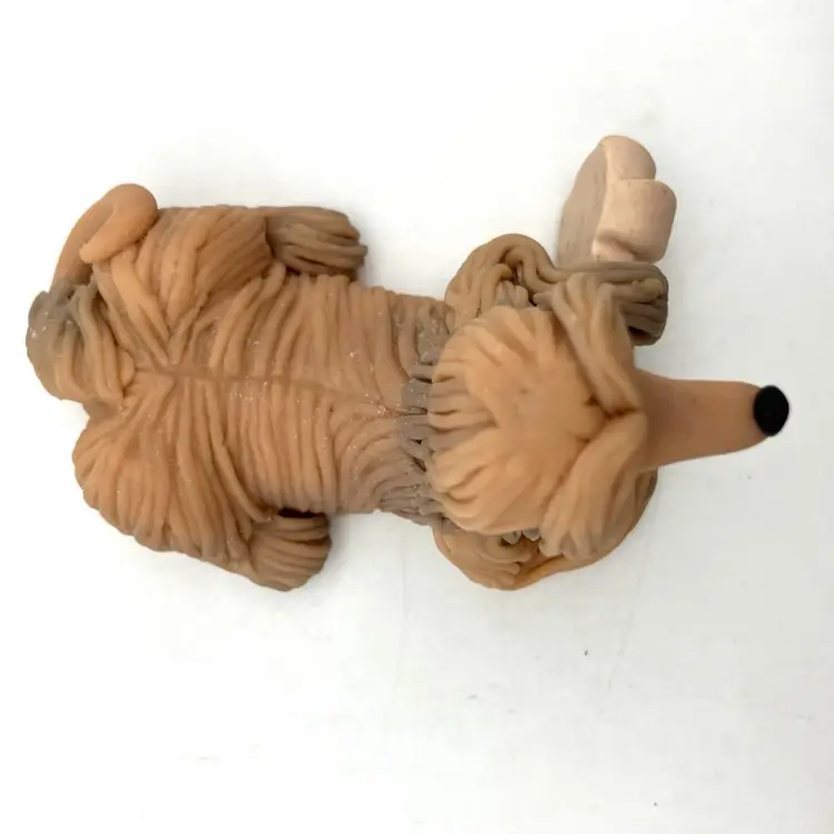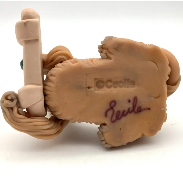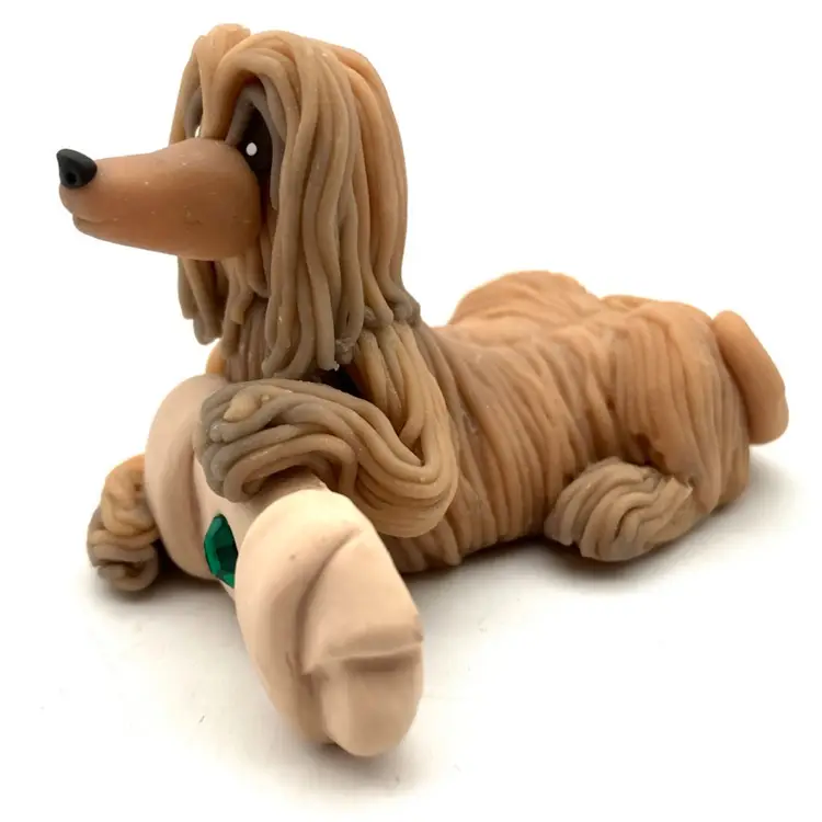 Adorable Afghan figurine by polymer clay artist Cecile Baird. Measures 3” long by just over 2” wide and 2” tall. Excellent condition. Little green rhinestone in center of bone. Note, one of the clay floors is UV reactive from tan to a chartreuse tone.