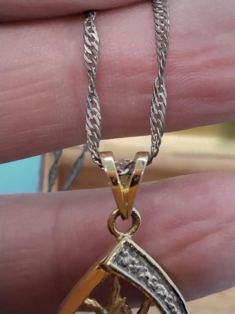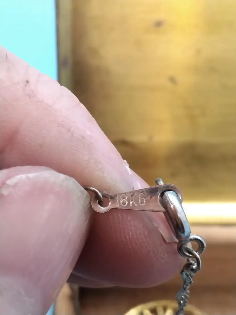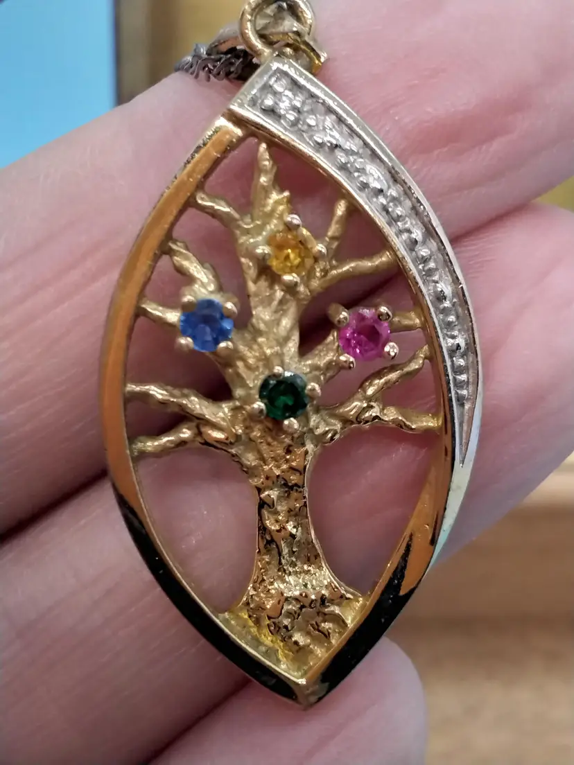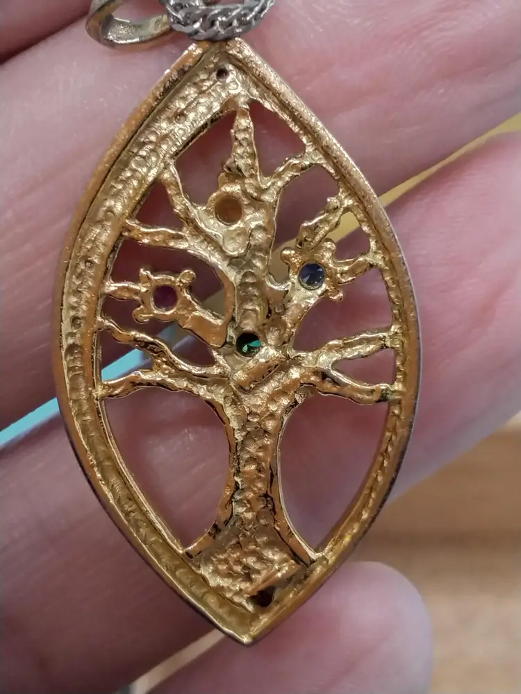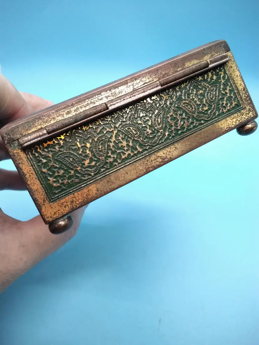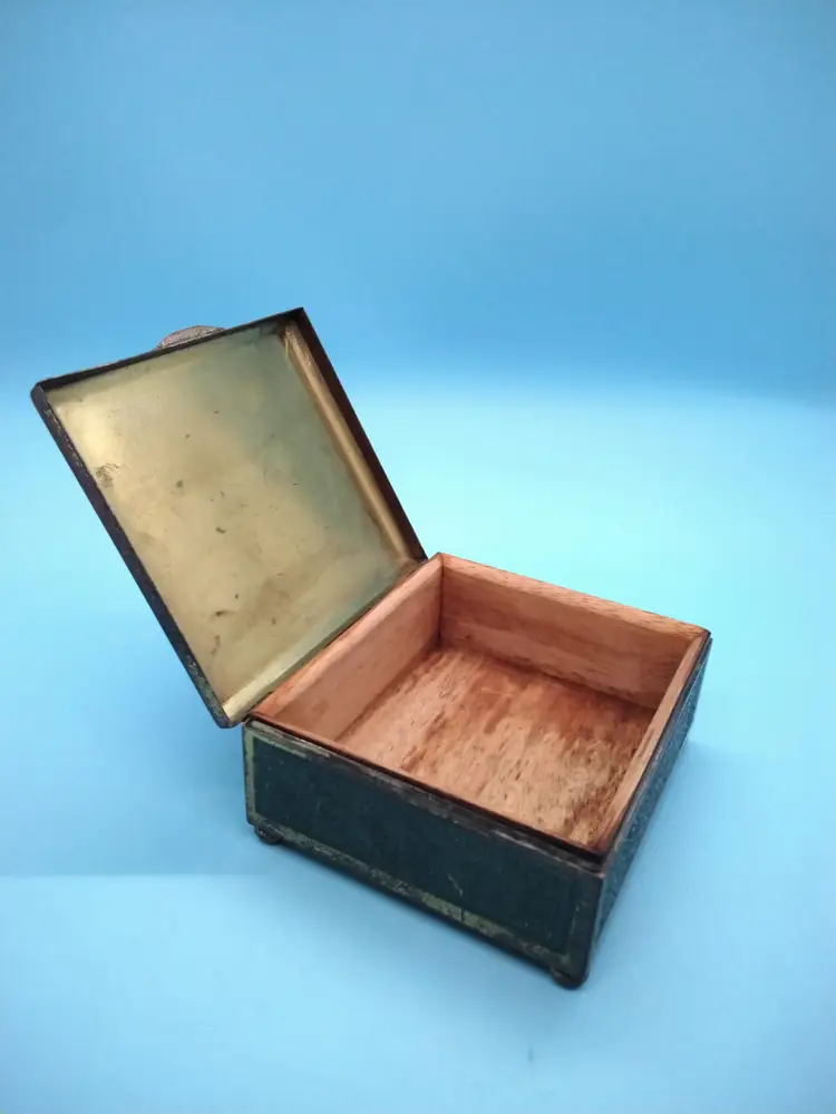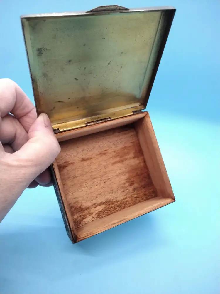 This vintage cedar lined brass box features intricate designs on all sides with a beautifully aged patina. Perfect for storing small keepsakes or as a decorative piece. It shows signs of wear consistent with its age, adding to its charm. Inside a sweet treasure of an 18KG chain and family tree with 4 stones pendant.