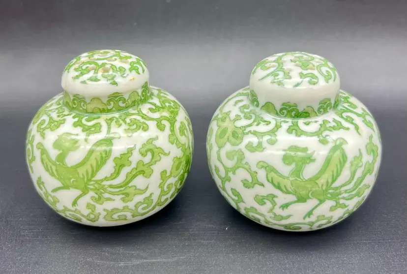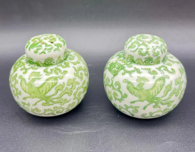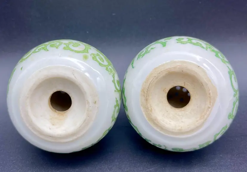 Ginger Jar shaped shakers. Original corks inside shakers. Good pre-owned condition. No chips, cracks or blemishes. Some signs of mild crazing. No markings or signatures. Dimensions: 2.5"W x 2"T