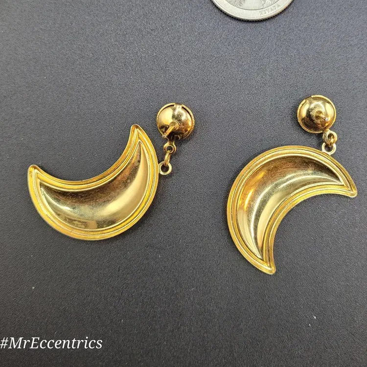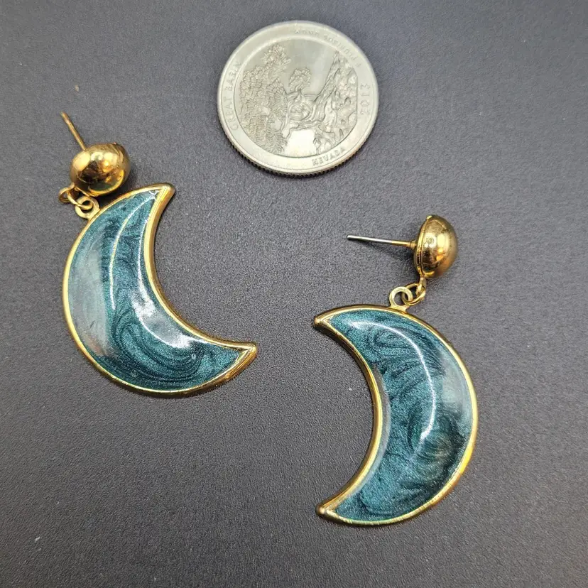 Add a touch of cosmic charm to your look with these vintage crescent moon earrings. Featuring a swirling blue-green design set in gold-tone metal, they're perfect for any celestial enthusiast. Each earring measures approximately 1.5 inches. 💝 All items are packaged with care to ensure safe delivery. #nosadmail ✴️ Follow my Facebook page & IG for more curated vintage treasures! ⚡️ #MrEccentrics #vintagecurator #celestialjewelry