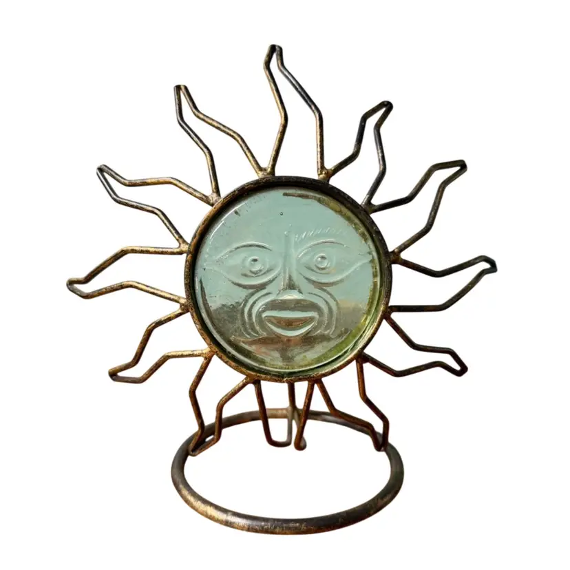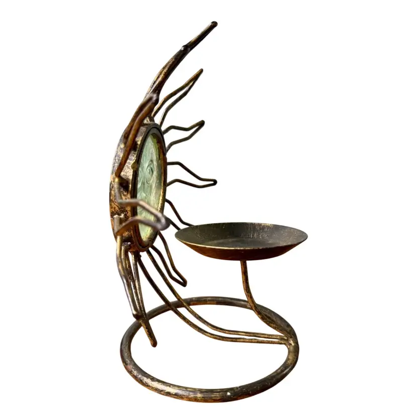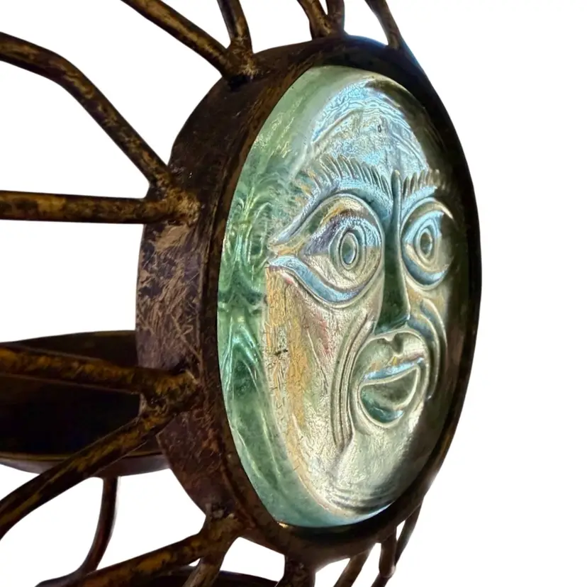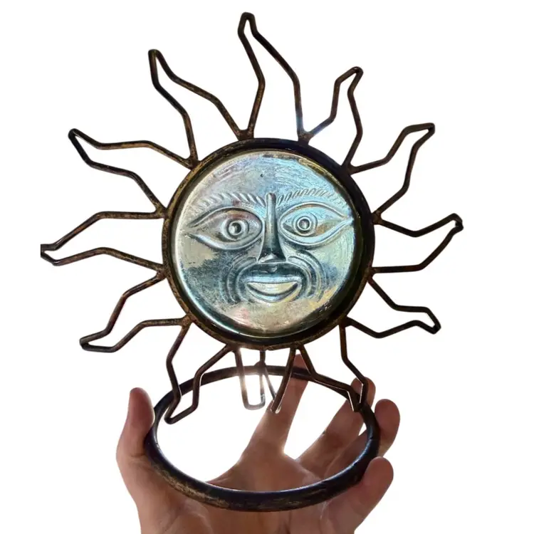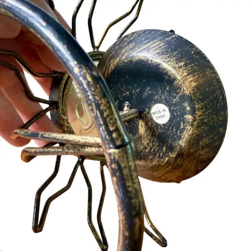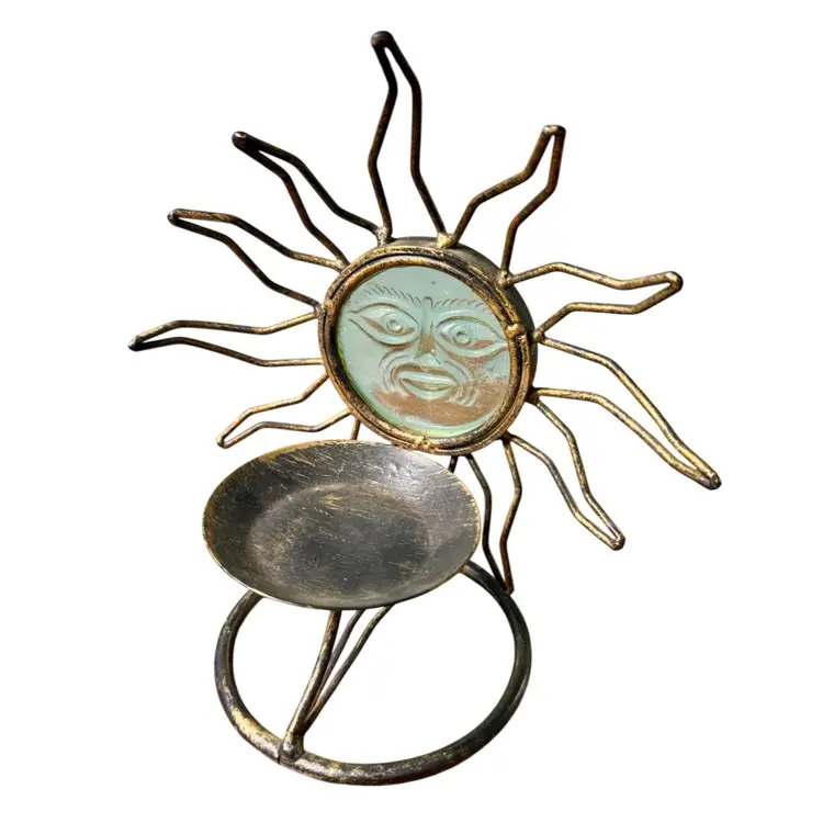 8"x8.25"x5". Awesome tea light candle holder to add to your whimsical celestial collection! Made from metal (wrought iron) with a glass face insert to allow the candle’s glow to shine through. Metal is painted with a black and gold finish. Has a made in china sticker on the bottom.