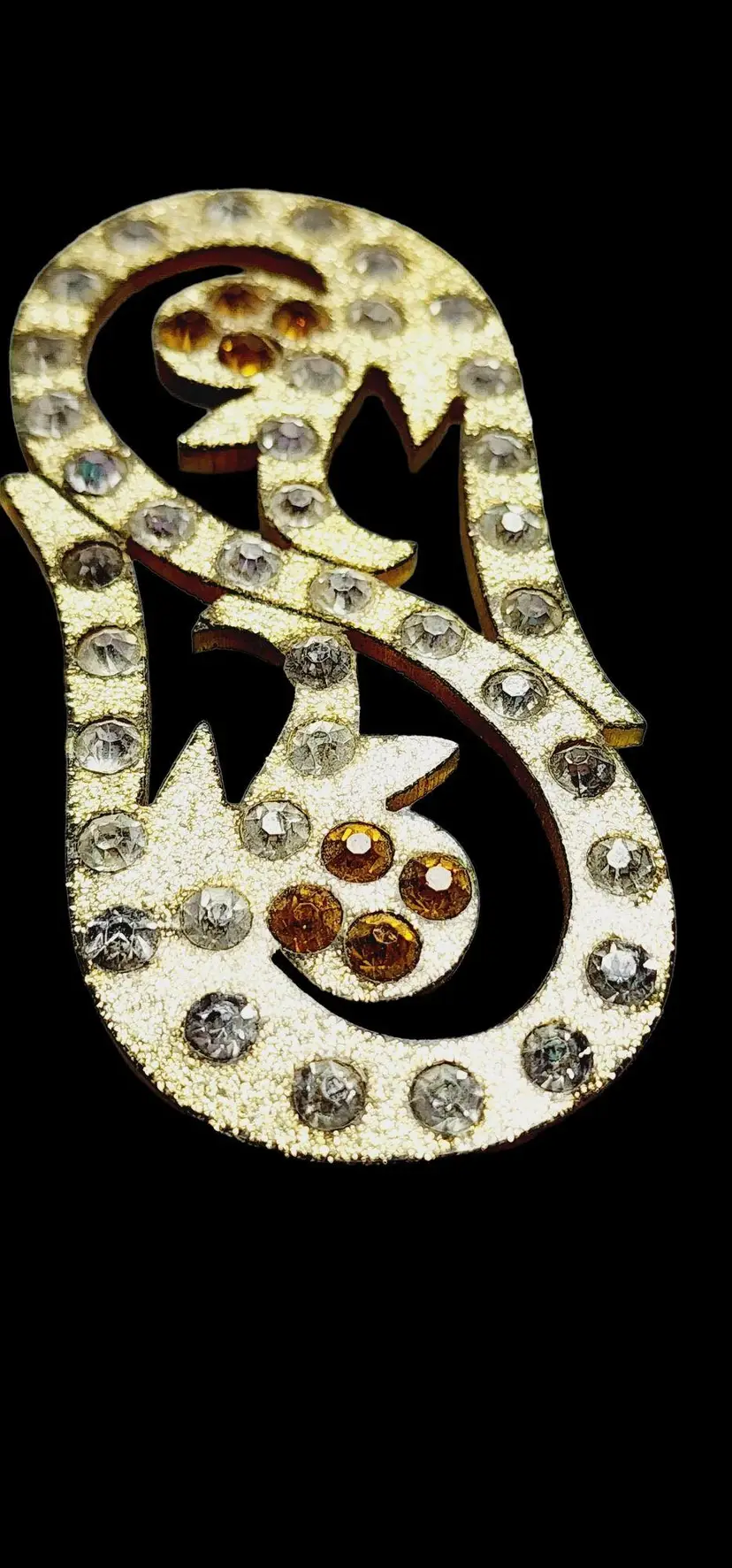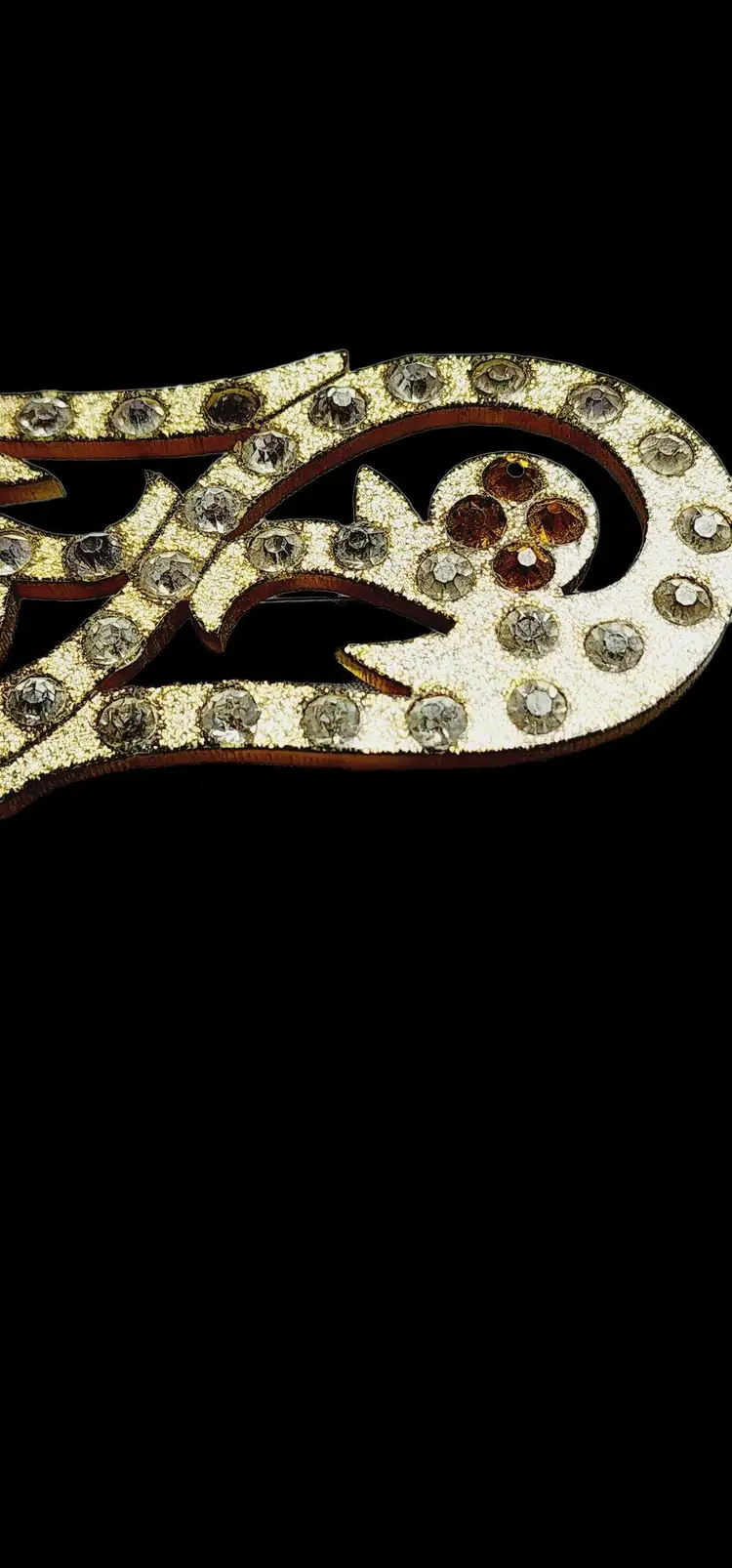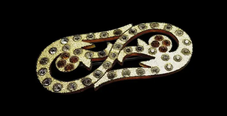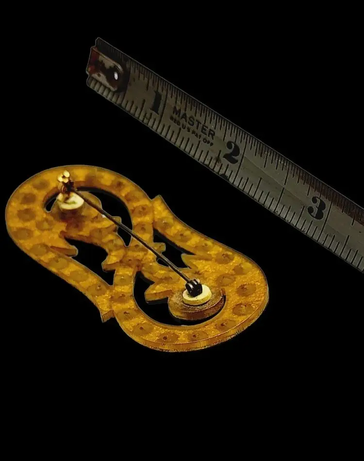 Vintage brooch in celluloid with sparkly glitter and rhinestones. A couple might have been replaced and two of the stones have darkened. Clasp works well.