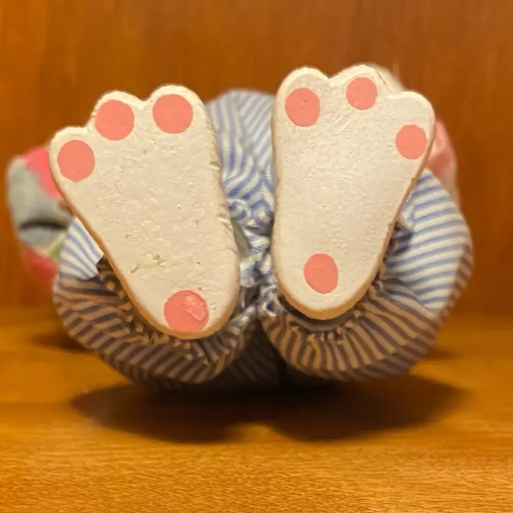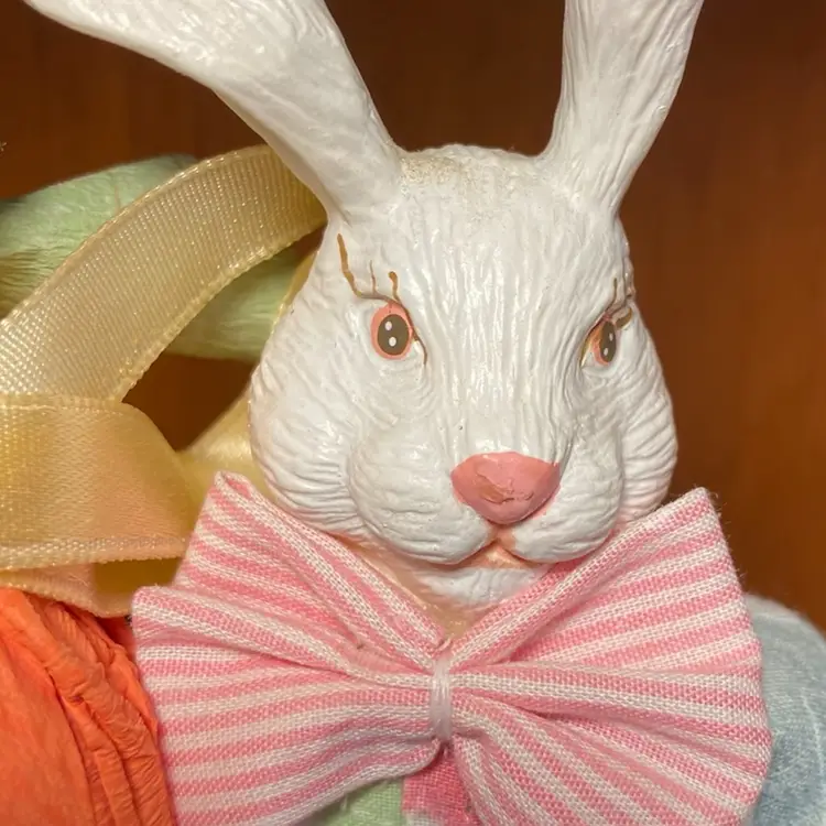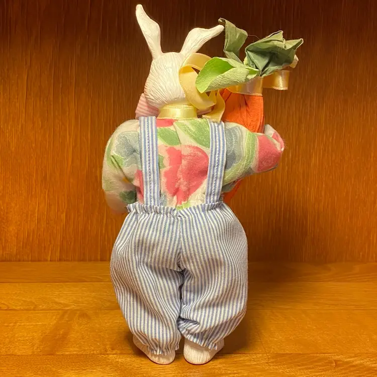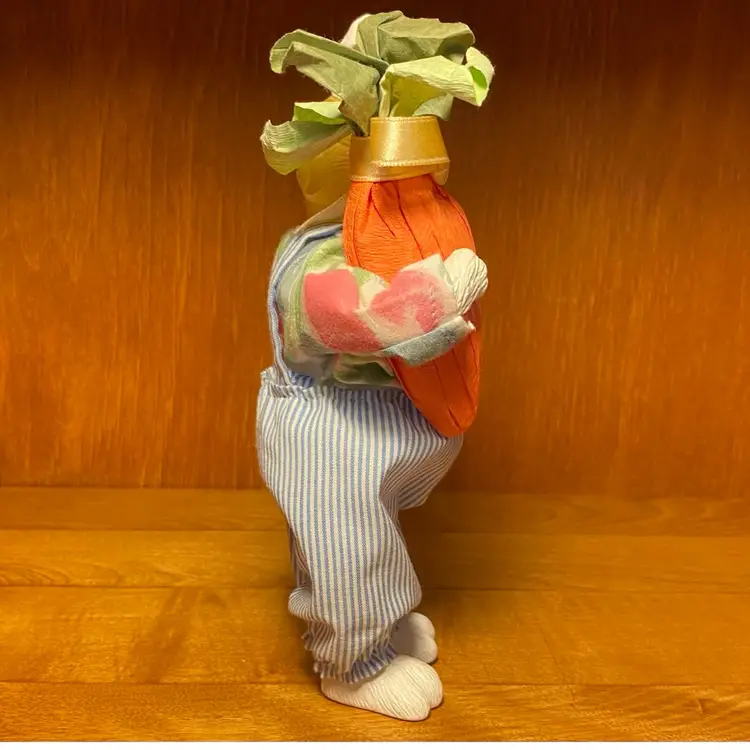 Adorable vintage hard celluloid plastic bunny rabbit dressed in blue and white striped bib overalls with a floral shirt and red and white striped bow tie and he's carrying a carrot.