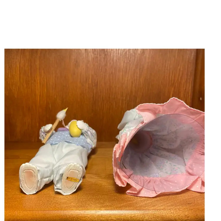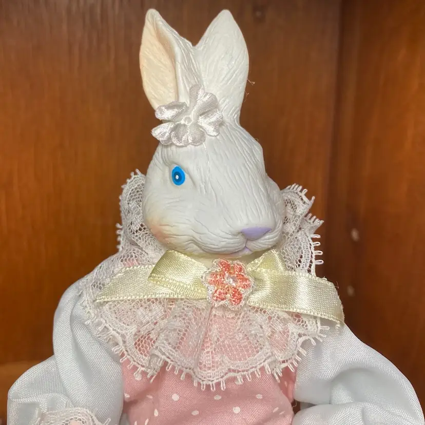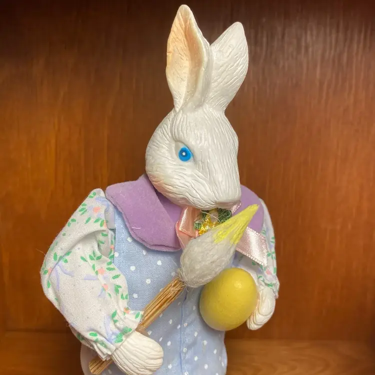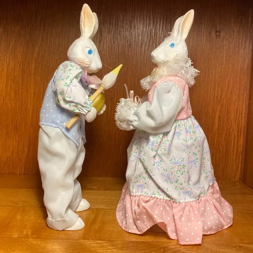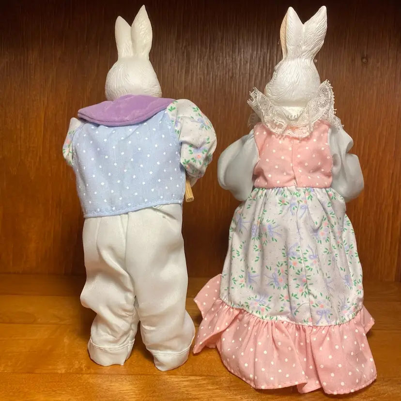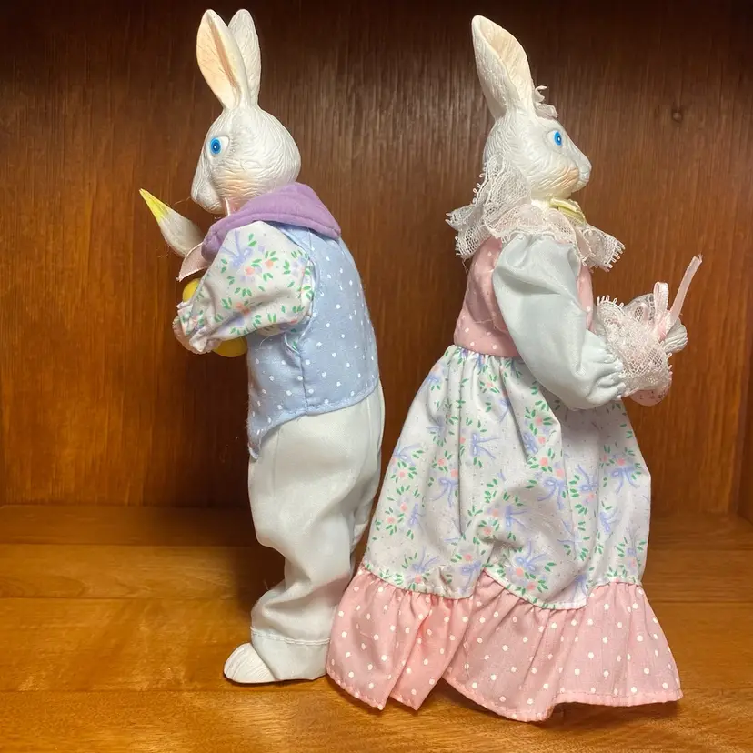 Adorable vintage hard celluloid plastic Mr. And Mrs. Bunny rabbit dressed in colorful Easter outfits.