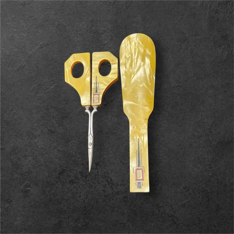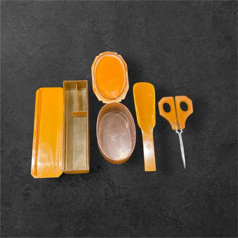 In excellent vintage condition, this 4-pc amber celluloid dresser vanity set has two covered containers, a shoe horn and manicure scissors. Circa 1930s, it is monogrammed with the letter “D” and reflects the sleek geometric lines of the Art Deco time period.