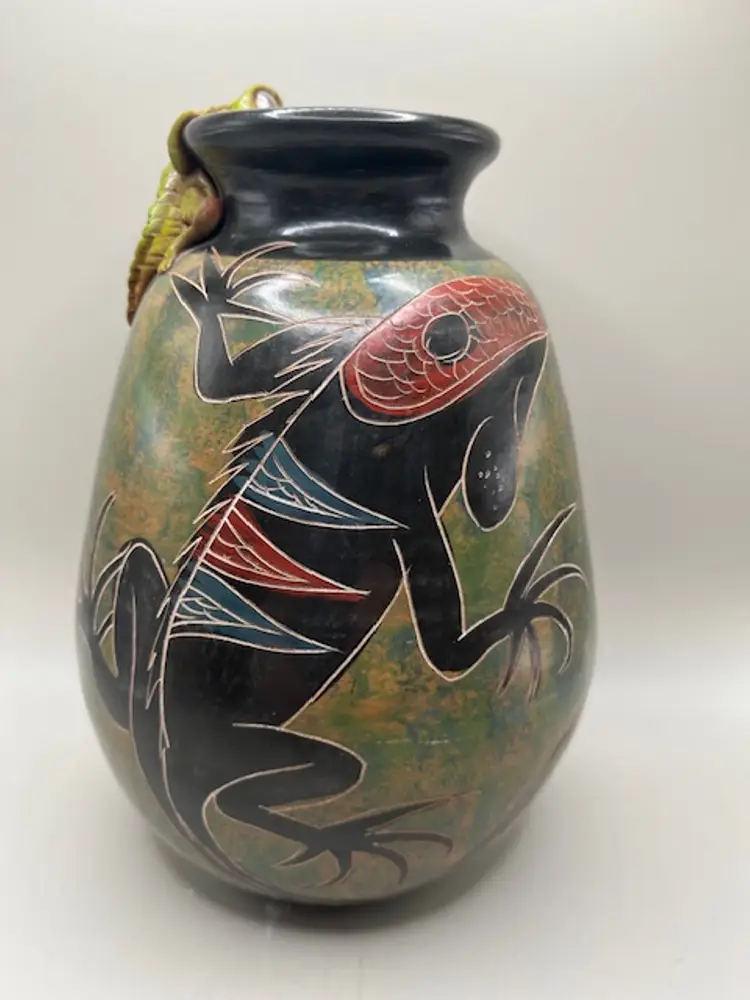 This decorative clay vase is noted for its unique design, featuring iguanas, often hand carved and/or painted. Measures 7.5 inches tall.