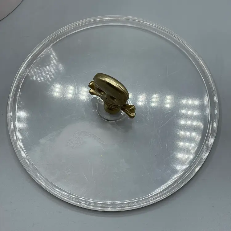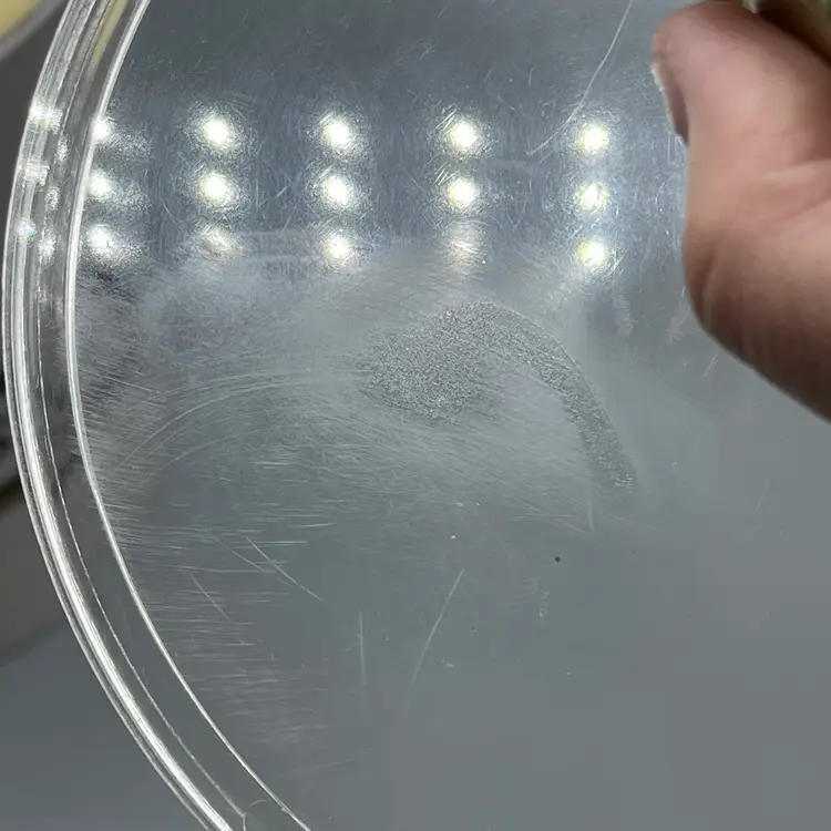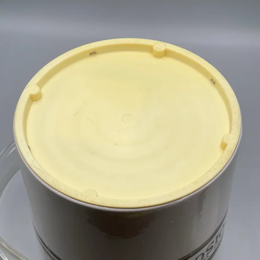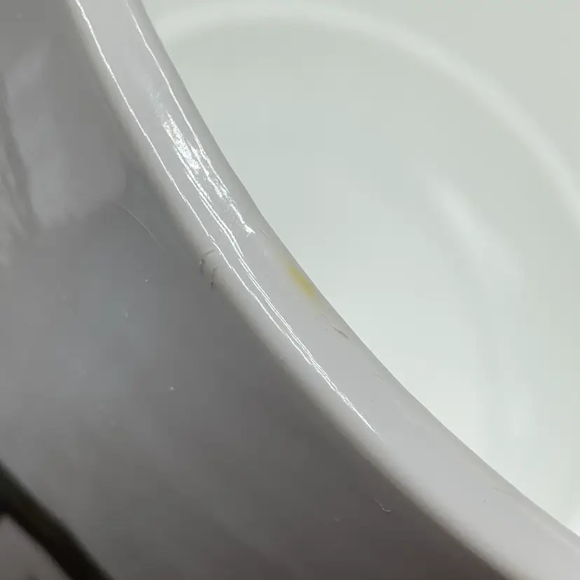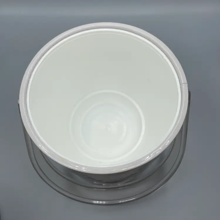 Some very minor staining. Some minor cracks on handle. A small scrap on the top edge of the bucket. Some scratches and a scrub mark/damage on the clear lid.