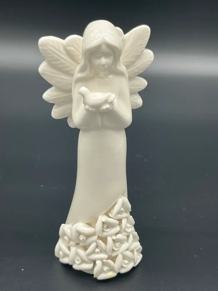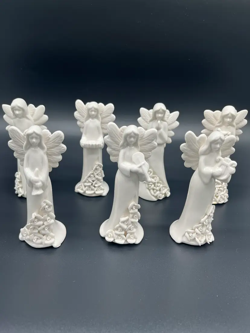 Create a heavenly holiday display with this set of 7 vintage ceramic angel figurines, each uniquely styled with instrument or symbolic item. Standing 5" tall, these angels feature delicate wings, flowing robes and floral base detailing. Their serene expressions and varied poses evoke a peaceful, nostalgic charm - perfect for mantel styling, nativity scenes or vintage Christmas vignettes.
