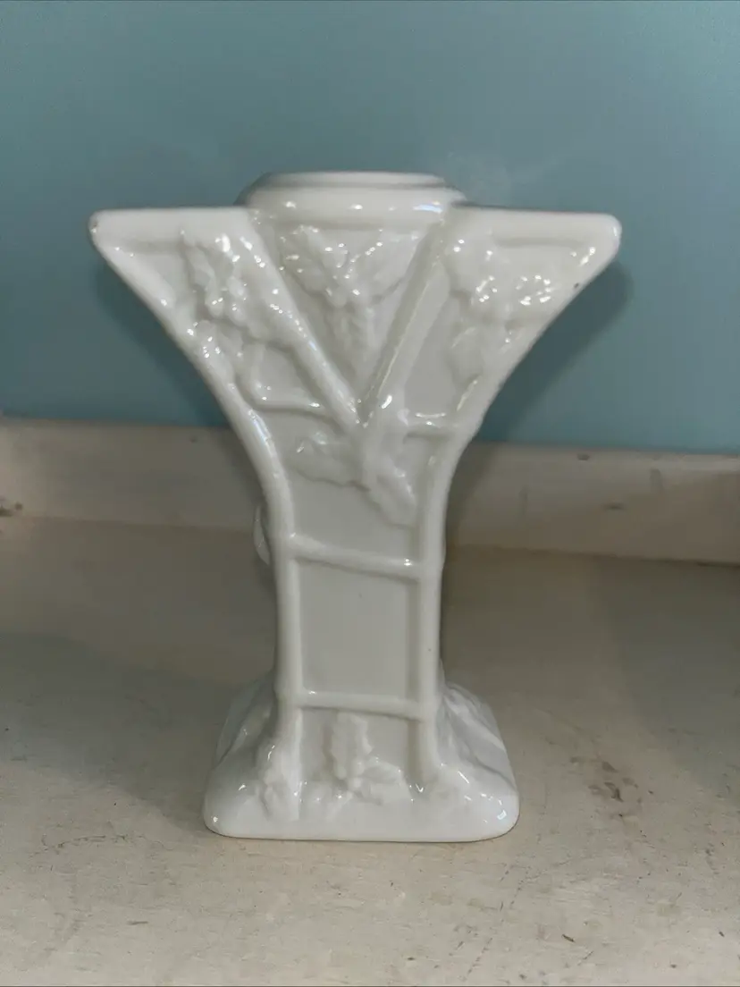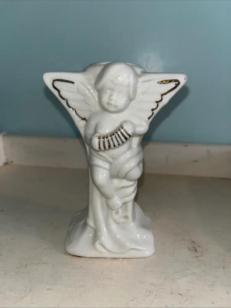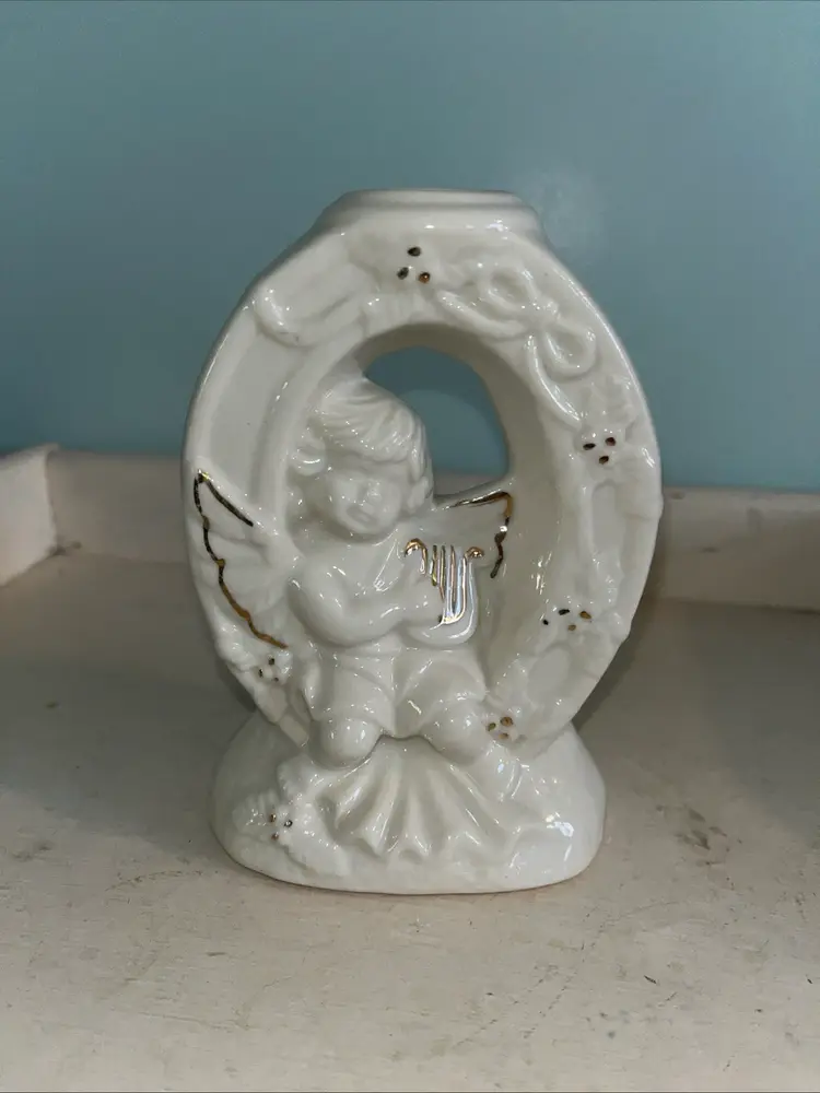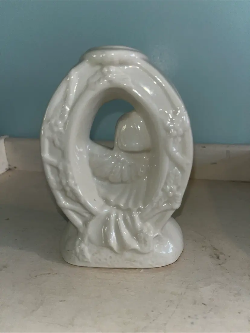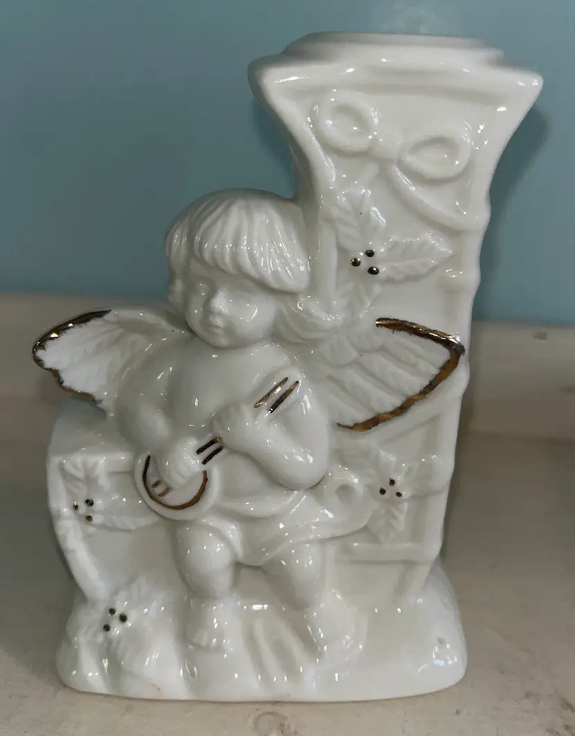 Vintage three-piece set of ceramic Christmas "JOY" angel taper candle holders - ivory colored with gold paint accents. Approximately 5" tall. The "J" is about 3.5" long and 2" wide. Made in China. Pre-owned and in good, vintage condition. Expect normal wear such as scuffs or scratches. There is some discoloration on the bottom of 2. See photos and ask any questions prior to purchase. Thank you for your interest in this item. I try my best to accurately describe each item that I list for sale including any known defects. All items are sold AS IS. What you see in the photos is exactly what you get, nothing more, nothing less. If an item is not specifically listed as new then it is in pre-owned, used condition and wear should be expected. I do not accept returns so please take your time to review the item description, condition description and photos.