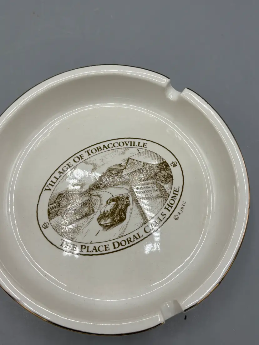 This charming ceramic ashtray captures the nostalgic appeal of Tobaccoville's heritage with authentic vintage character. The piece showcases delicate gold detailing with natural patina from age, lending genuine period authenticity. Compact dimensions of 4½" × 3" × 1" make it an ideal accent for collectors or display shelves. A distinctive collectible that honors mid-century Americana craftsmanship.